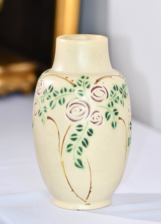 Roseville Beige Rose Vase, Vintage Velmoss Floral Vase, 8"