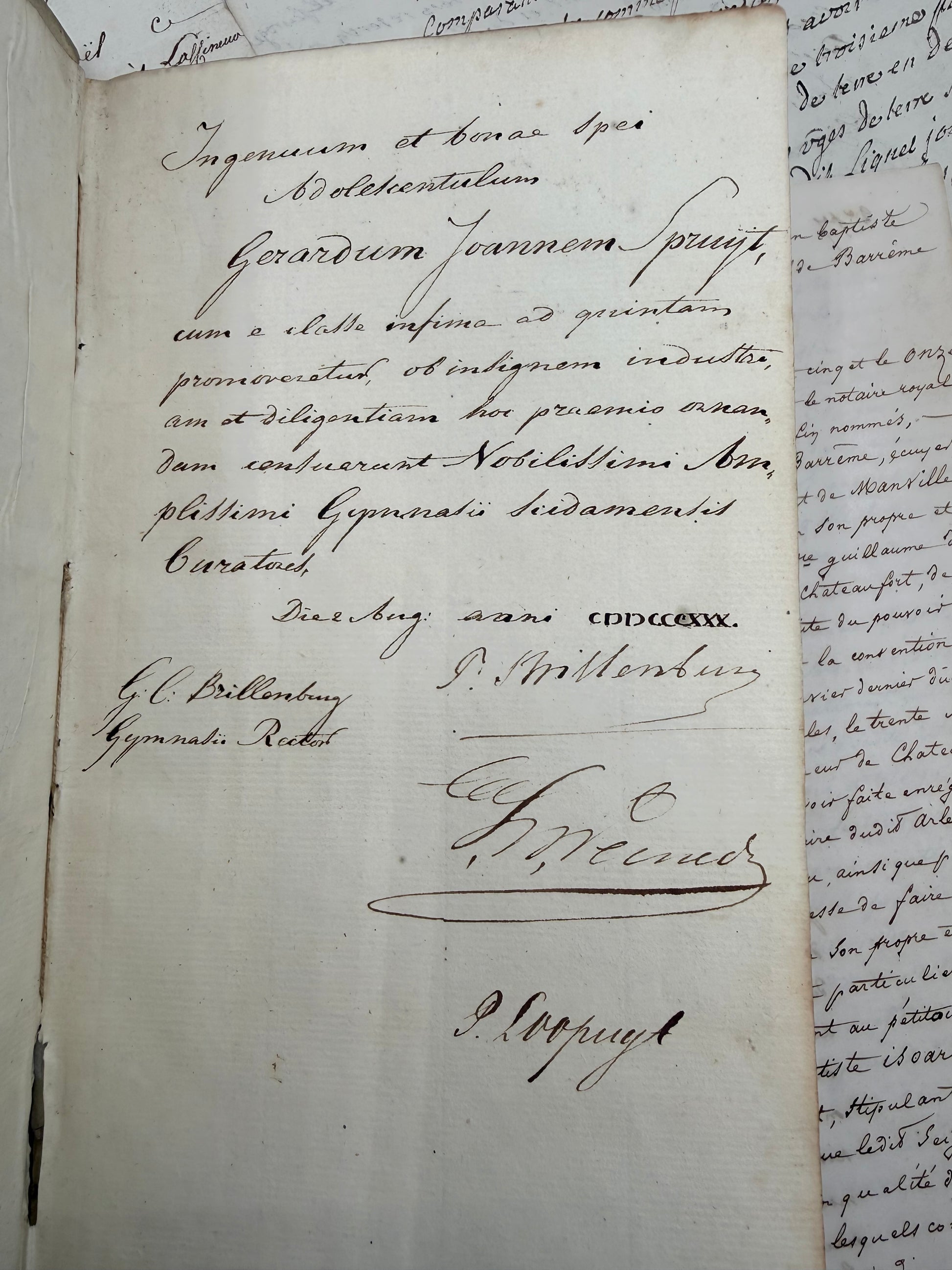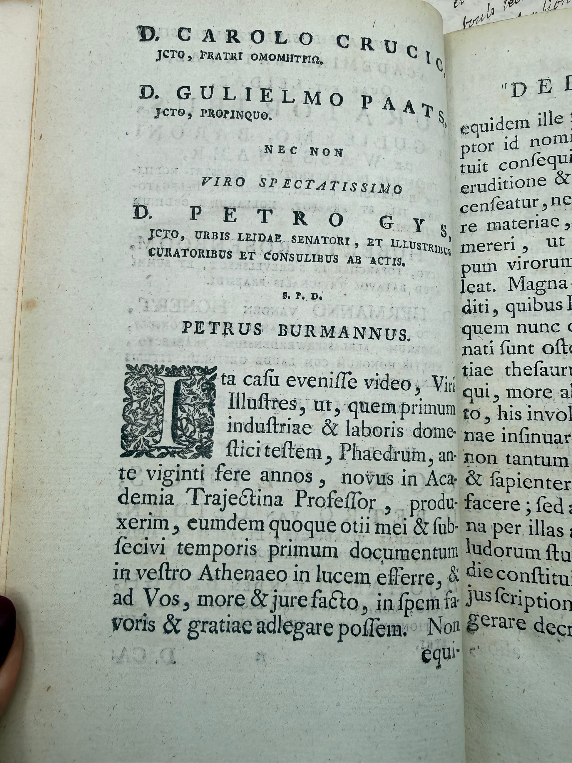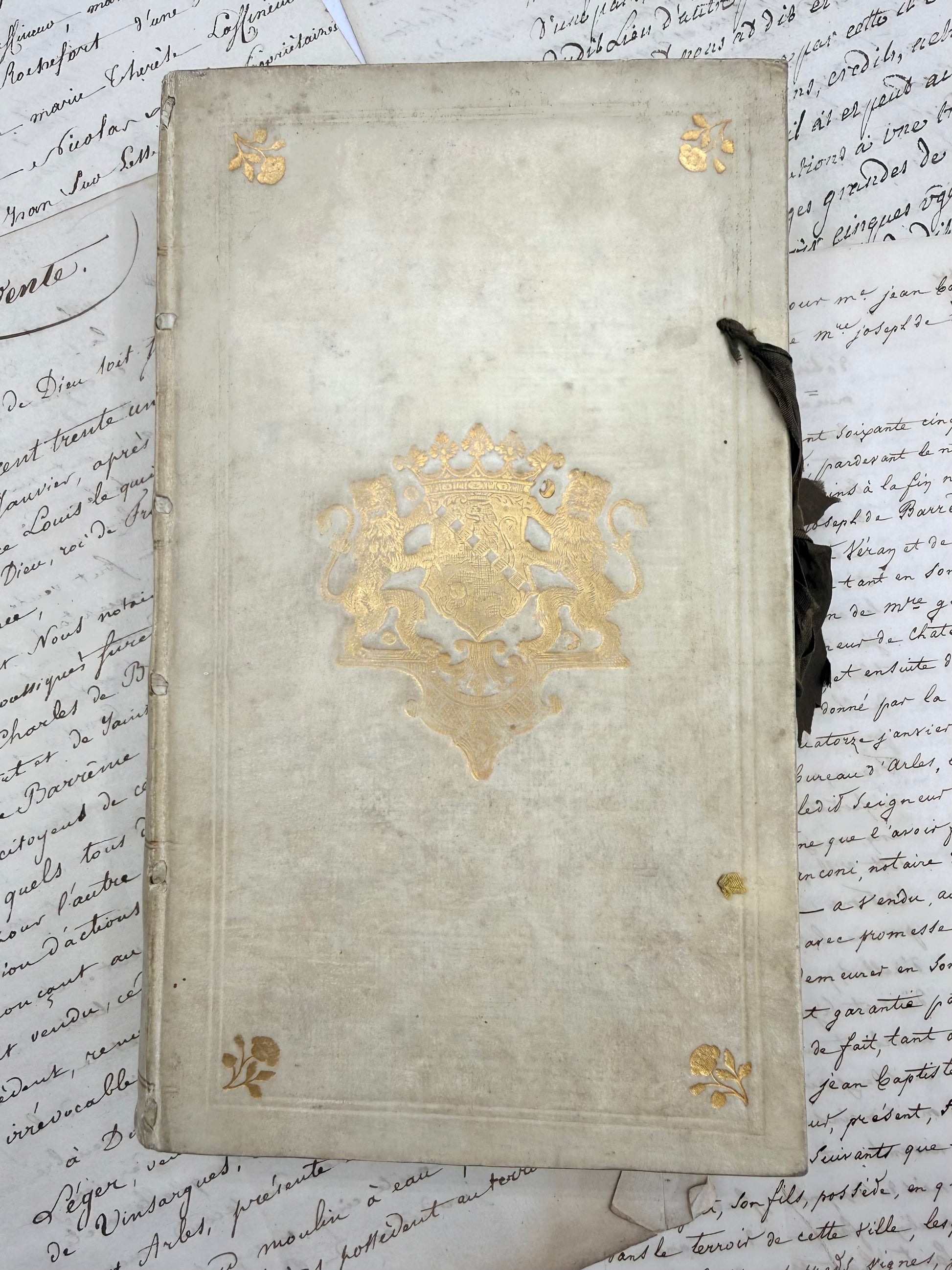 Aesop’s Fables from the 18th Century presented in an armoral vellum binding. Copyright 1778 in Latin language. "Fabularum Aesopiarum, curante Petro Burmanno". The vellum cover is white with some light soiling. The gilt coat-of-arms is bright. There are two fragile brown ribbons on on the outer edge with two missing. There is a placeholder ribbon inserted on the back inside cover. The pages are white with areas of foxing. There is nice texture on the pages. There is one detailed black and white engraving and an index in the back. 9", 258 pages + index.