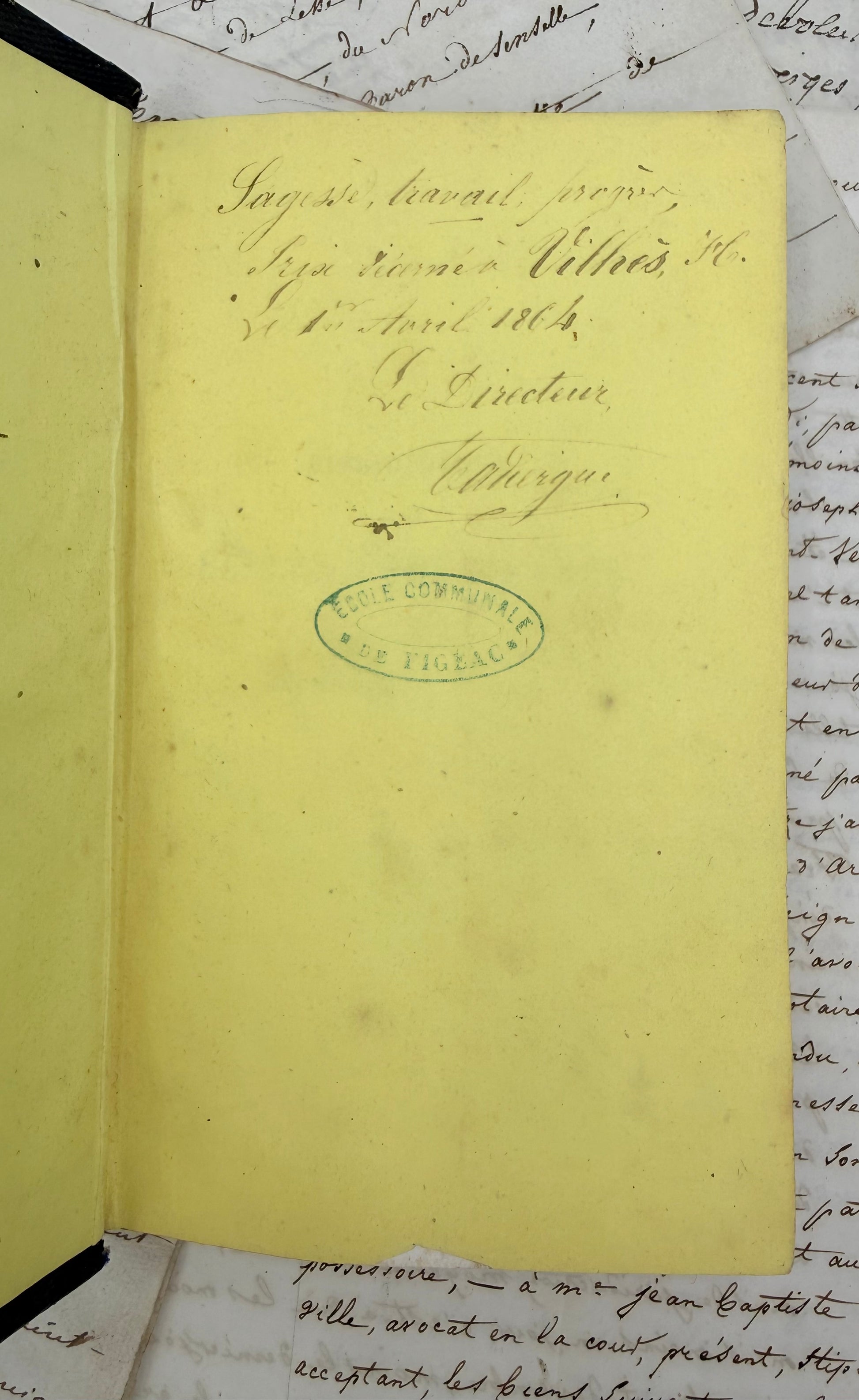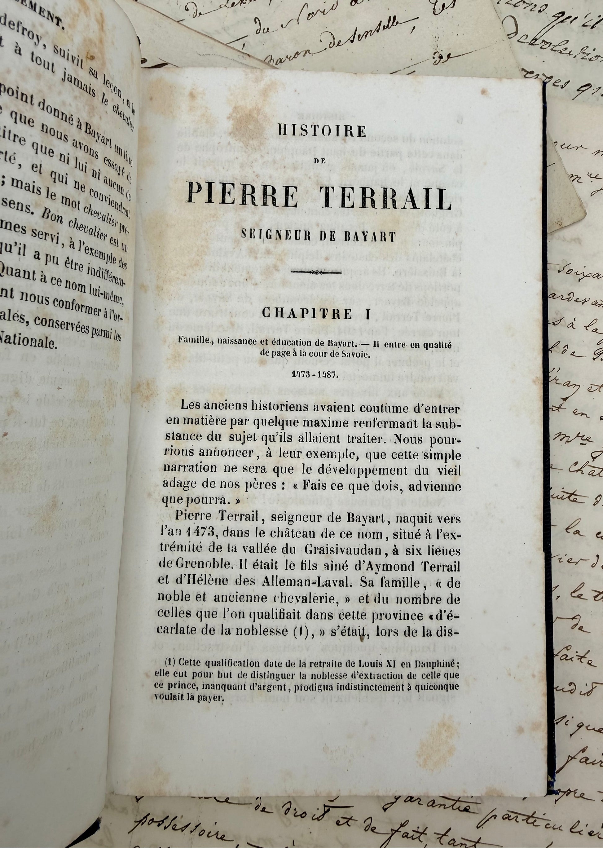 "Histoire de Bayart" by Alfred de Terrebasse. {Title: History of Bayart}. Copyright 1861. Published by Alfred Mame Company. French language. There is moderate foxing on the title page and throughout. There is heavy foxing on the last page. 243 pages, size: 7.35”