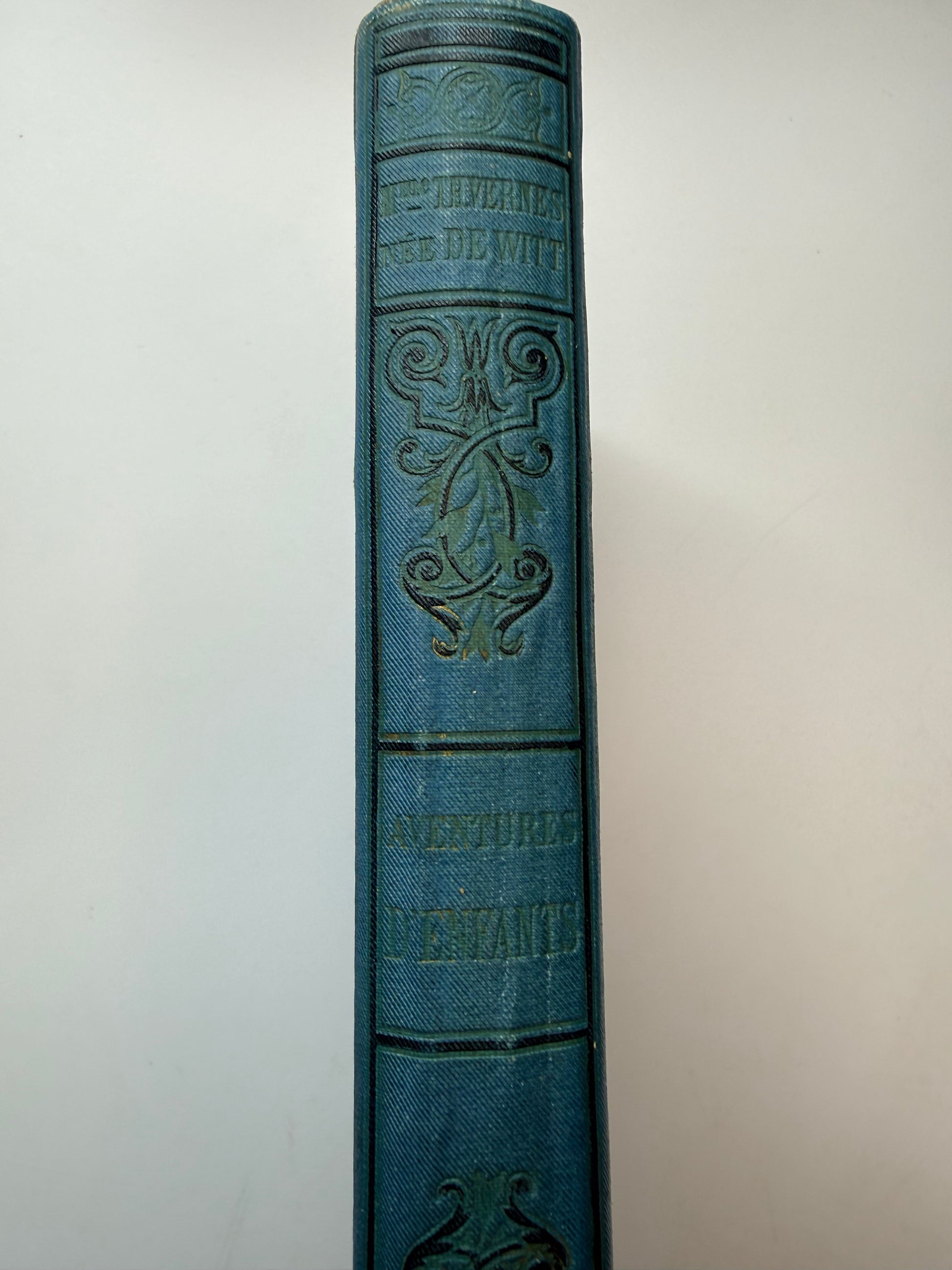 "Adventures D’Enfants". {Title: Children's Adventures} by Th. Vernes. Illustrated in black and white. Published by Imprimeries Librairies Reunies, Paris in the mid-19th Century (no date). The book is in French language with a blue cloth cover and gilt decoration. The gilt and cloth on the spine is darkened. There is moderate toning throughout and mild foxing. Size: 7.75", 277 pages.