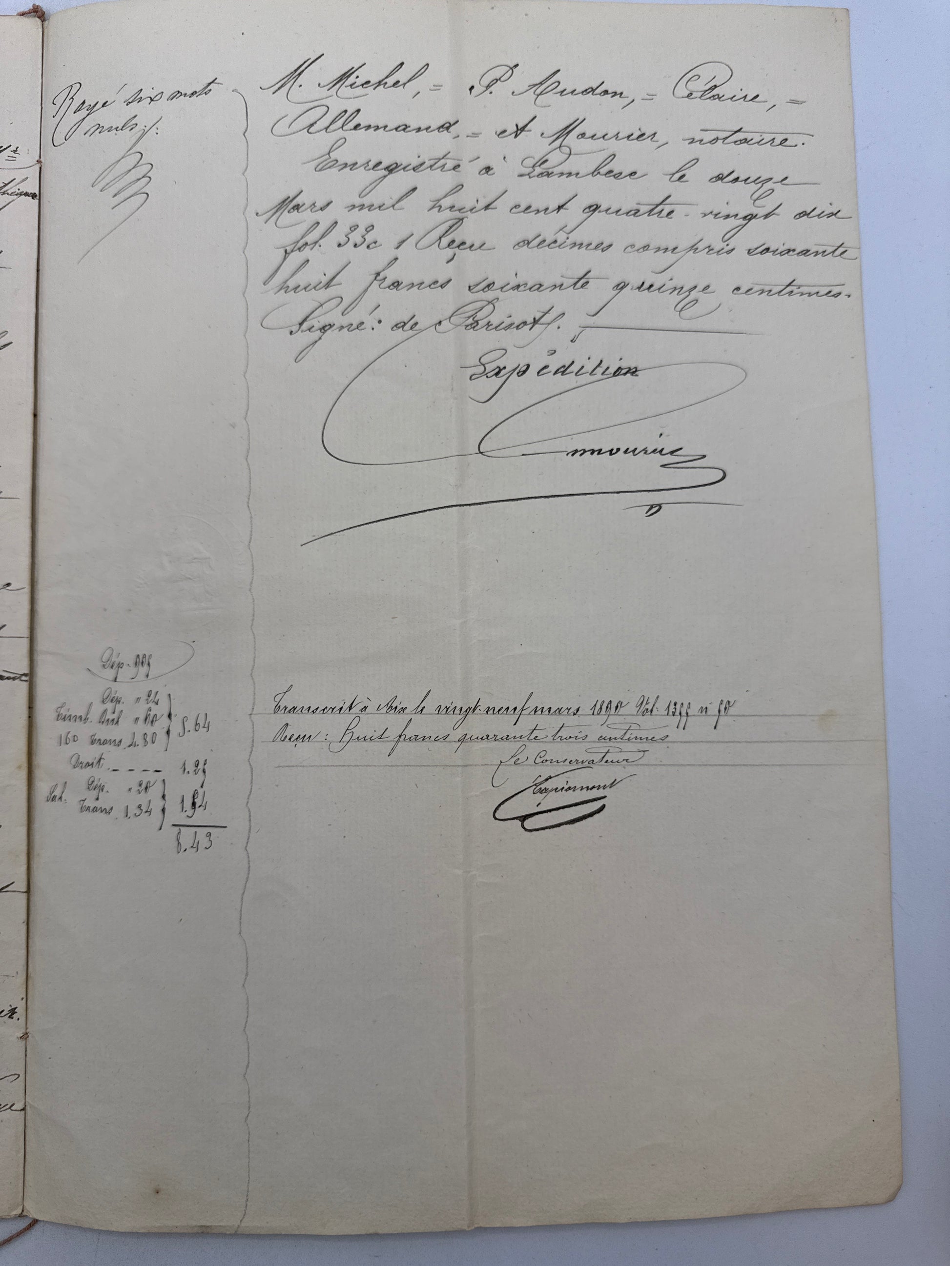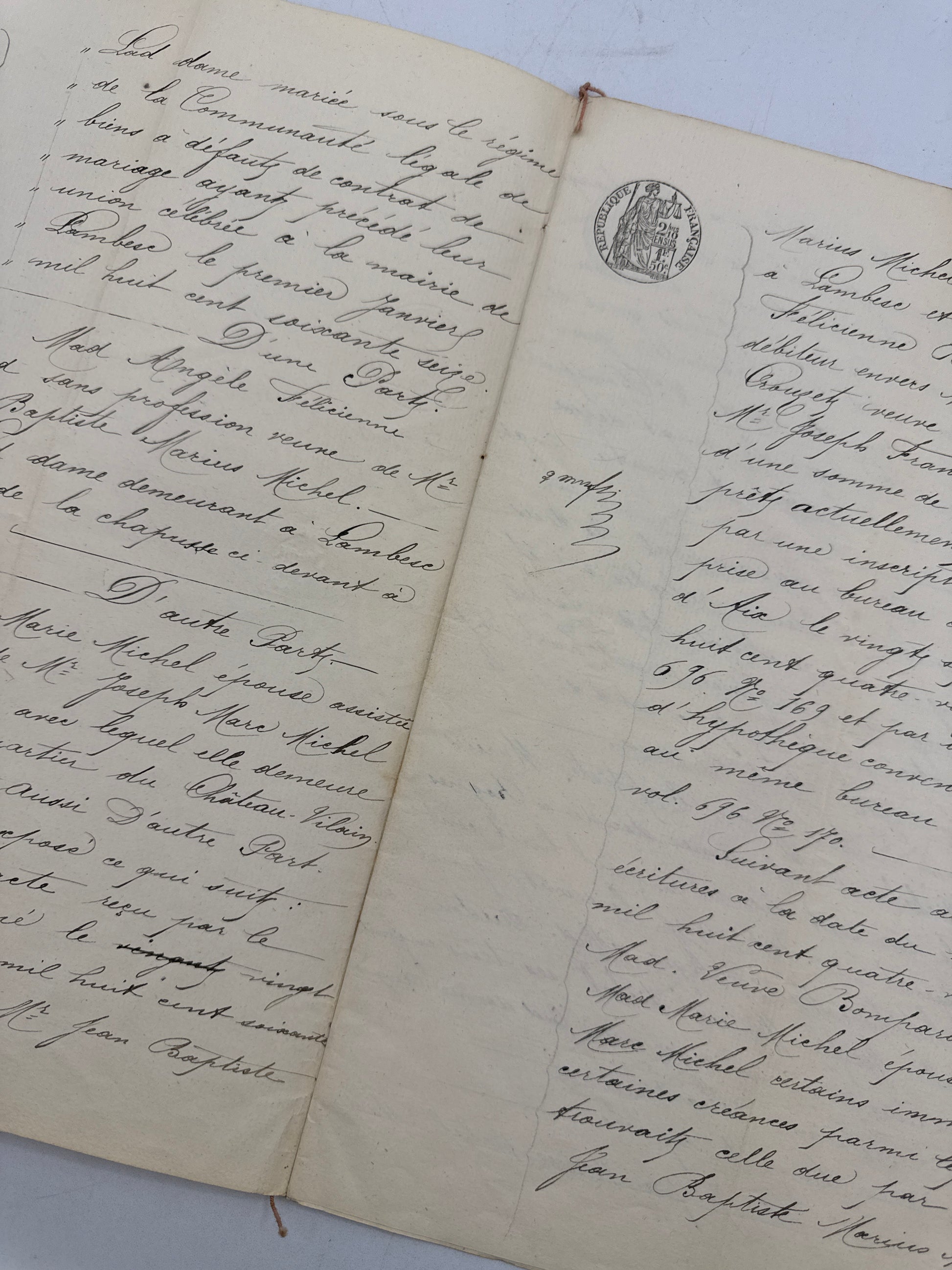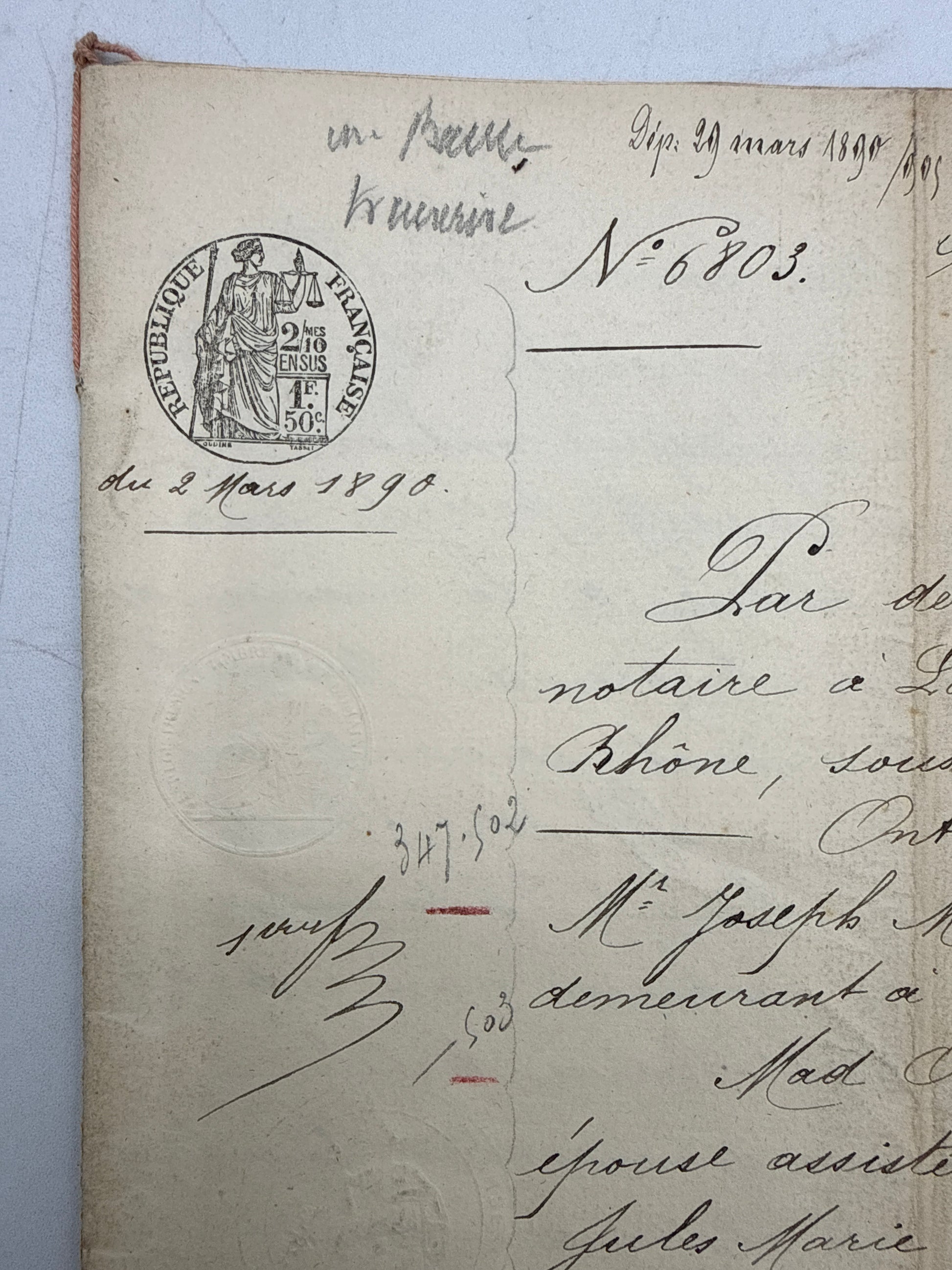 A multi-page antique French documents dated March 1890. Includes six pages bound together with string with handwriting on the front and back. There are stamps in areas and a water mark crossing from the front to the back page. The upper right corner of the front page reads, "Michel", No 6803. There is a vertical crease on the pages and the pages have light texture. There are a few red underlines in the margins. Six pages. Size: 11.75”.