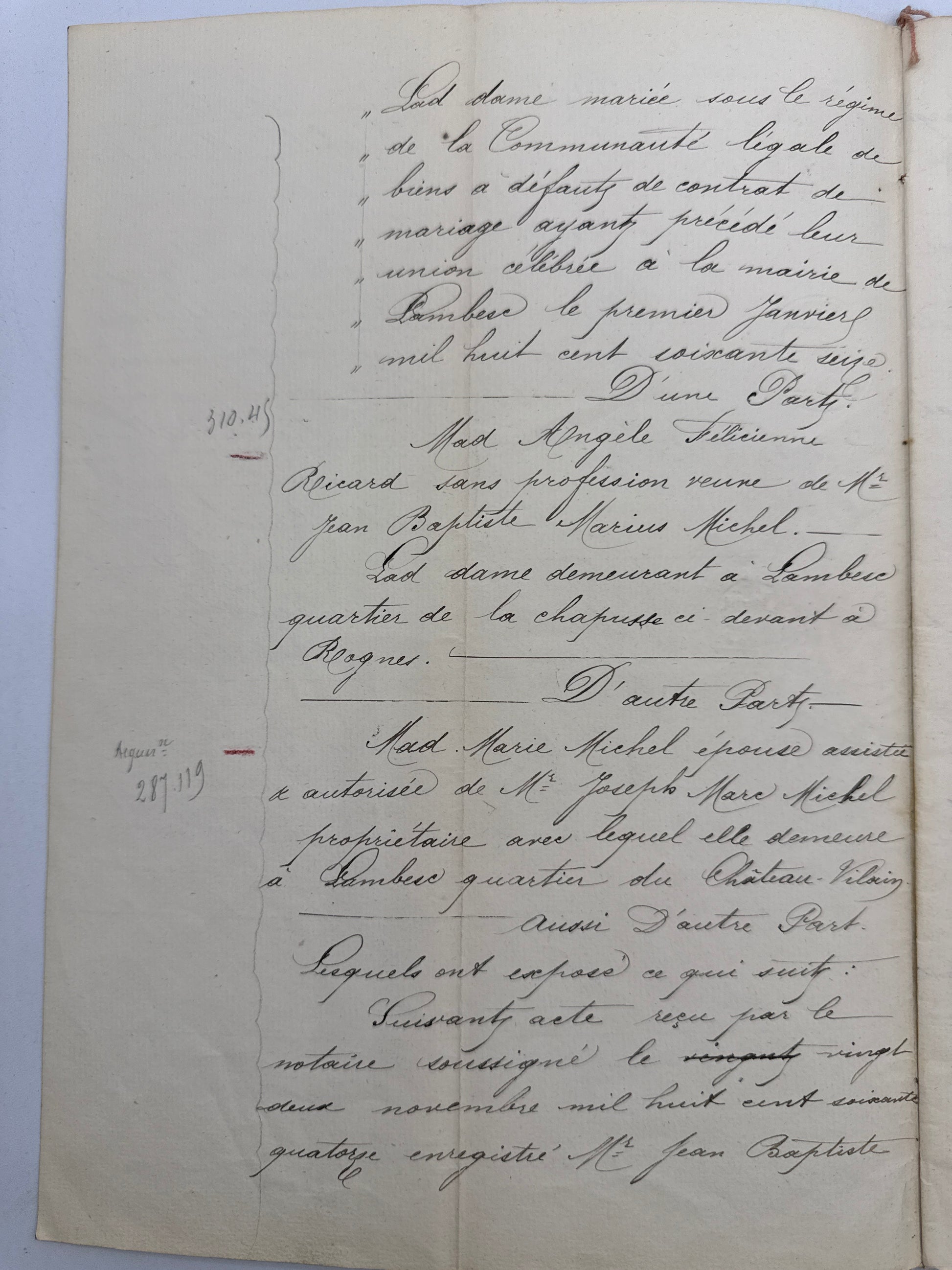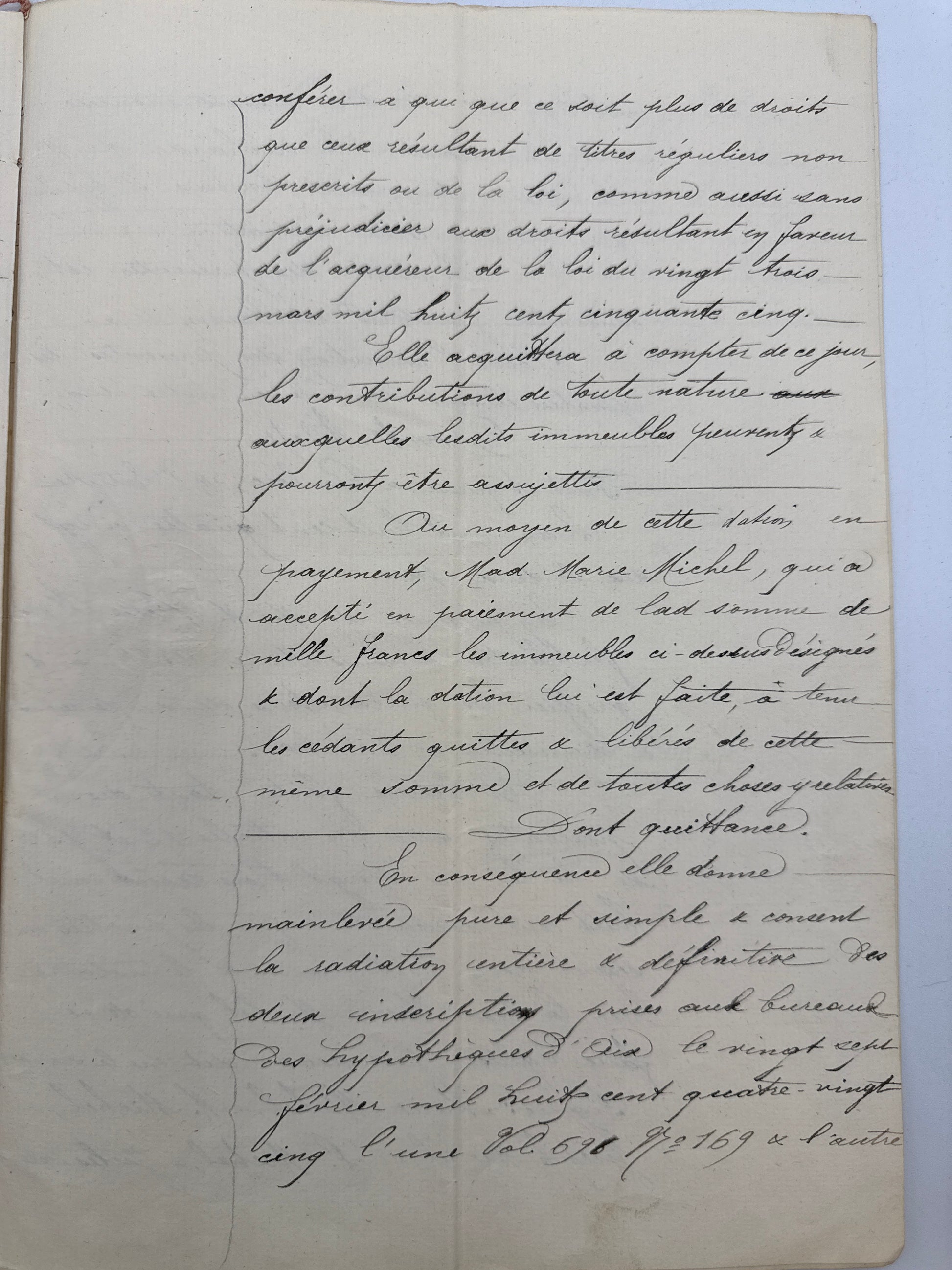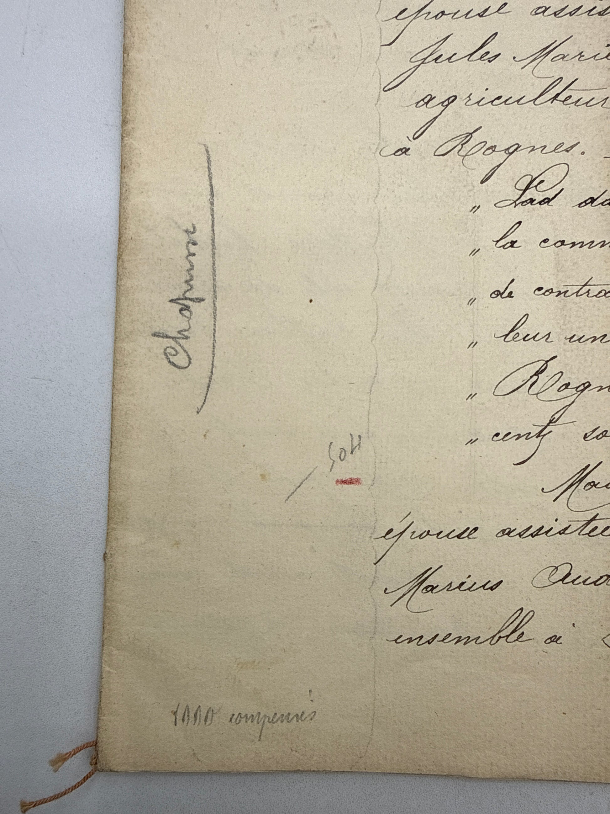 A multi-page antique French documents dated March 1890. Includes six pages bound together with string with handwriting on the front and back. There are stamps in areas and a water mark crossing from the front to the back page. The upper right corner of the front page reads, "Michel", No 6803. There is a vertical crease on the pages and the pages have light texture. There are a few red underlines in the margins. Six pages. Size: 11.75”.