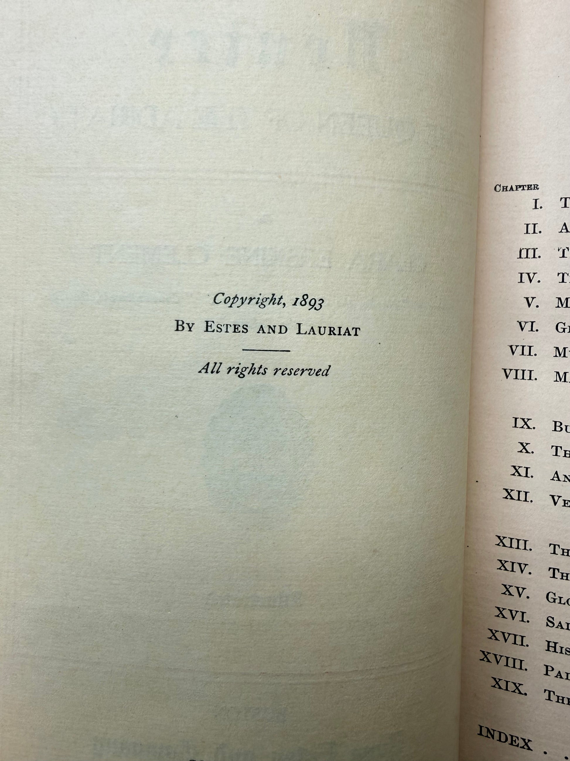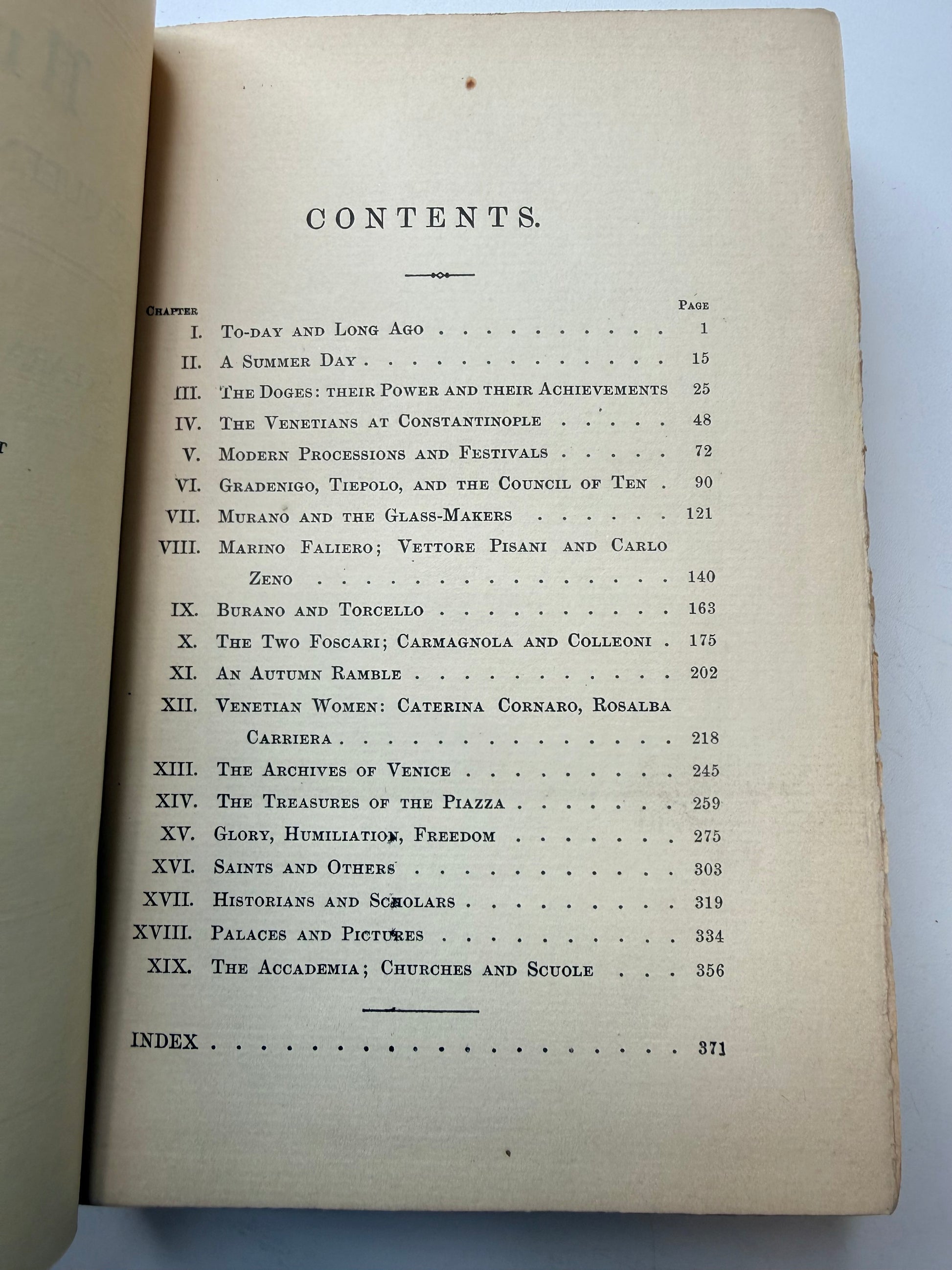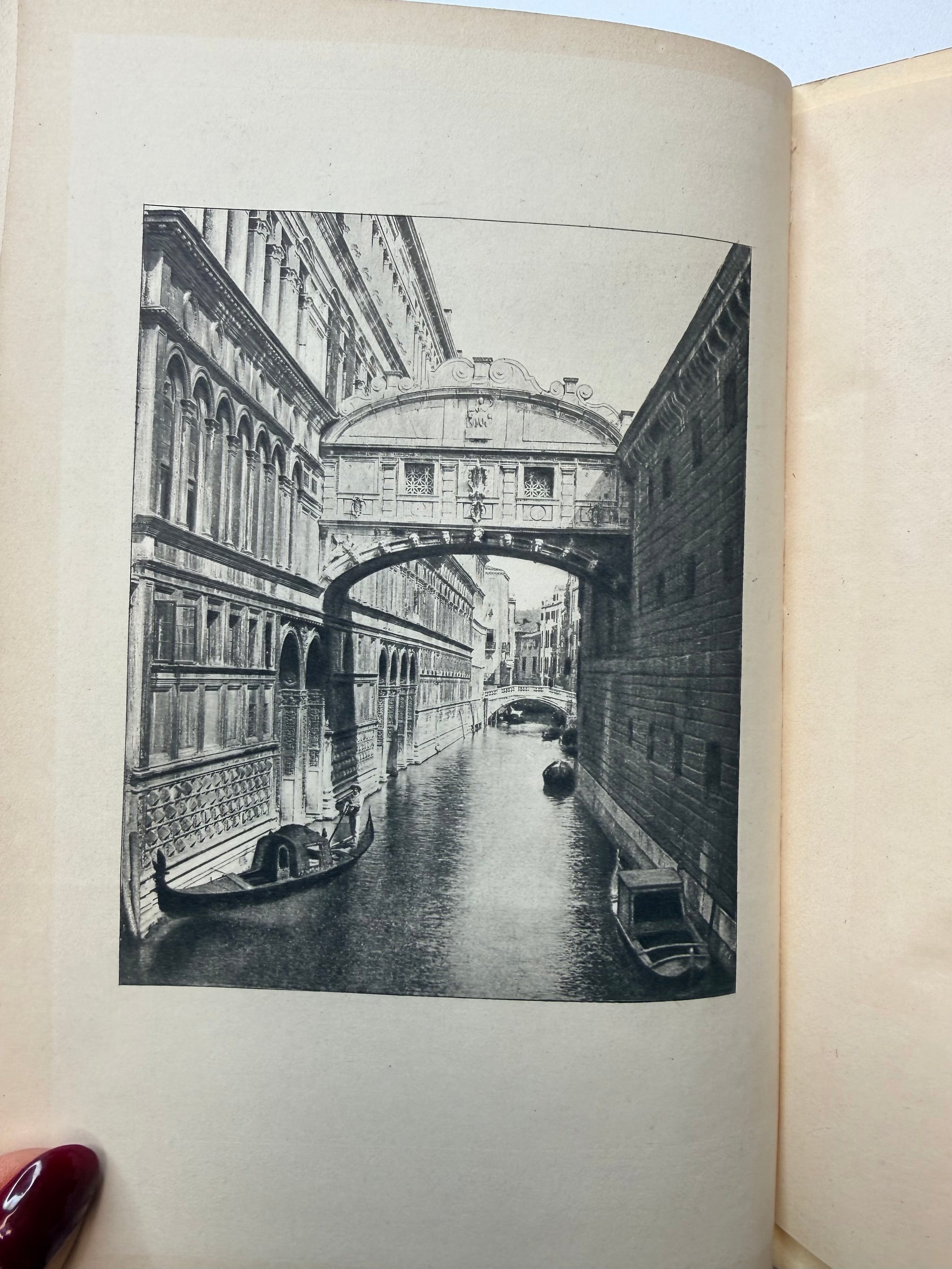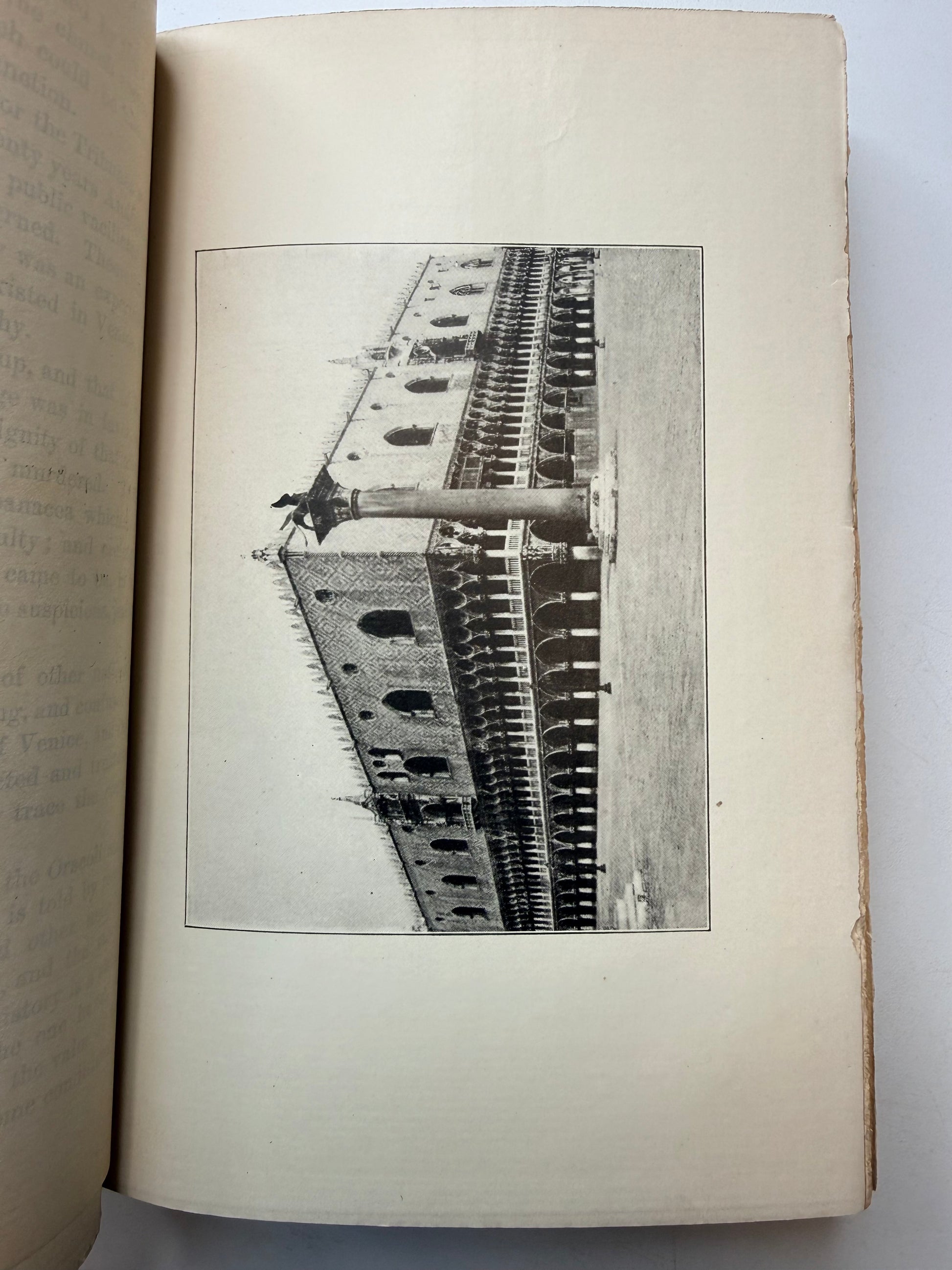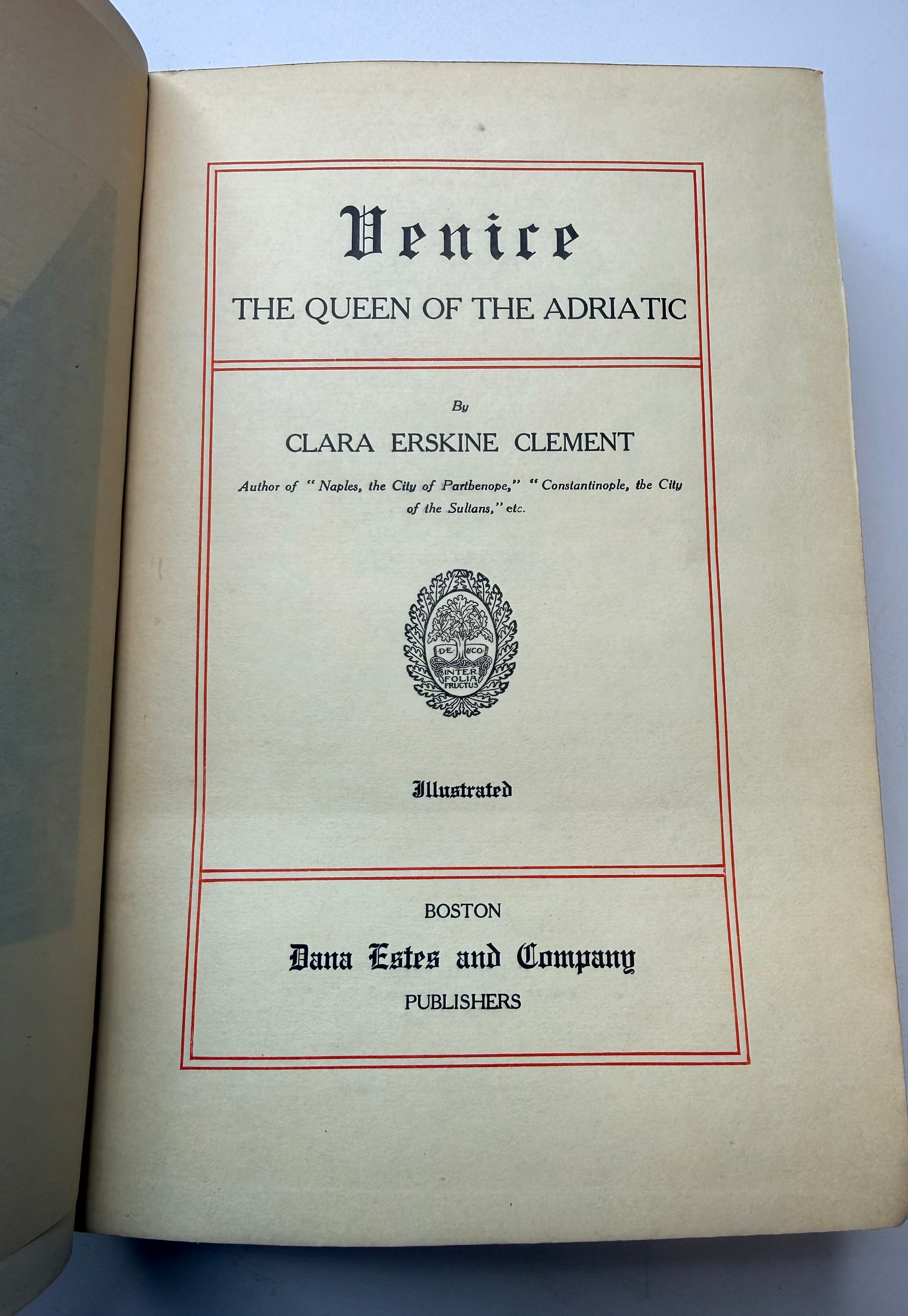Venice by Clara Erskine Clement. Published with a blue cloth cover and gilt decoration. Illustrated in black and white. Published by Dana Estes and Company, Boston. Copyright 1893. There is a discoloration spot on the spine. The pages are soft with mild toning throughout. Has a slight antique smell when opened. Size: 7.75", 380 pages.