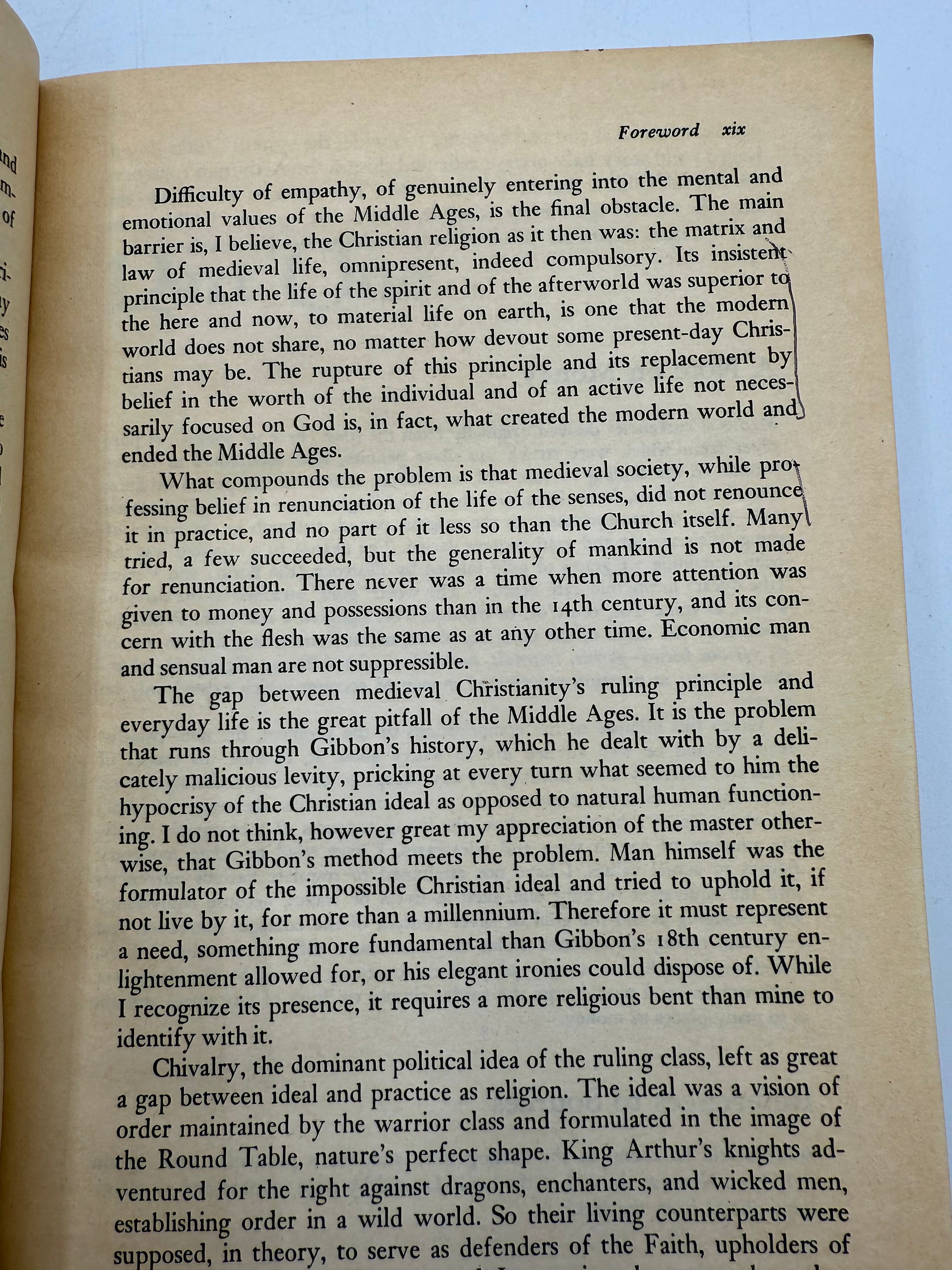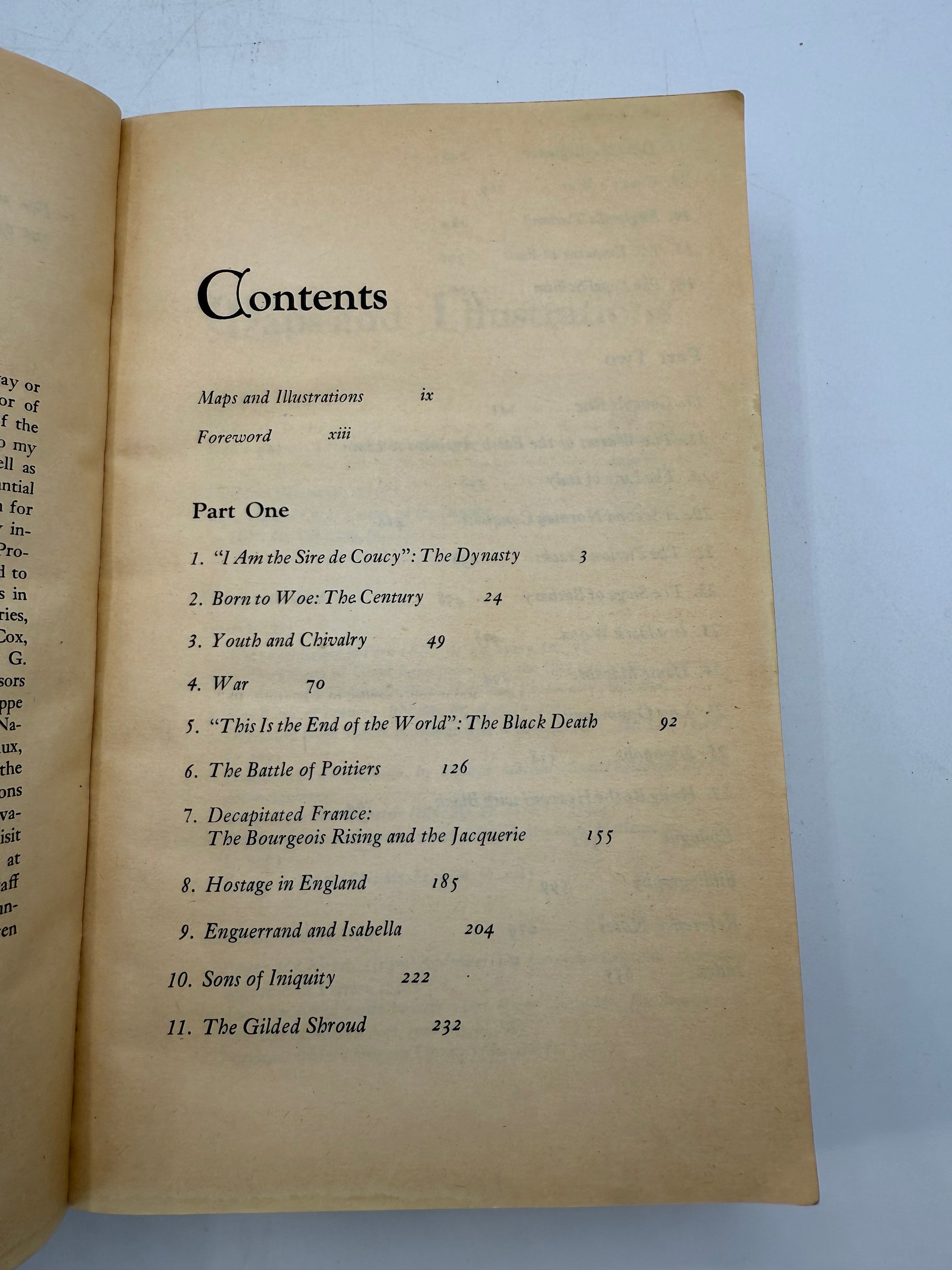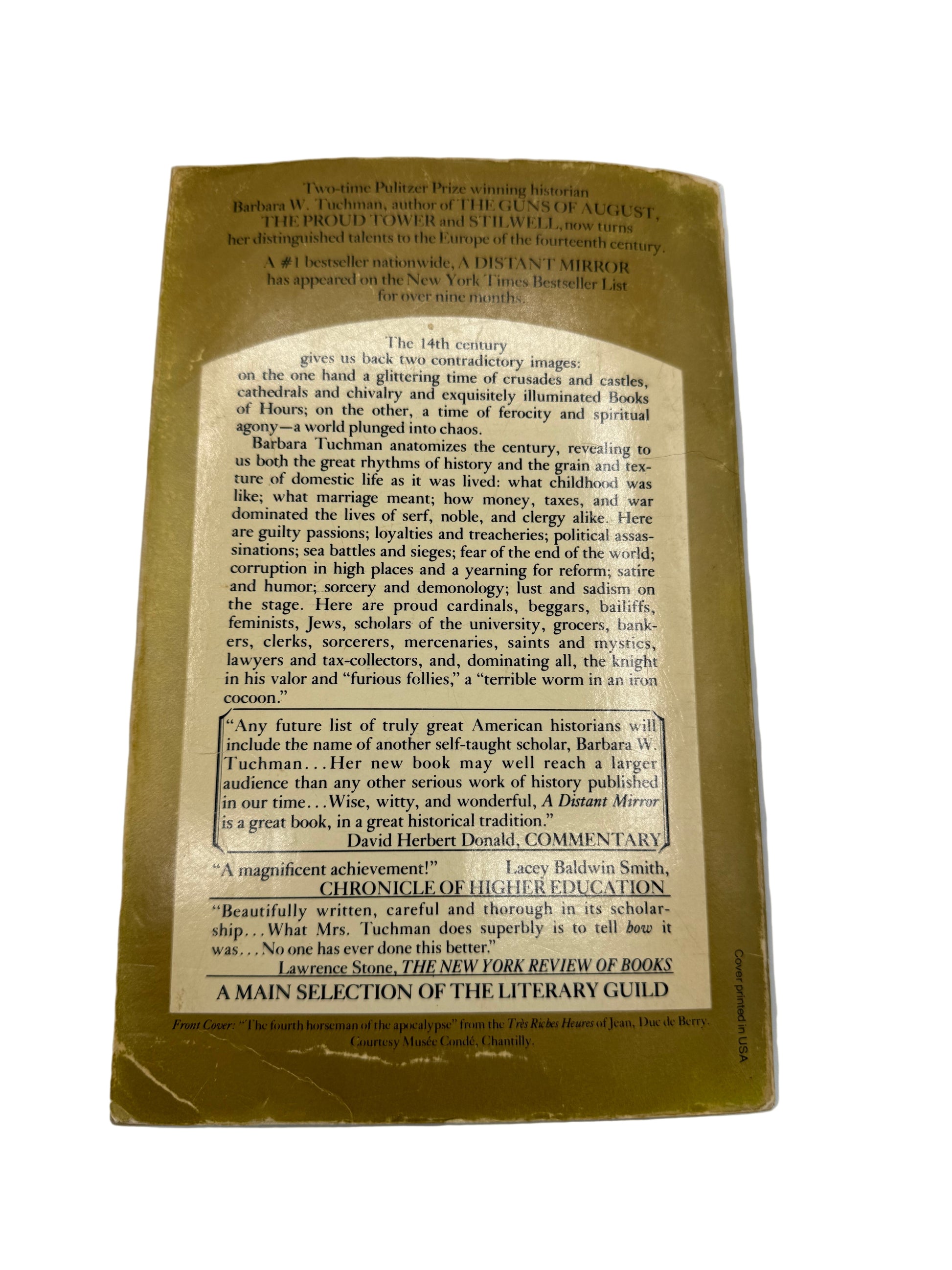 A Distant Mirror by Barbara W Tuchman, The Calamitous 14th Century. Paperback. Ballantine Books, NY. Copyright September, 1979. There is a crease on the upper right corner of the cover. The pages have moderate toning throughout. There are blue pen, black pen and pencil notations on many pages throughout. Illustrated. 676 pages, 8.25".