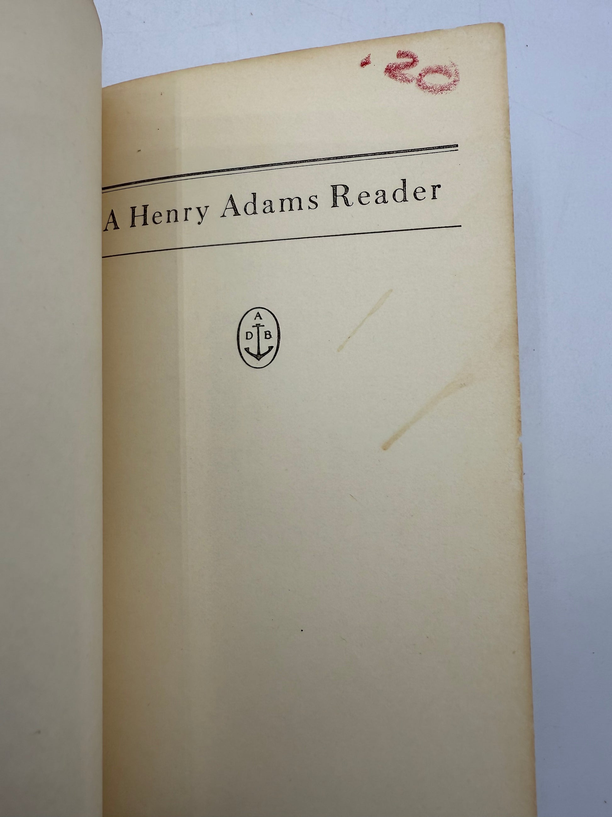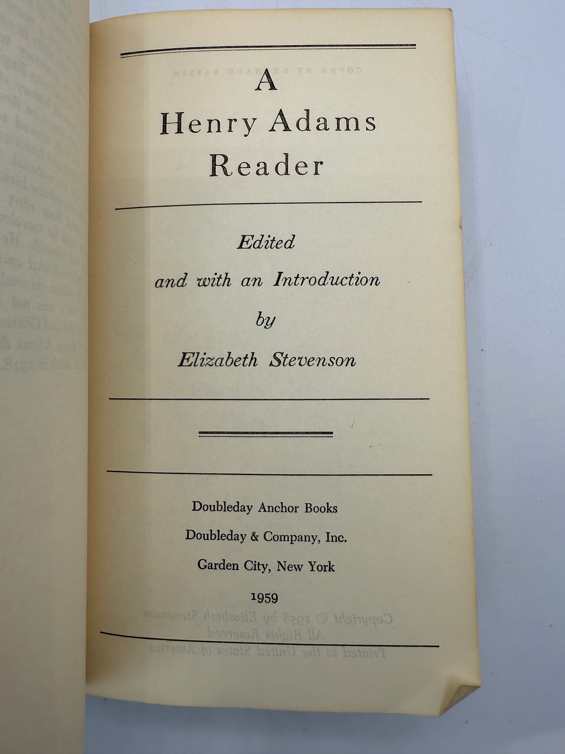 A Henry Adams Reader. Edited with Introduction by Elizabeth Stevenson. A Doubleday Anchor Book. Copyright 1959. Contains selections of his various writings. There is a soil spot on the upper right corner of the cover. There is a red price on the inside page of the cover. The pages are crisp and white throughout with mild toning. Size: 7", 381 pages.