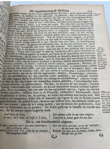 A decorative antique vellum hard cover, "Alle Volgeestige Werken" and "Wetsteen der Vernuften, Jok en Ernst" by Jan de Brune de Jonge and "De Honig-Bye met Verscheydene Gedichten". {Title: All Full Spirited Works of Jane de Brune de Jonge, West of Wits, Joke and Seriousness, and Verscheydene Poems}. Published by Hero Galama te Harlingen in the 1700's. Dutch language, possibly a first edition. The cover is hard light colored vellum with script on the backstrip. The outer edge of the cover bends downward, possibly to protect the book. The interior pages are soft and intact with moderate tanning throughout. Size: 8.25 x 6.5", ~ 300 pages