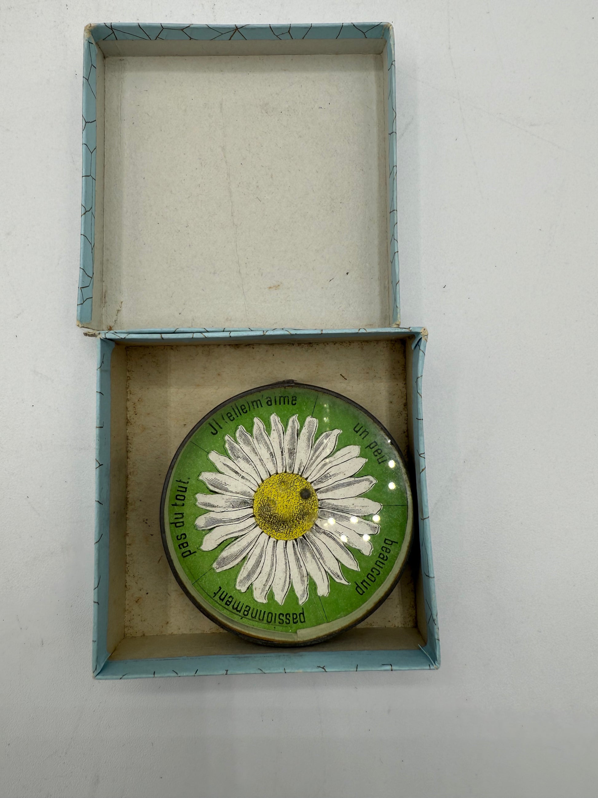 An antique small French game with cute cover graphics. A small round game of skill in a blue cardboard box. There is French language on the box and on the game. There is antique French paper on the back of the game. There is a tear on one corner of the game lid. Size: 3 x 2.75".