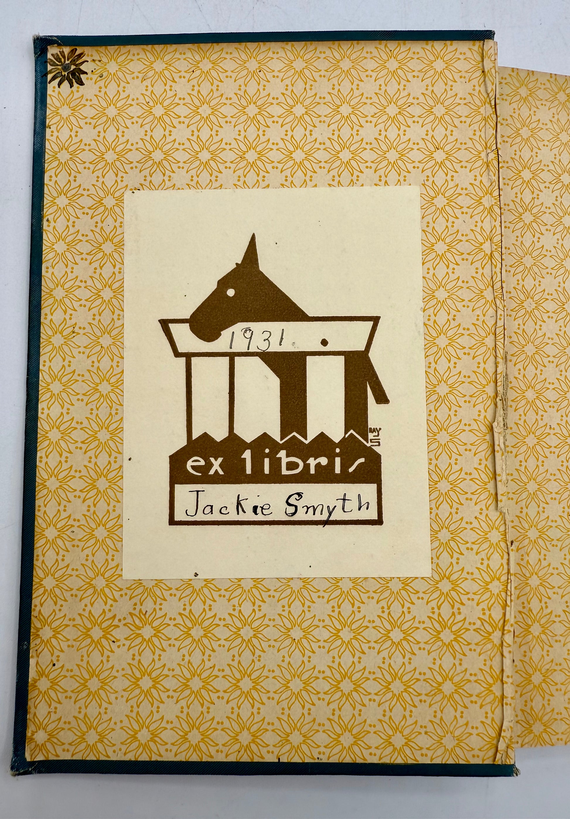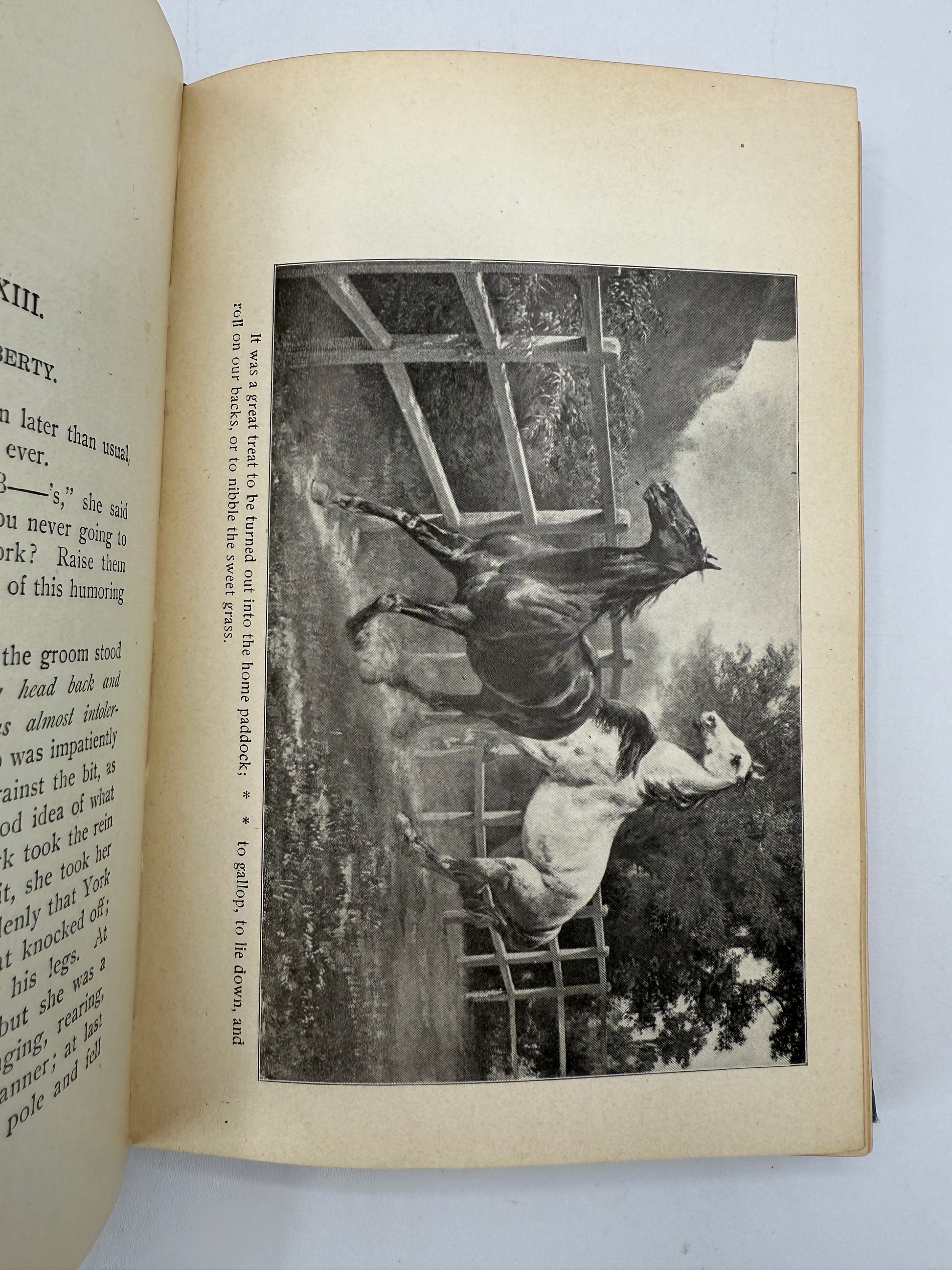 Black Beauty by Anna Sewall. Published around 1890 by M A Donohue, Chicago. Illustrated in black and white throughout. The hinge is cracked at the endpapers making the cover feel somewhat fragile. The cover is a blue with charcoal gray undertones. There is discoloration along the cover edge and upper and lower backstrip. There is fraying and underboard exposed on the upper and lower backstrip. The cover leans forward slightly. There is an ex-libris sticker on the left endpaper. The pages are crisp and there is mild toning throughout. Some page fingerprints and other page imperfections are pictured. 247 pages, size: 7.65".