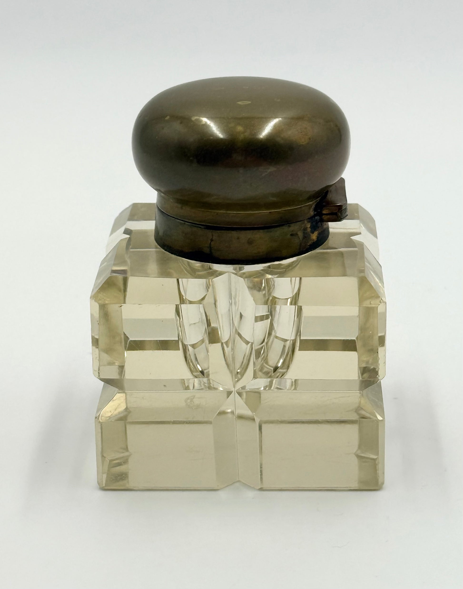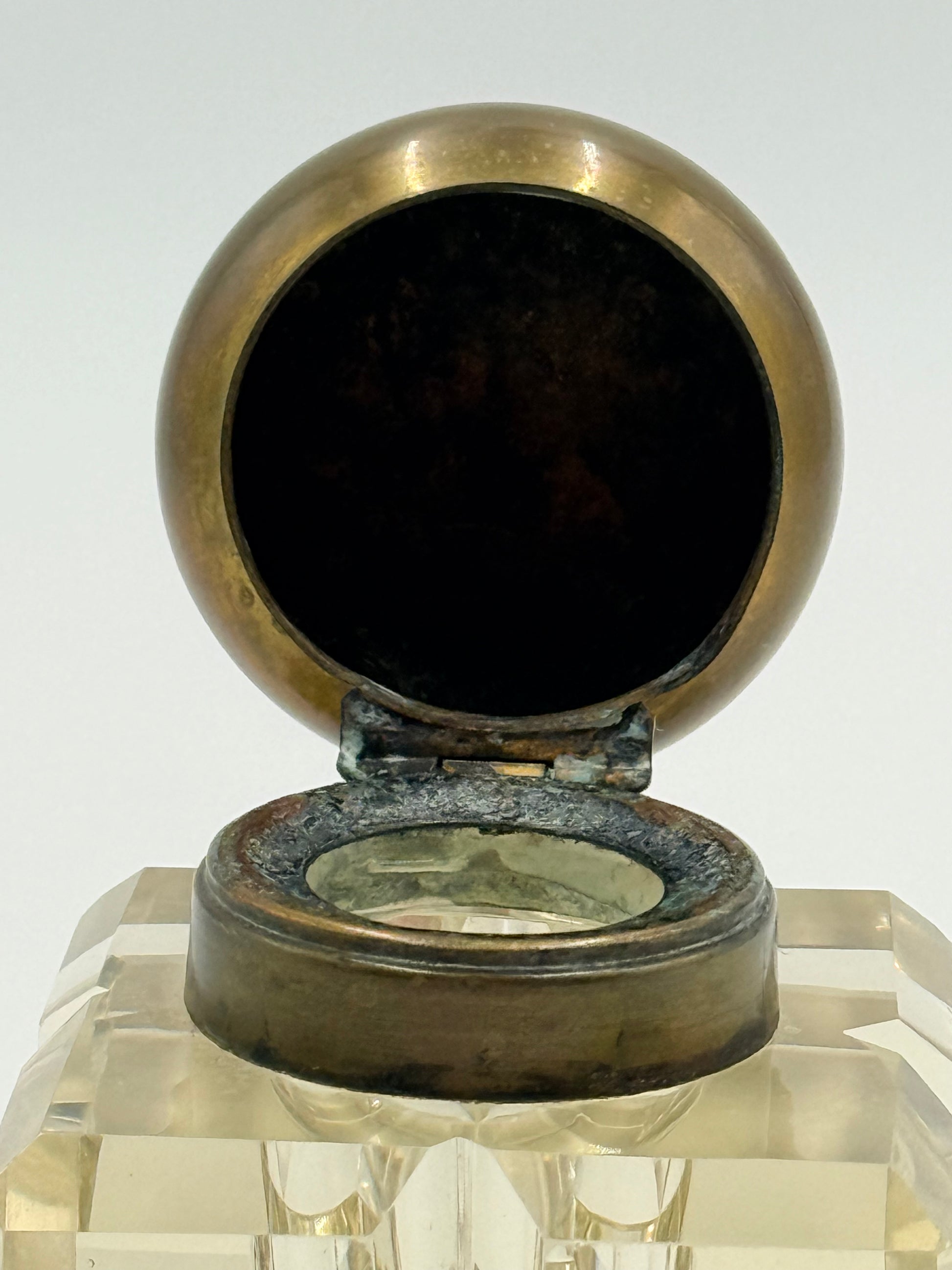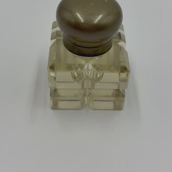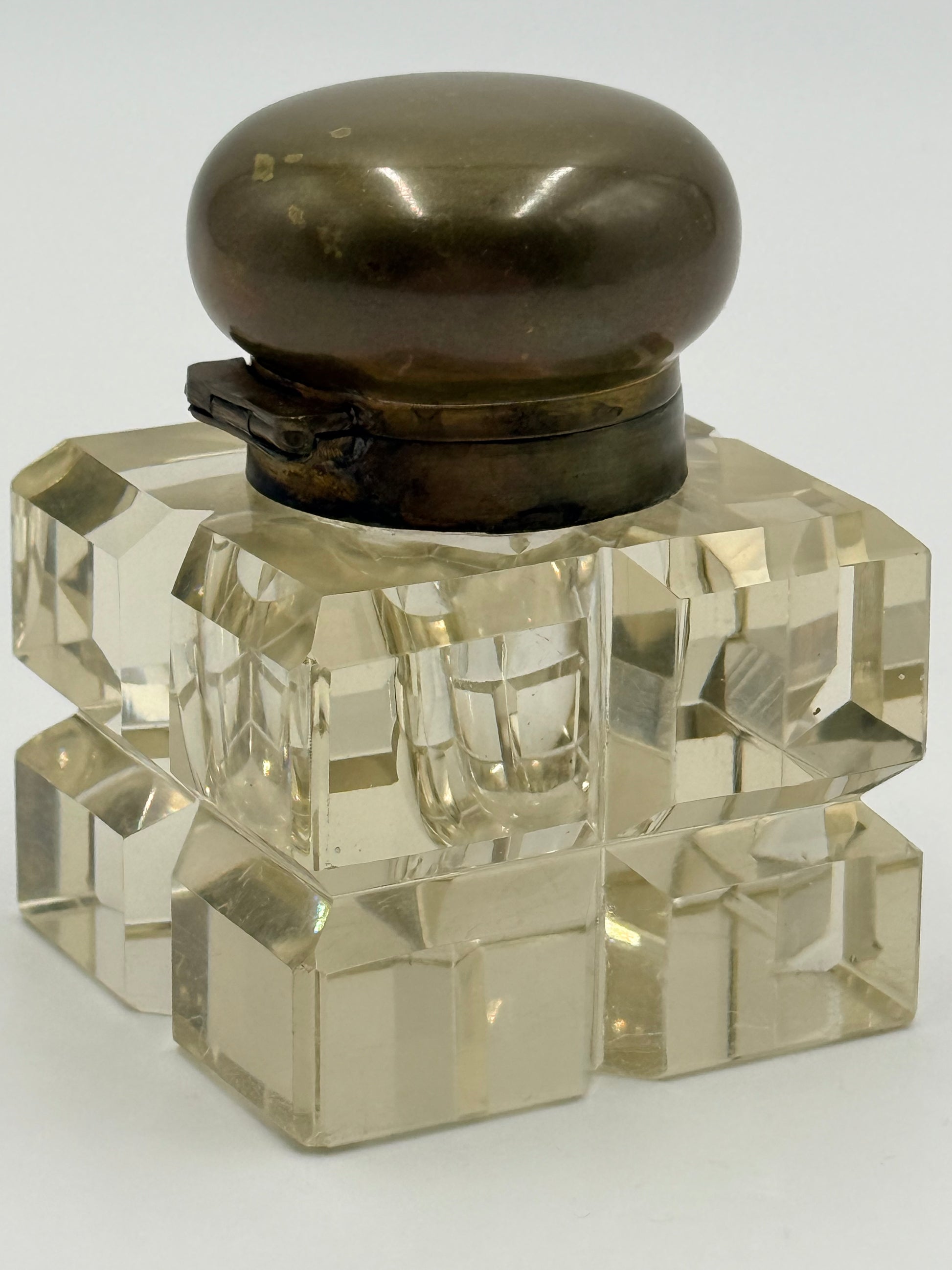 An antique Napoleon III style crystal inkwell with bronze rounded lid on a hinge. The crystal is beautifully cut and clear. The crystal does not have a yellow hue. There are superficial scratches on the base (pictured). There is oxidation on the inside rim of the bronze finish of the well. Owner will need to press down somewhat hard to close. Size: 3.5x2.5”.