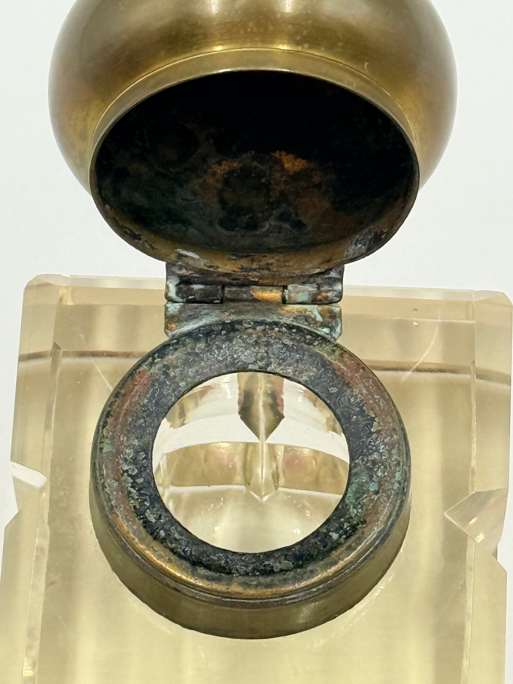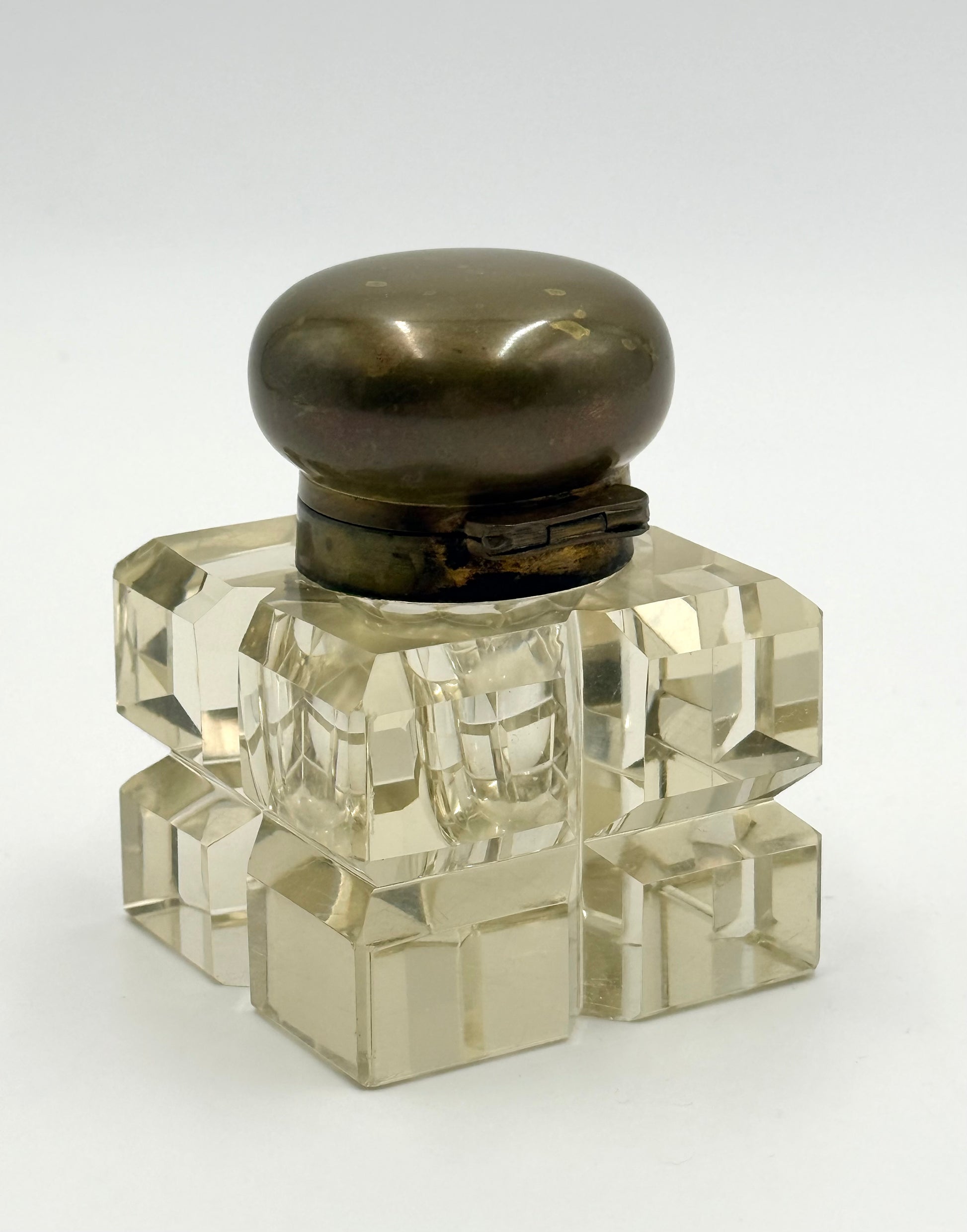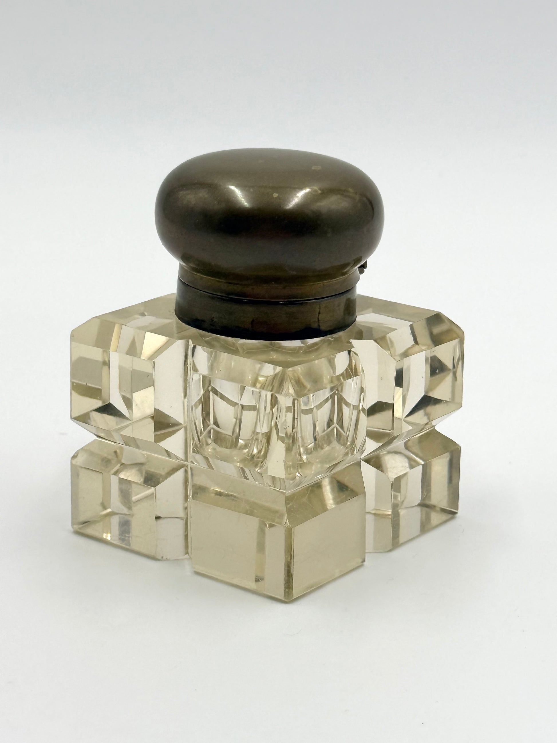 An antique Napoleon III style crystal inkwell with bronze rounded lid on a hinge. The crystal is beautifully cut and clear. The crystal does not have a yellow hue. There are superficial scratches on the base (pictured). There is oxidation on the inside rim of the bronze finish of the well. Owner will need to press down somewhat hard to close. Size: 3.5x2.5”.