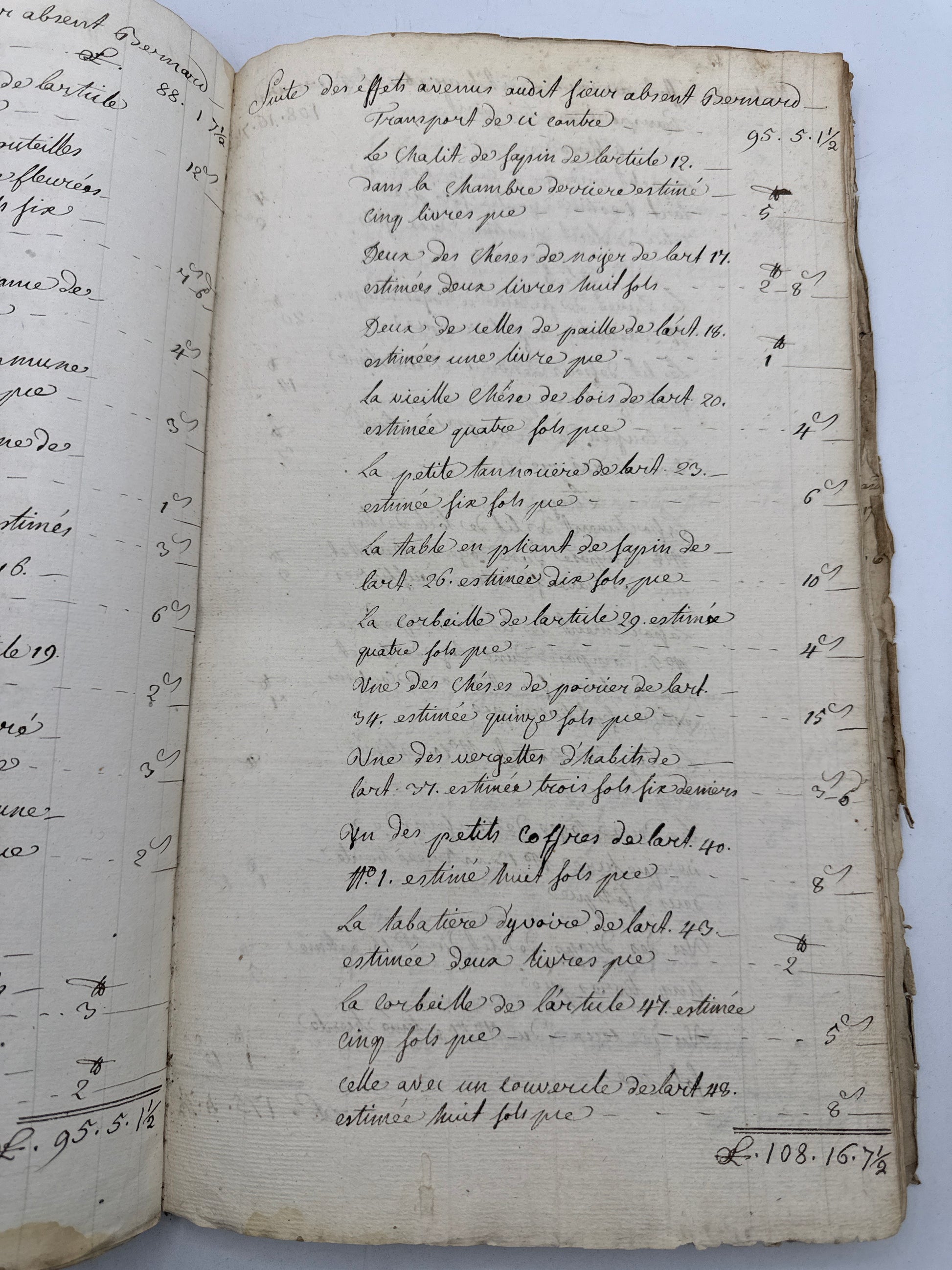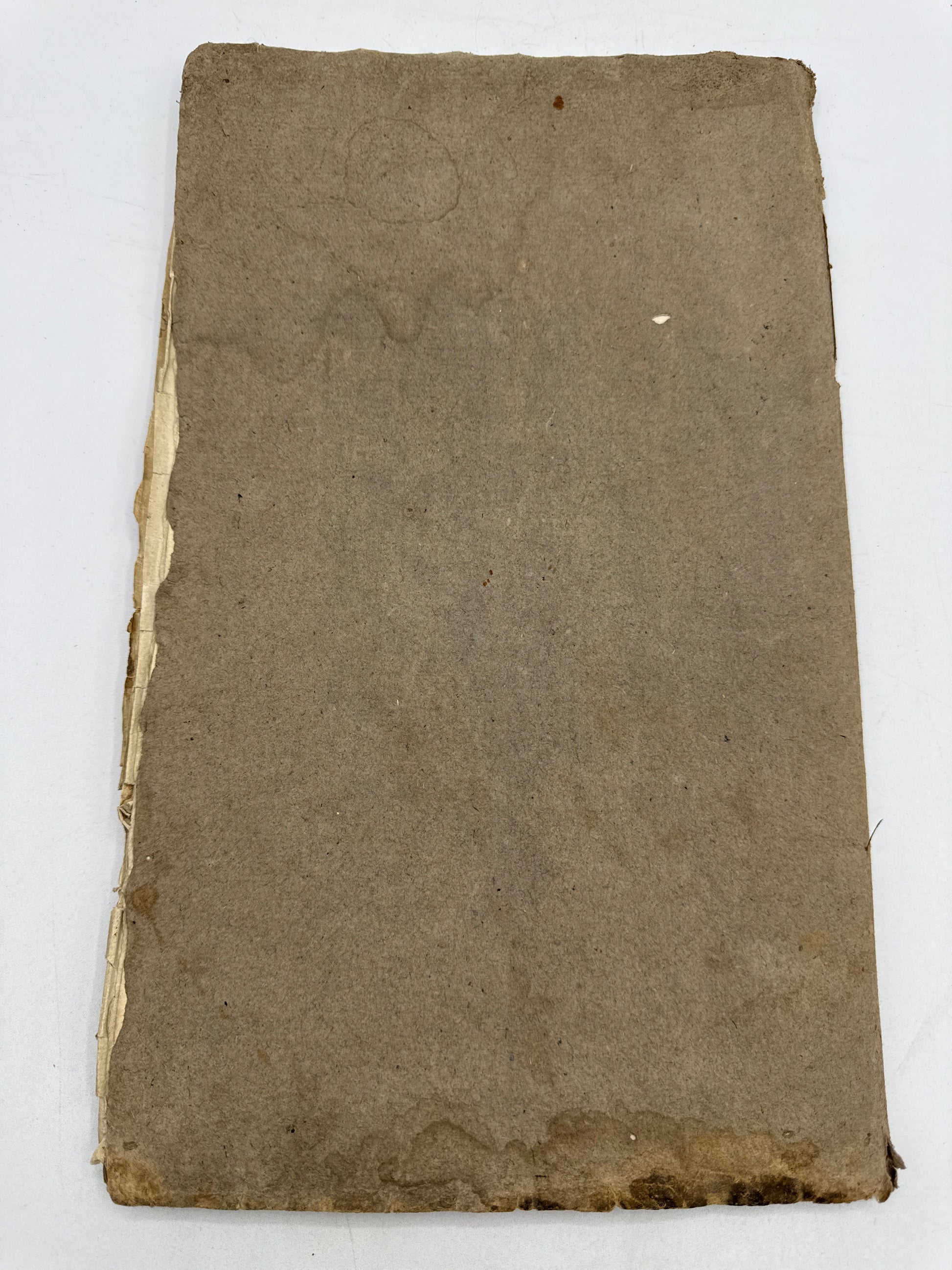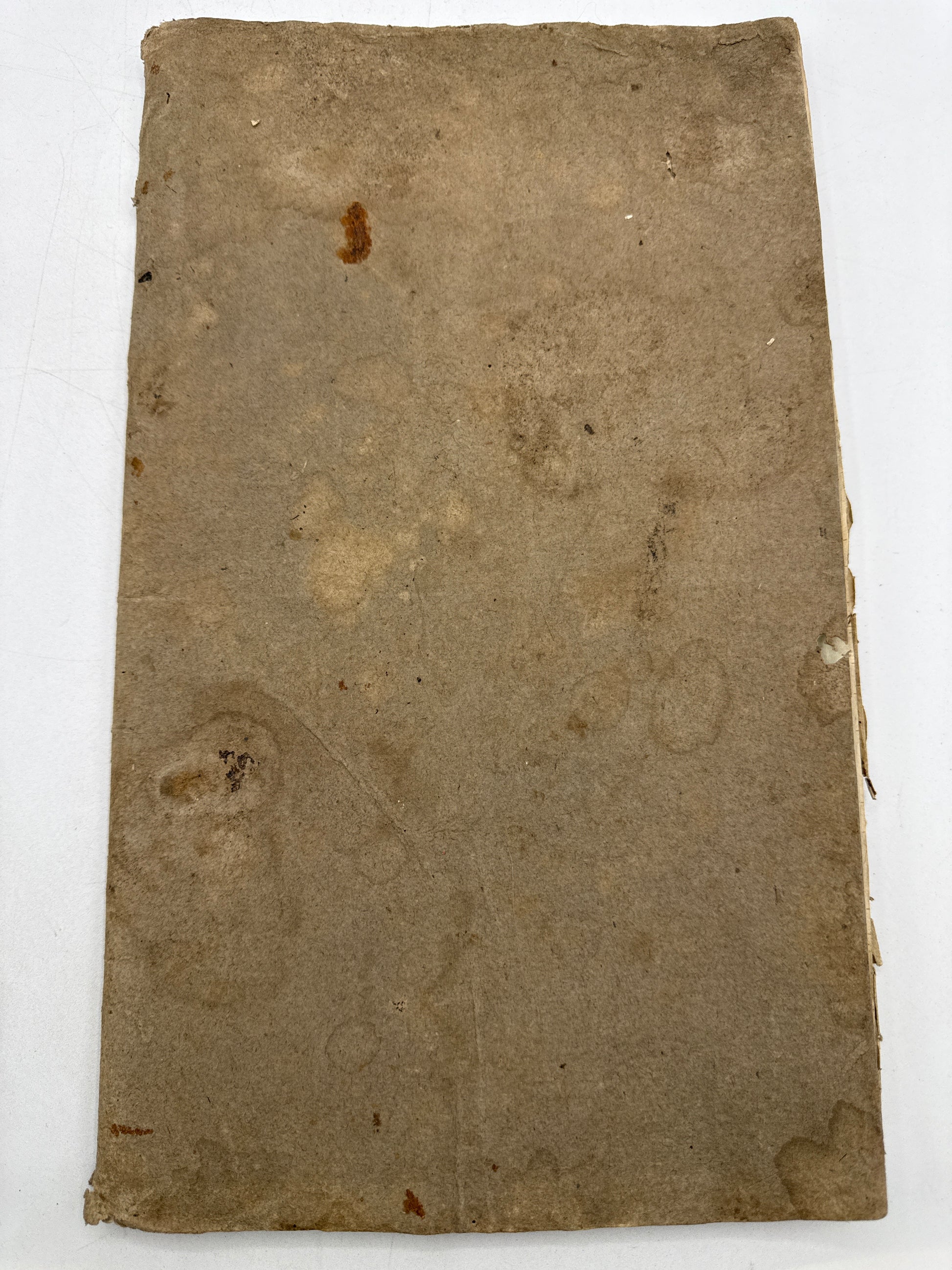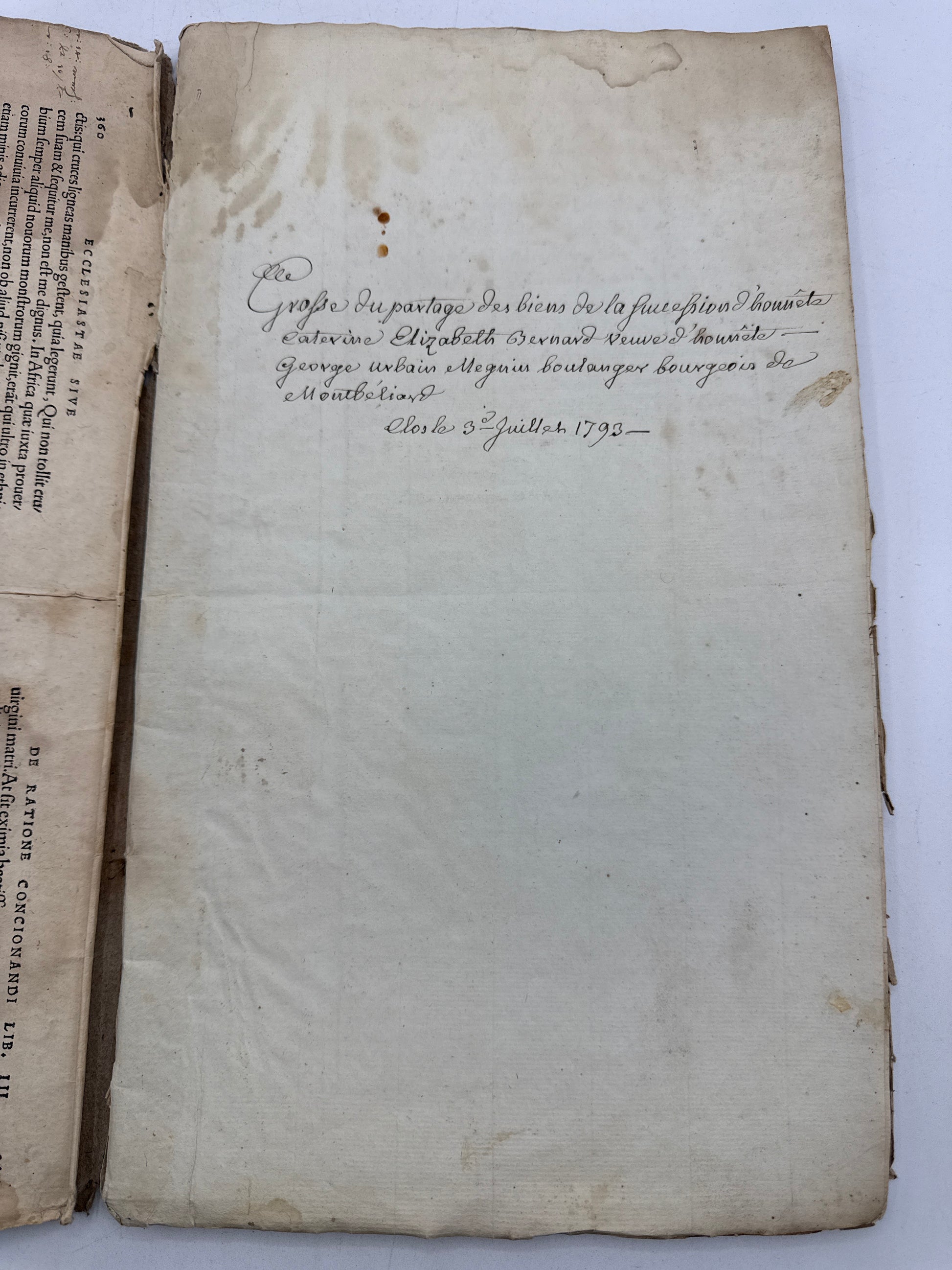 An antique French ledger or document of property dated 1793 on the first page with the property owners name. Some areas of soiling on the covers. Soiling on the lower back cover. The edge (spine) of the ledger is good. A few of the interior pages have a pale green hue to them. Many pages handwritten. Size: 14 x 8.25”.