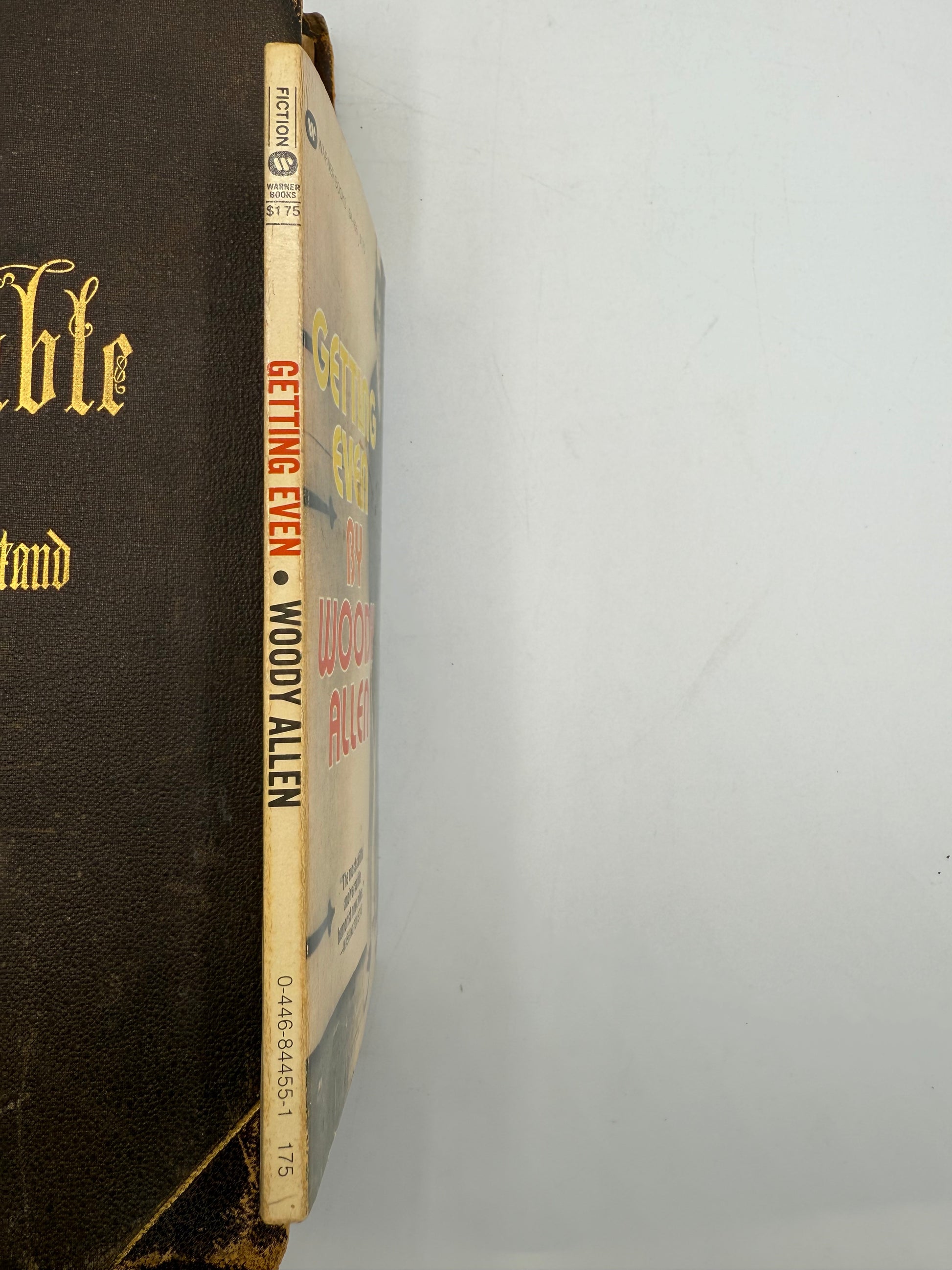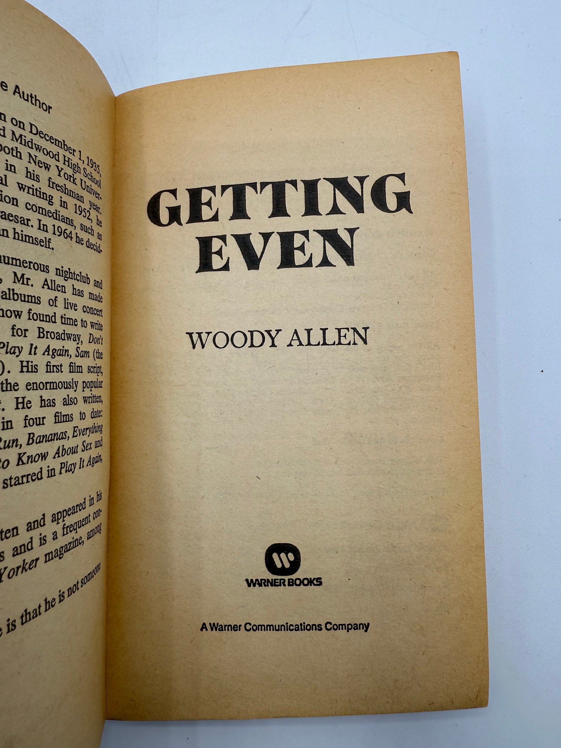 Getting Even by Wood Allen. Copyright 1971. Warner Books. Paperback. There is a slight moisture spot on the center cover. The pages are moderately toned throughout. There is a moisture spot on the outside edge of the page near the center (~1"). There is a tiny soil spot in the margin on page 69. 110 pages, size: 7".