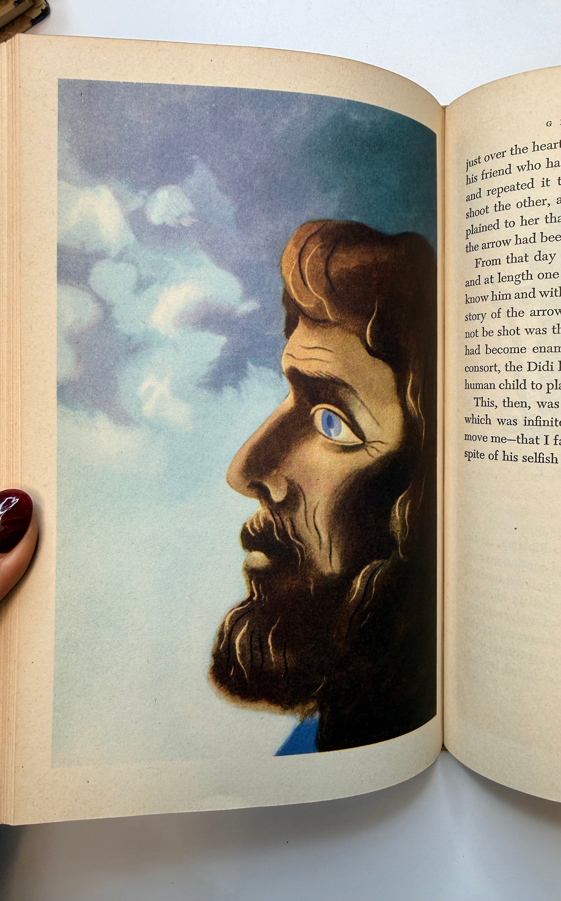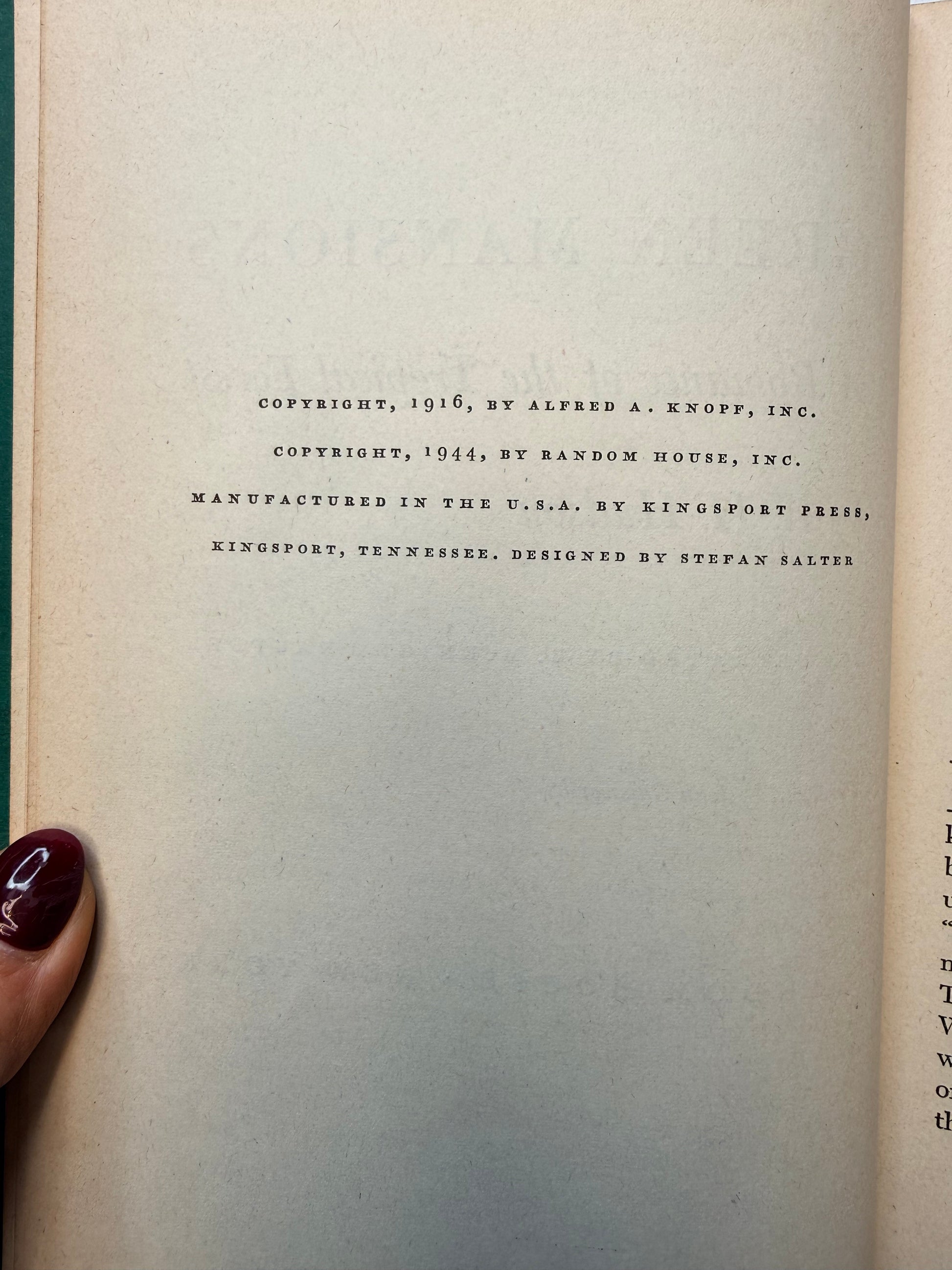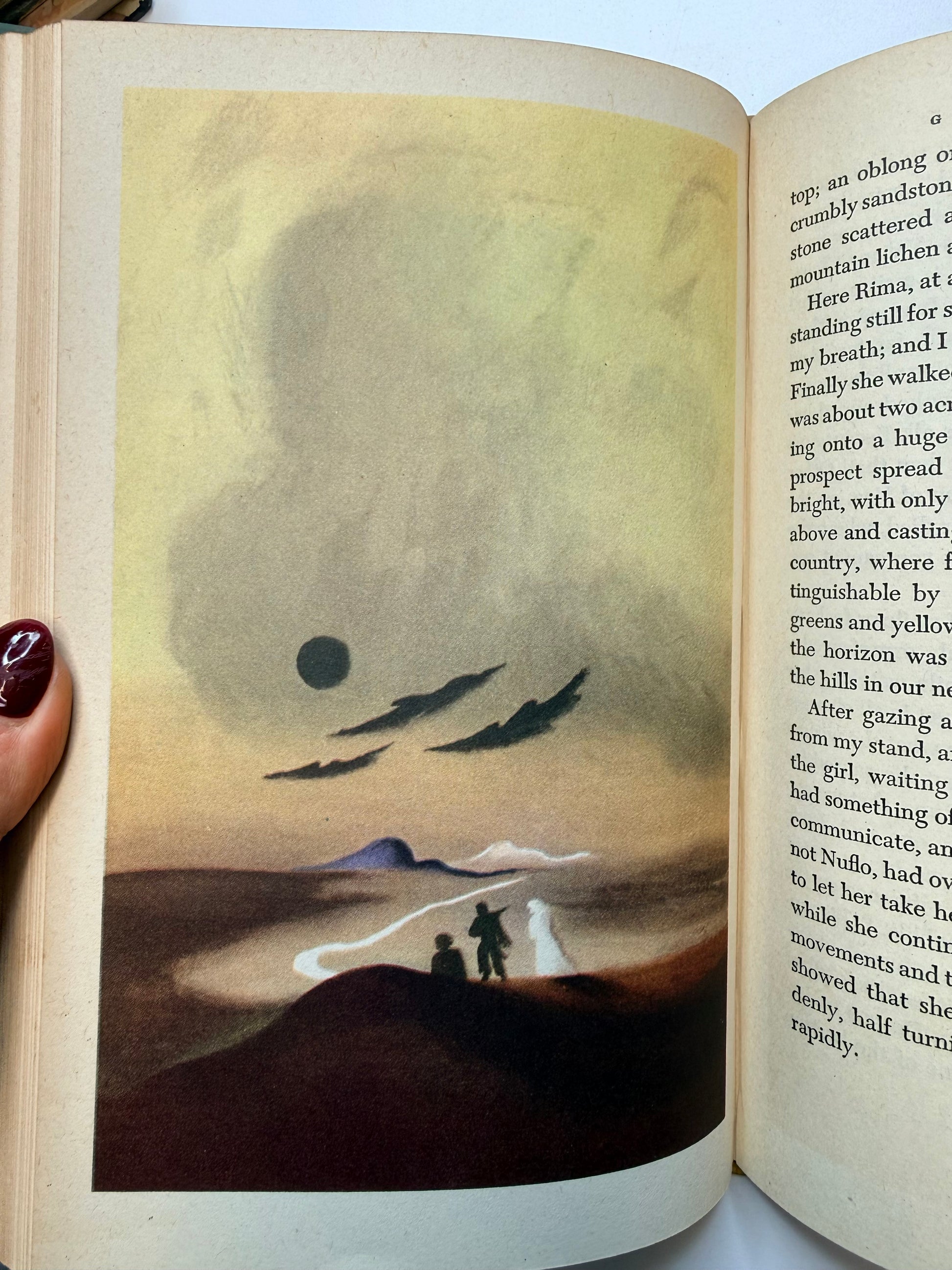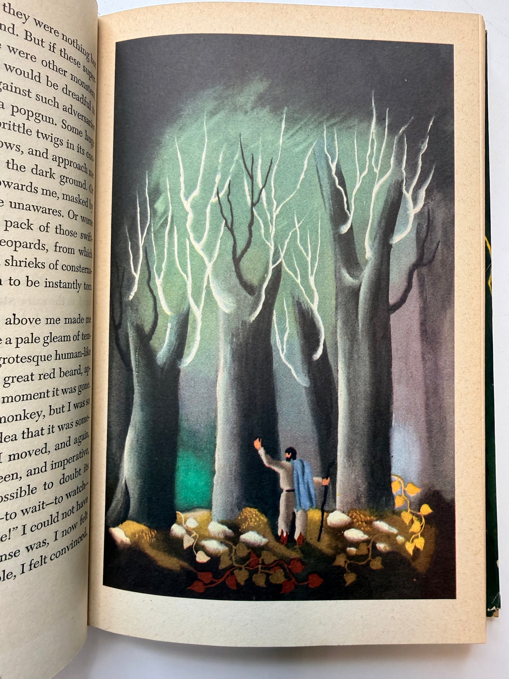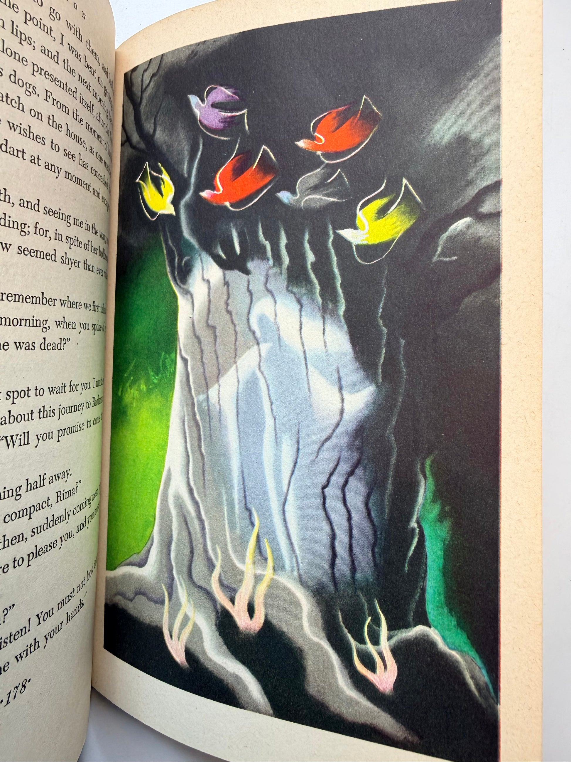 A vintage copy of Green Mansions, A Romance of the Tropical Forest by W H Hudson. Illustrated by E McKnight Kauffer. The book is full of beautiful full color illustrations throughout. The condition is good with soft pages and mild to moderate toning throughout. The lower cover corners are slightly bumped. Size: 8.65", 303 pages.