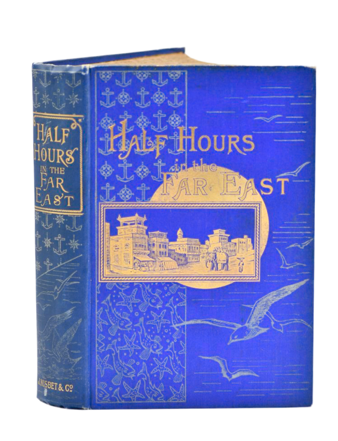 A beautiful edition of, “Half Hours in the Far East Among the People and Wonders of India with numerous illustrations”. From the Half Hours Library collection of Travel, Nature and Science for Young Readers. Copyright 1897. Published by James Nisbet & Co., London. Contents include Bombay, Poona, Colguam and Caves of Karli, Malabar Coast, Madras, Calcutta, Benares, Allahabad and Cawnpore, Lucknow, Agra, Delhi, and Among the Himalayas. The cover is a royal blue color cloth with bright gilt decoration. The backstrip cloth is somewhat faded to a more matte blue and the white decoration is lightly faded. There is a white spot on the lower backstrip as visible from the first picture. The back cover is good. The endpapers have a blue floral motif with a private collection sticker on the right endpaper. The pre-title pages are heavily foxed. There is a detailed illustration on the frontispiece. The interior pages are crisp / stiff and white with occasional foxing throughout. There is heavy foxing on the outer edge of the pages. The book is full of full and half-page black and white illustrations. Size: 7.5”, 345 pages.