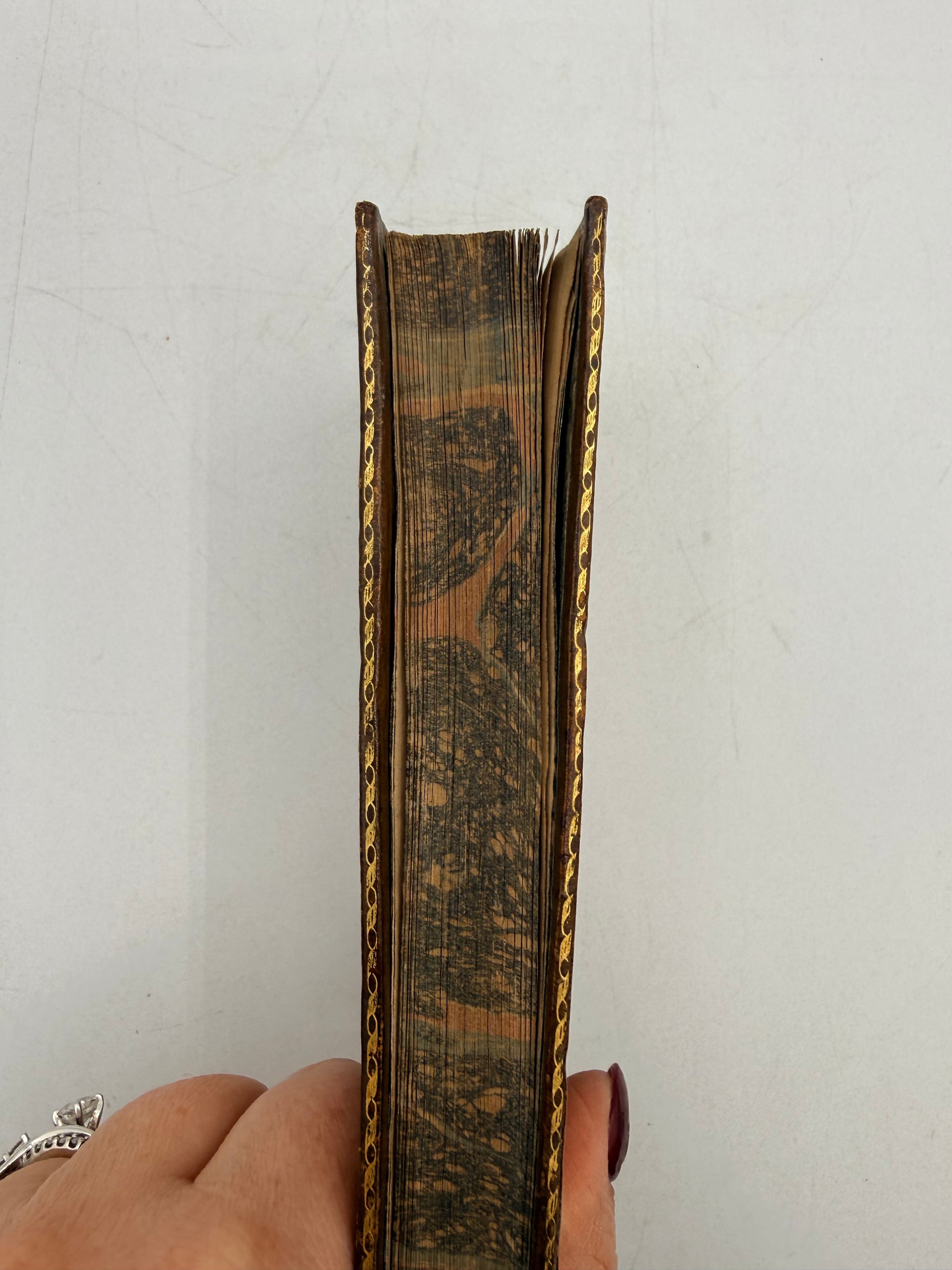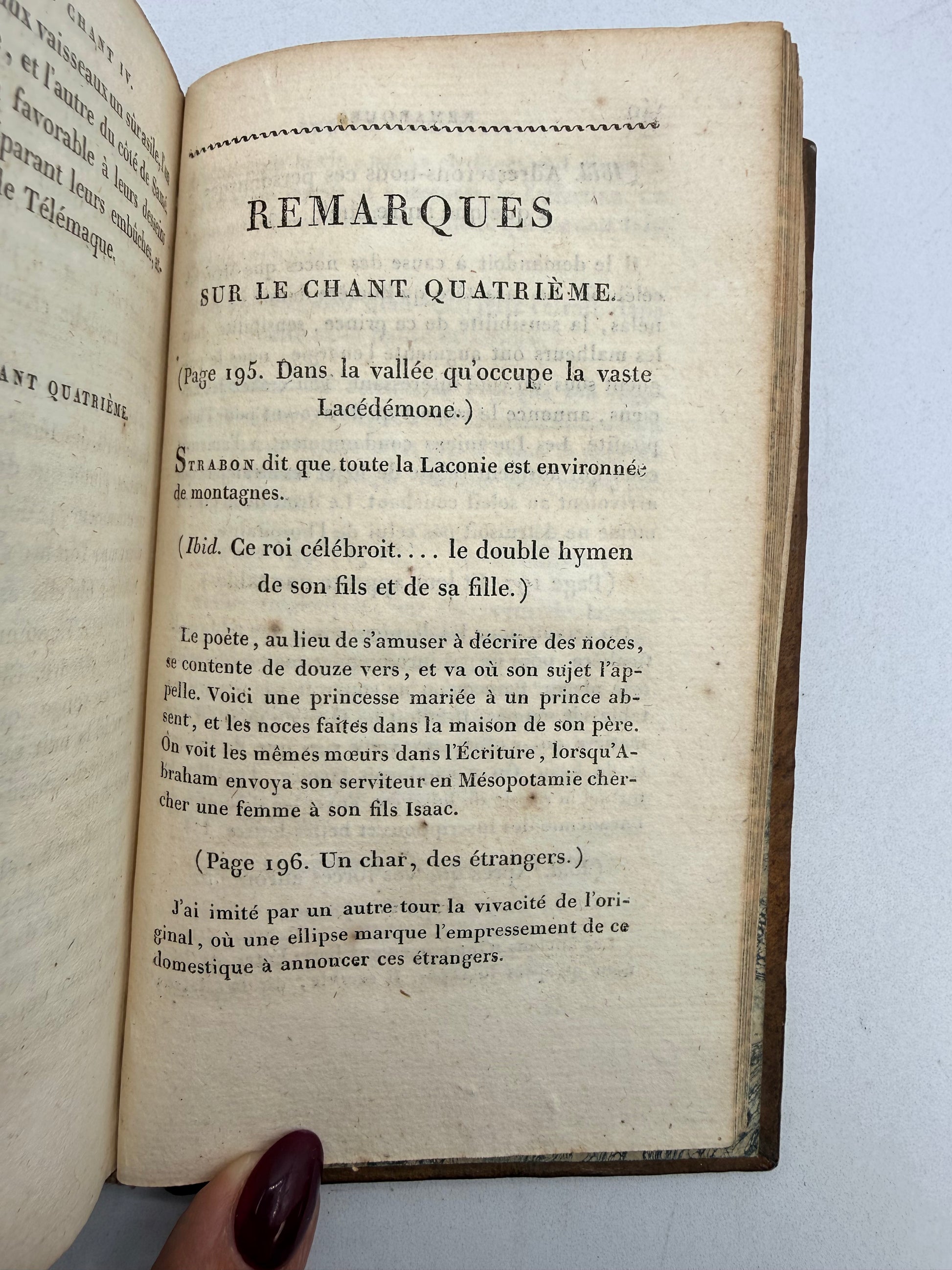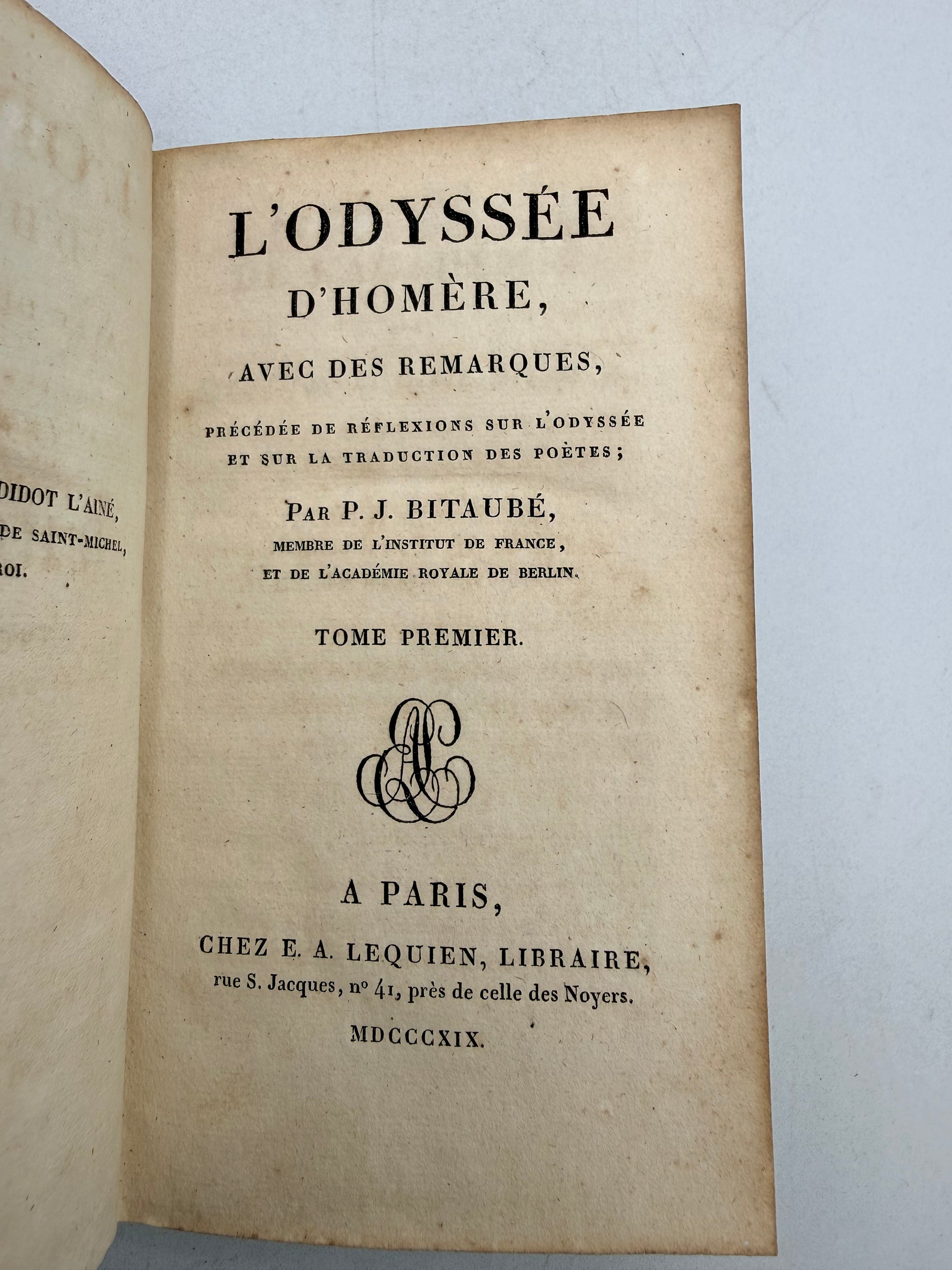 L’Odyssee D’Homère Avec des Remarques by Bitaube. Tome Premier (Vol 1). {The Odyssey of Homer with Remarks}. French language. Published by Lequien. The book has many remarks and notes on Odyssey and then the opening of Odyssey. Copyright 1819. Slight fading of the marbled foredge. There is some gilt loss on the back cover decoration. The book is full of remarks with a small section of the novel. Size: 5.5”, 262 pages.