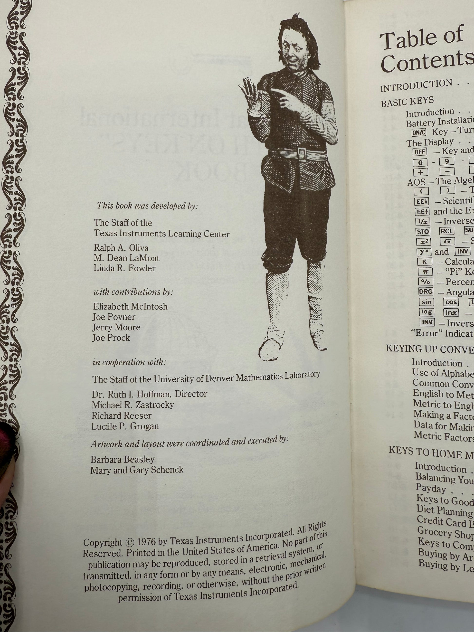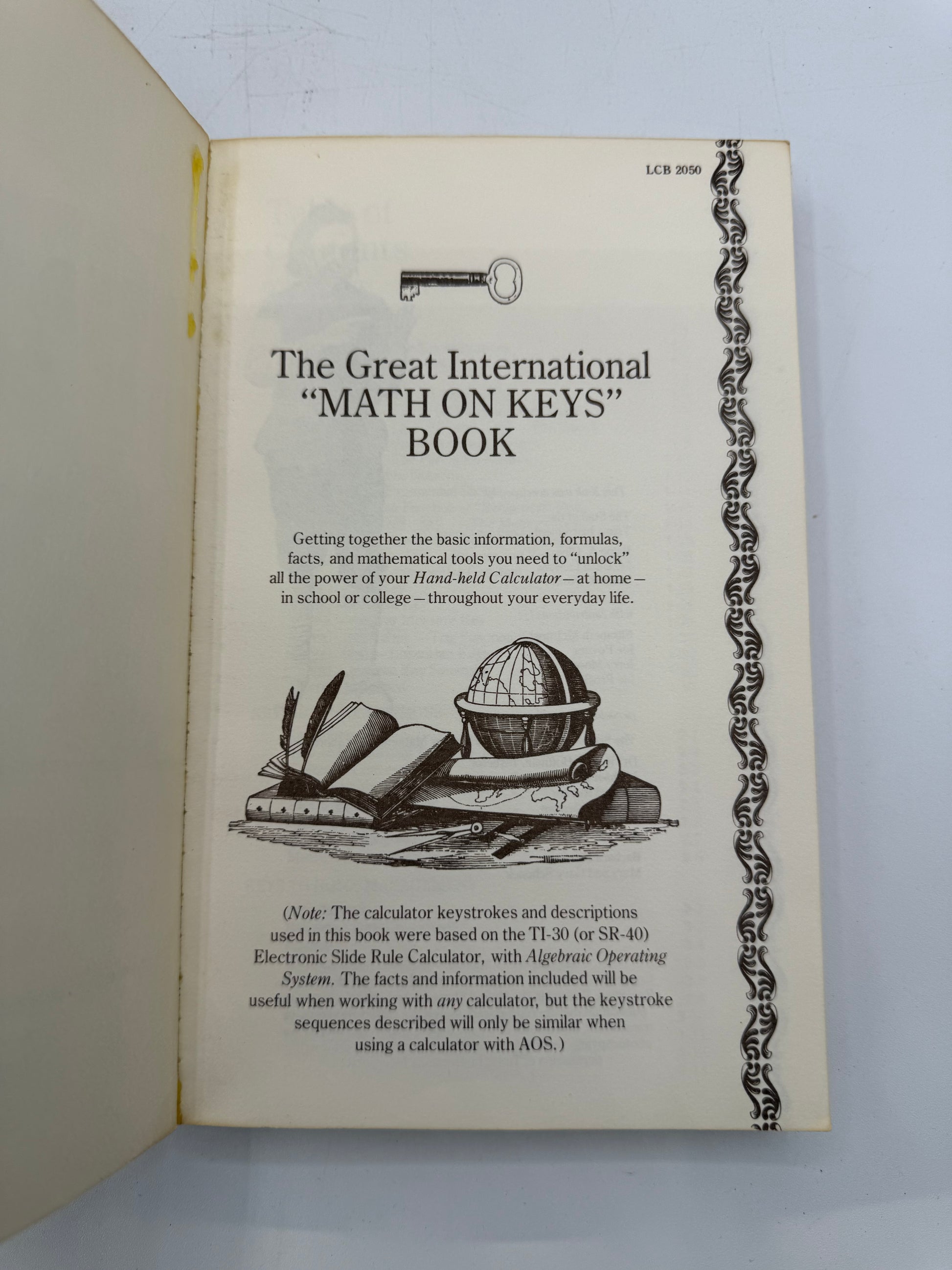 The Great International Math on Keys Book, Texas Instruments, vintage book. Priced 4.95. About math and calculator usage. Very good condition. Size: 8.25".