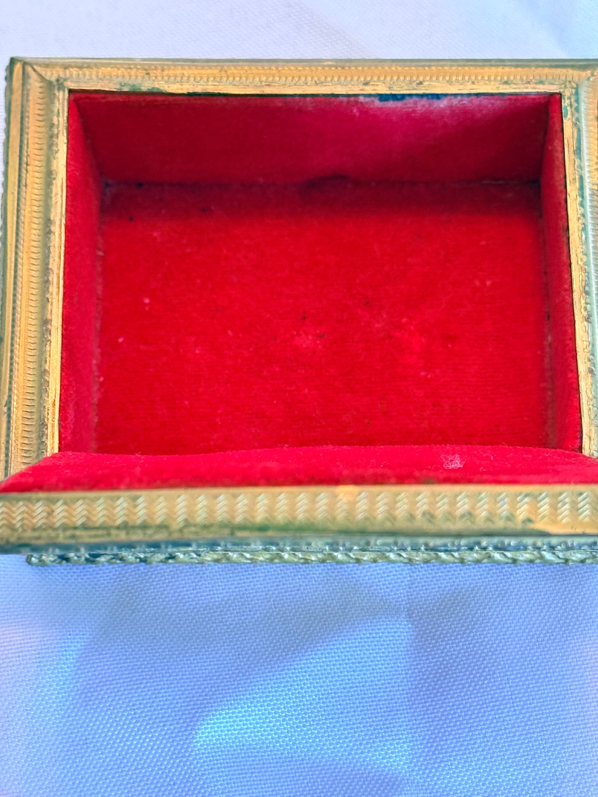 An exquisite Italian ormolu trinket or jewelry box with red velvet interior. The box has a female portrait centered on the top that resembles the Virgin Mary. The box has a hinge that is solid and tight. The interior portrait appears to be a print, but could be an original. The faux ivory panel on the top appears to be beige cloth. The lid has ormolu fixtures in the four corners and the metal sides have varying levels of gilding. There is a blemish in the red velvet cloth near the front edge (pictured). There are green felt base footings applied. Size: 4x3.25x1.5"