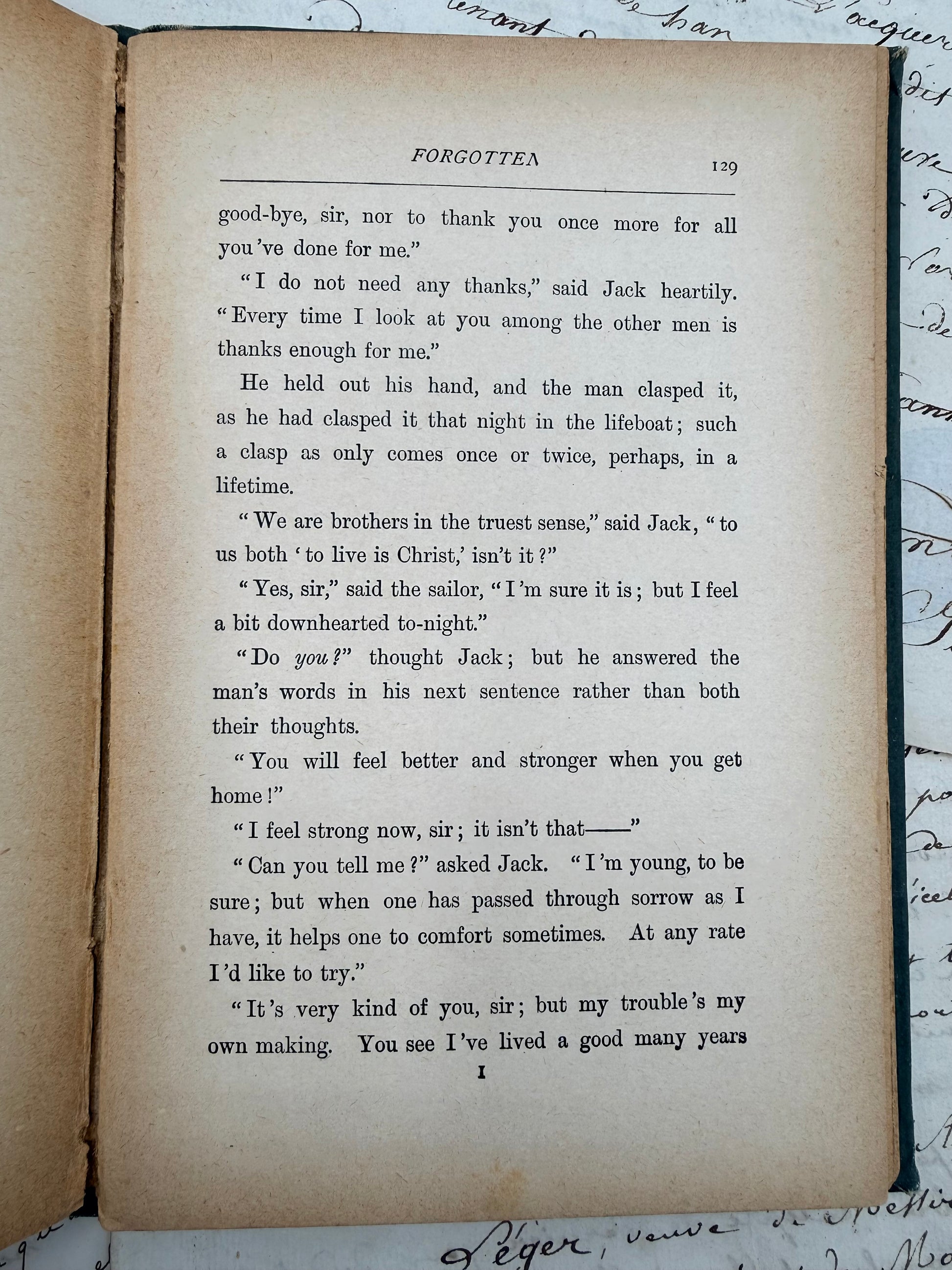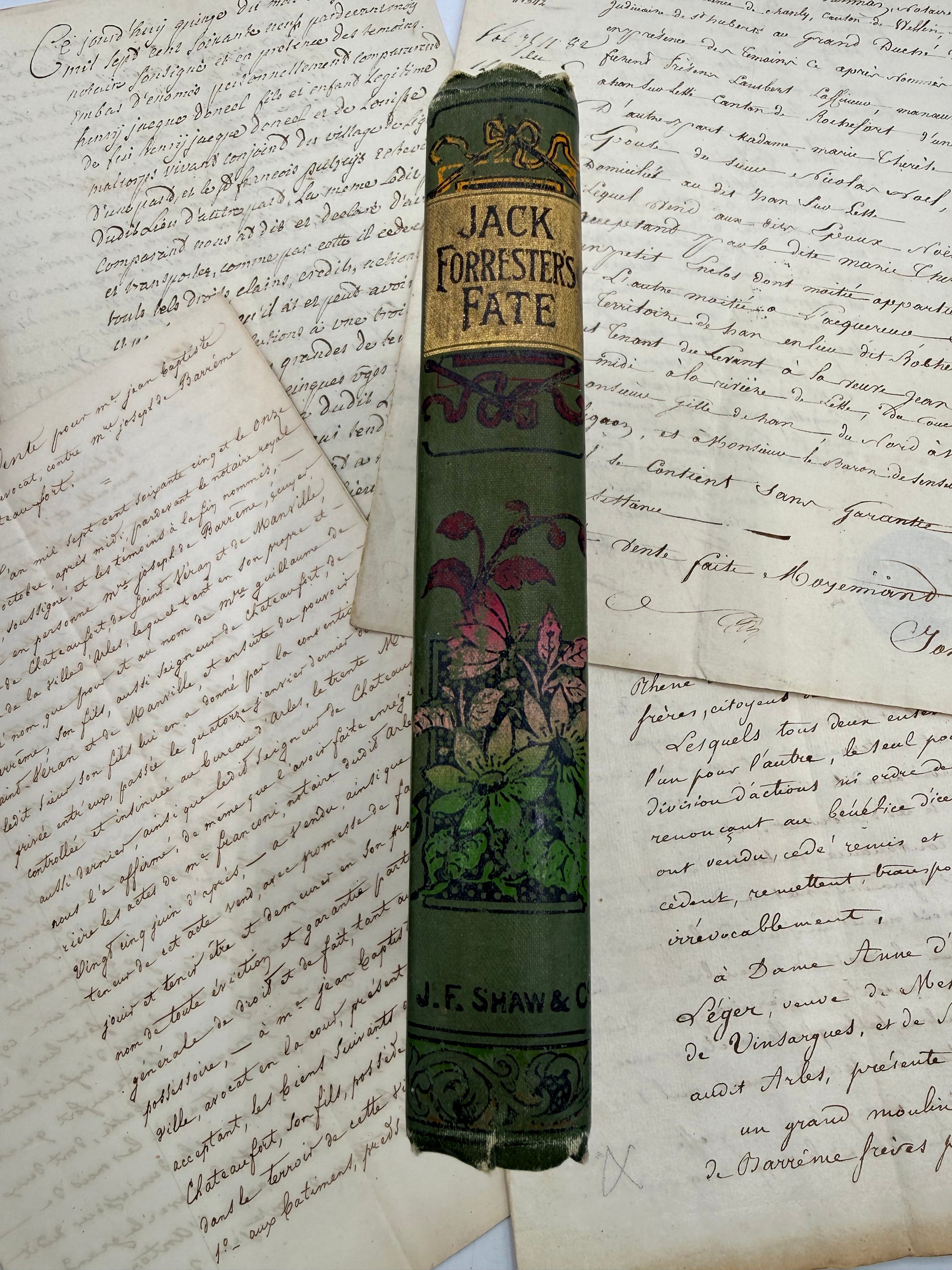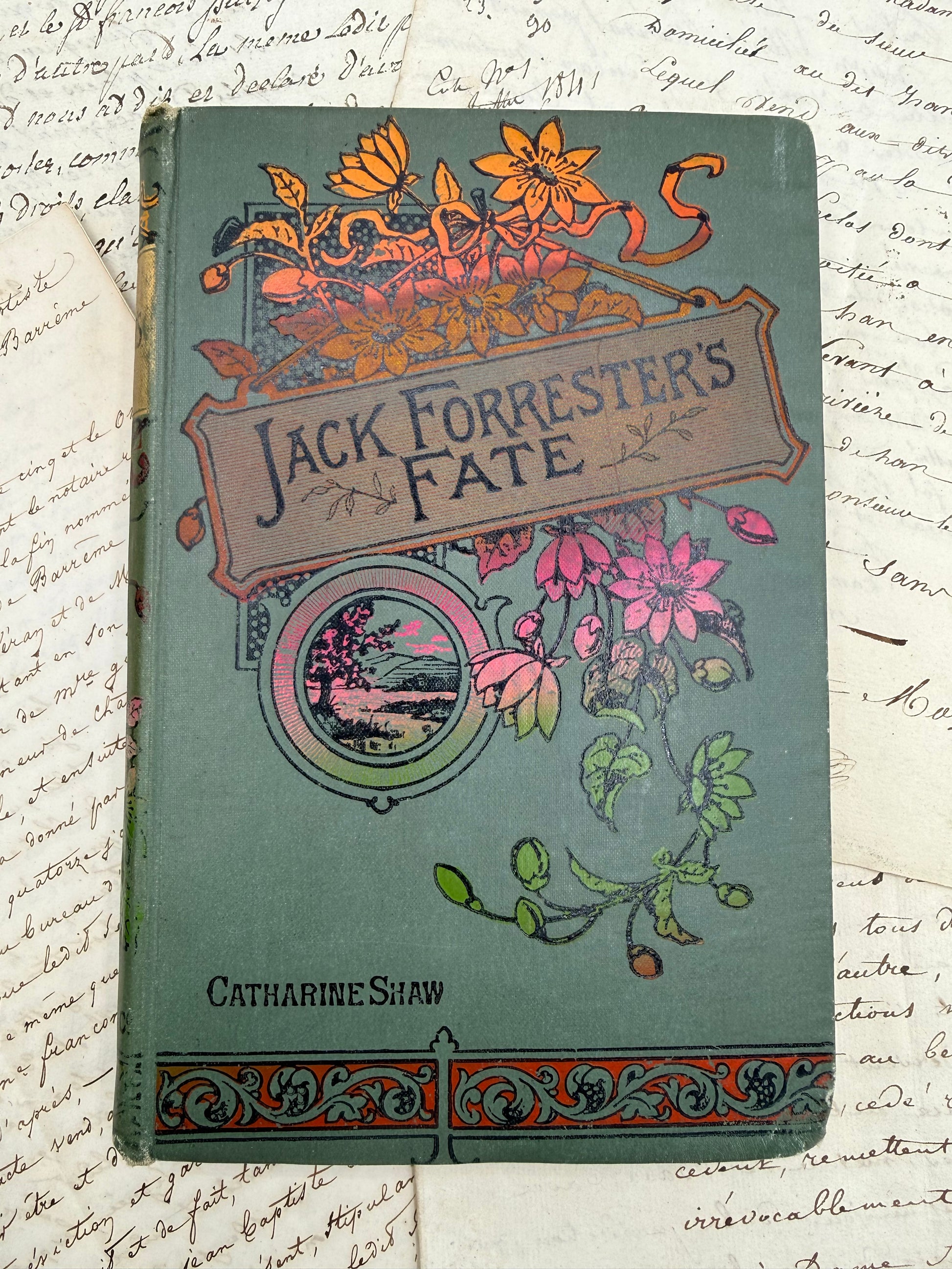 Jack Forrester’s Fate by Catharine Shaw. Published in a decorative, floral British binding by John F Shaw around 1900 or before (no date). The cover is a dark gray cloth with bright florals. The lower right cover corner bends downward. There are some lightly rubbed areas on the backstrip. There is heavy foxing on the endpapers. The pages have heavy toning throughout. There are a few black and white illustrations, including more in the rear advertising. 7.75", 192 pages.