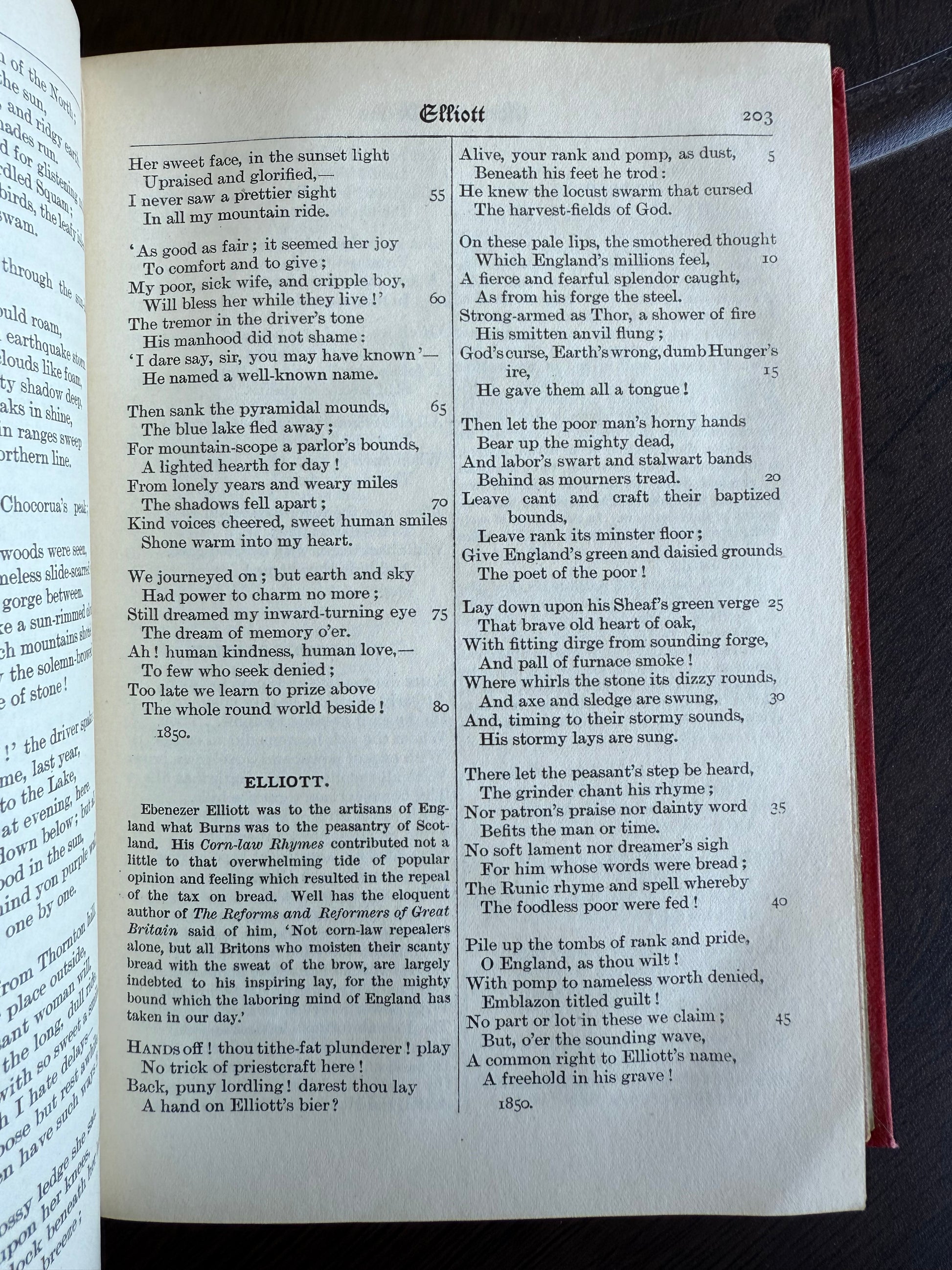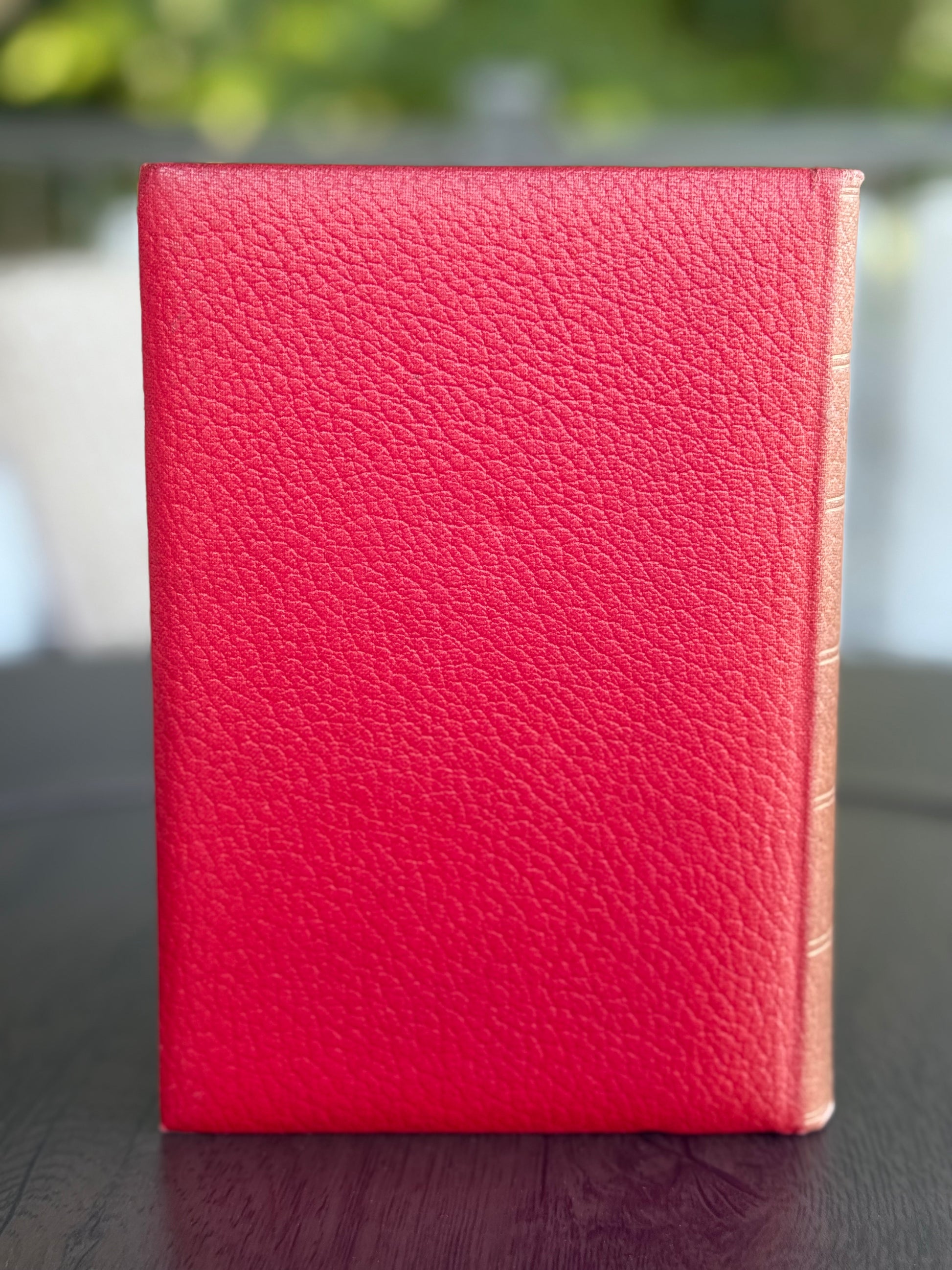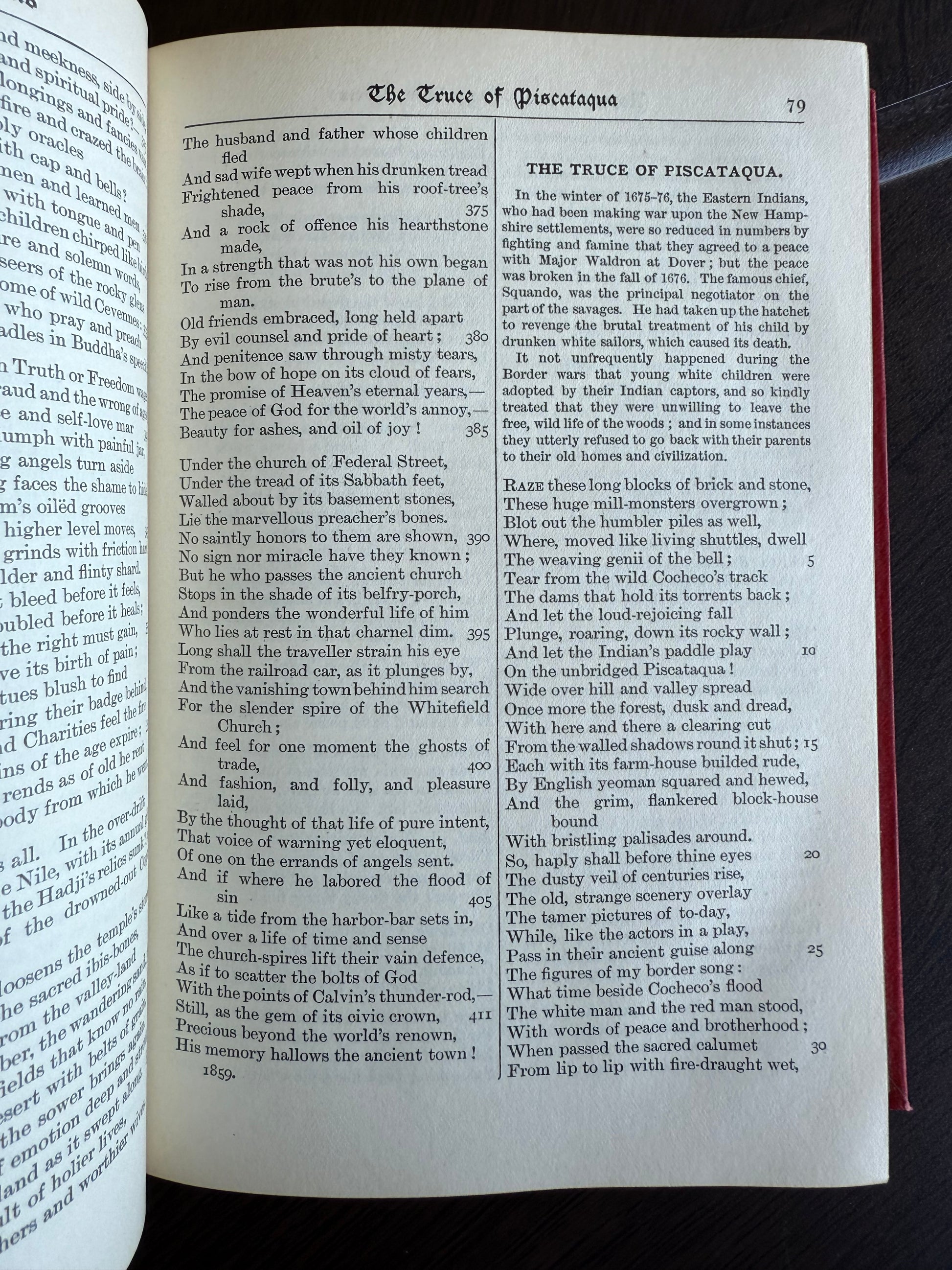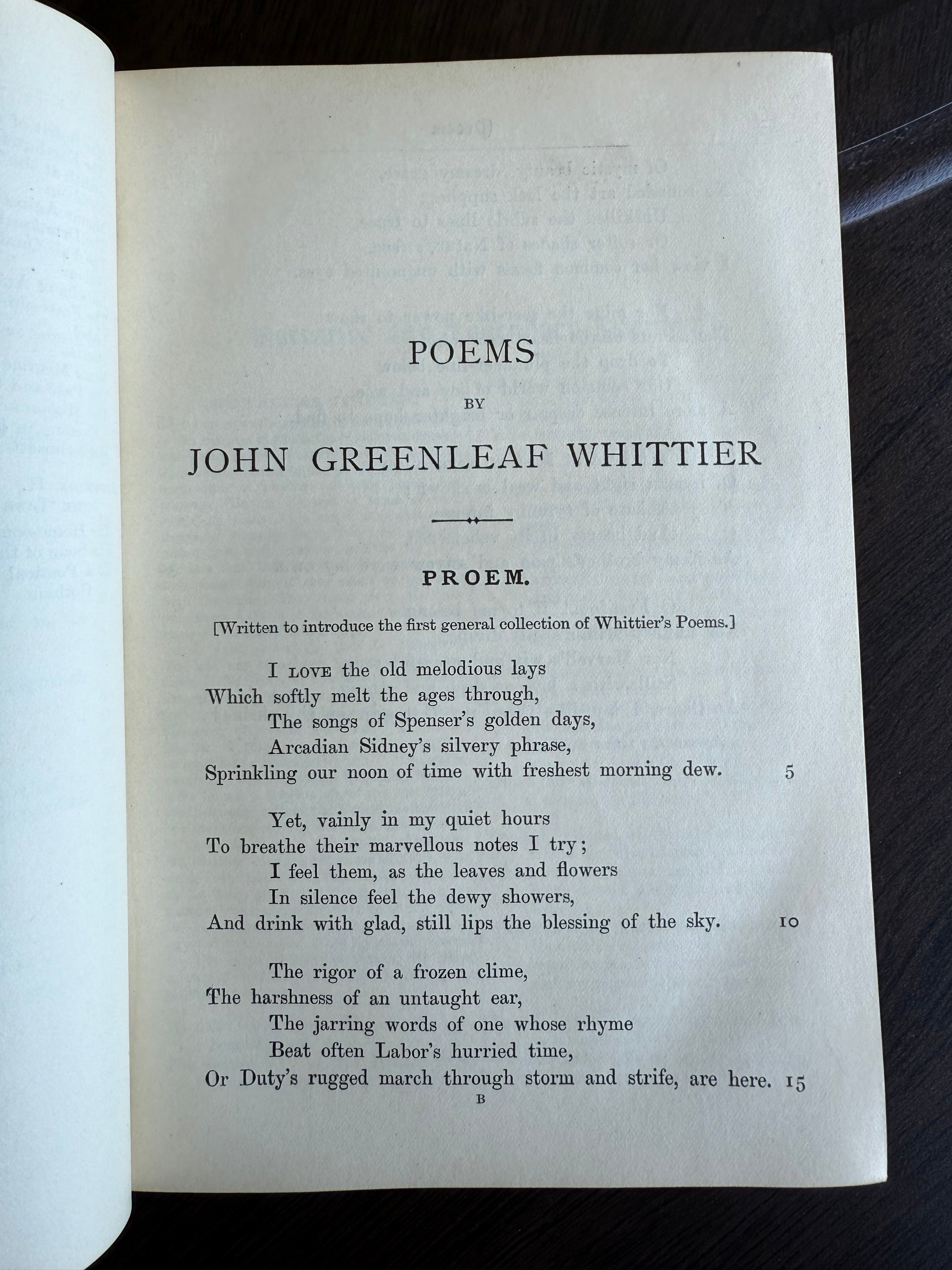 The Poetical Works of John Greenleaf Whittier. Copyright 1909. Published by Oxford University Press. Oxford Complete Edition. The cover is bright red with bright gilt red decoration and textured. There are small white flowers on the cover. The backstrip has been discolored (lightened). There is light wear or fraying on the upper backstrip. The endpapers have blue marbled paper. There is a frontispiece photo of the author. The pages are soft throughout and have mild toning. The outer edge is gilded on three sides. The original placeholder ribbon is included. 598 pages, size: 7.25"
