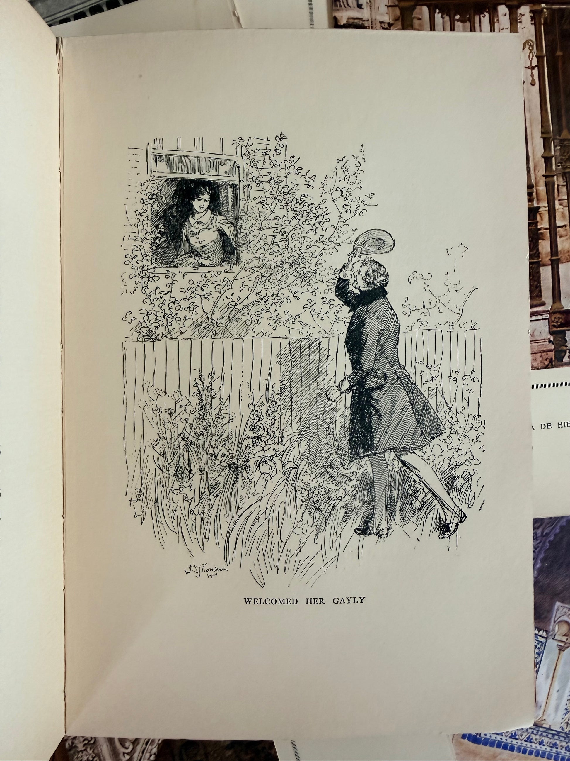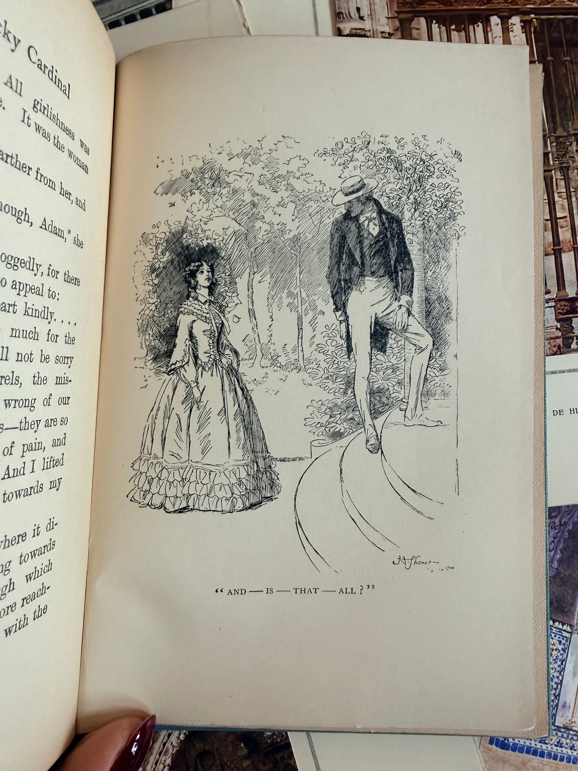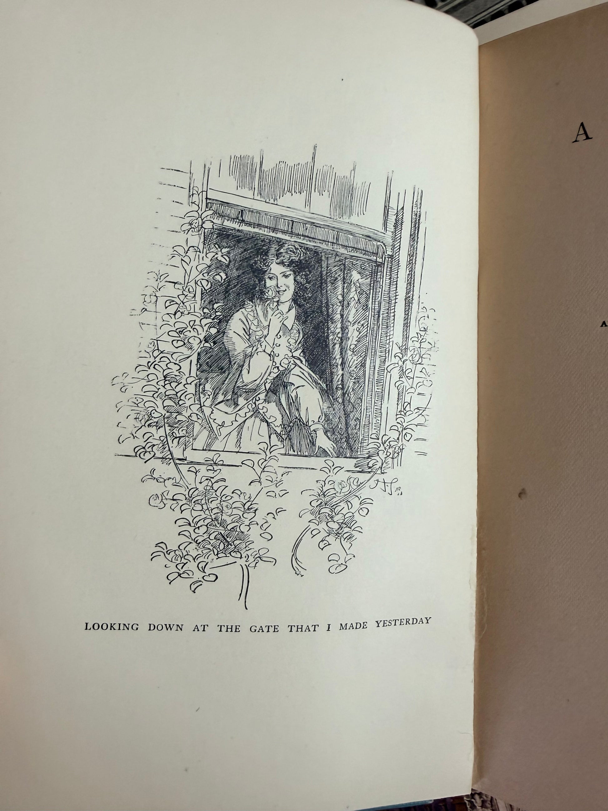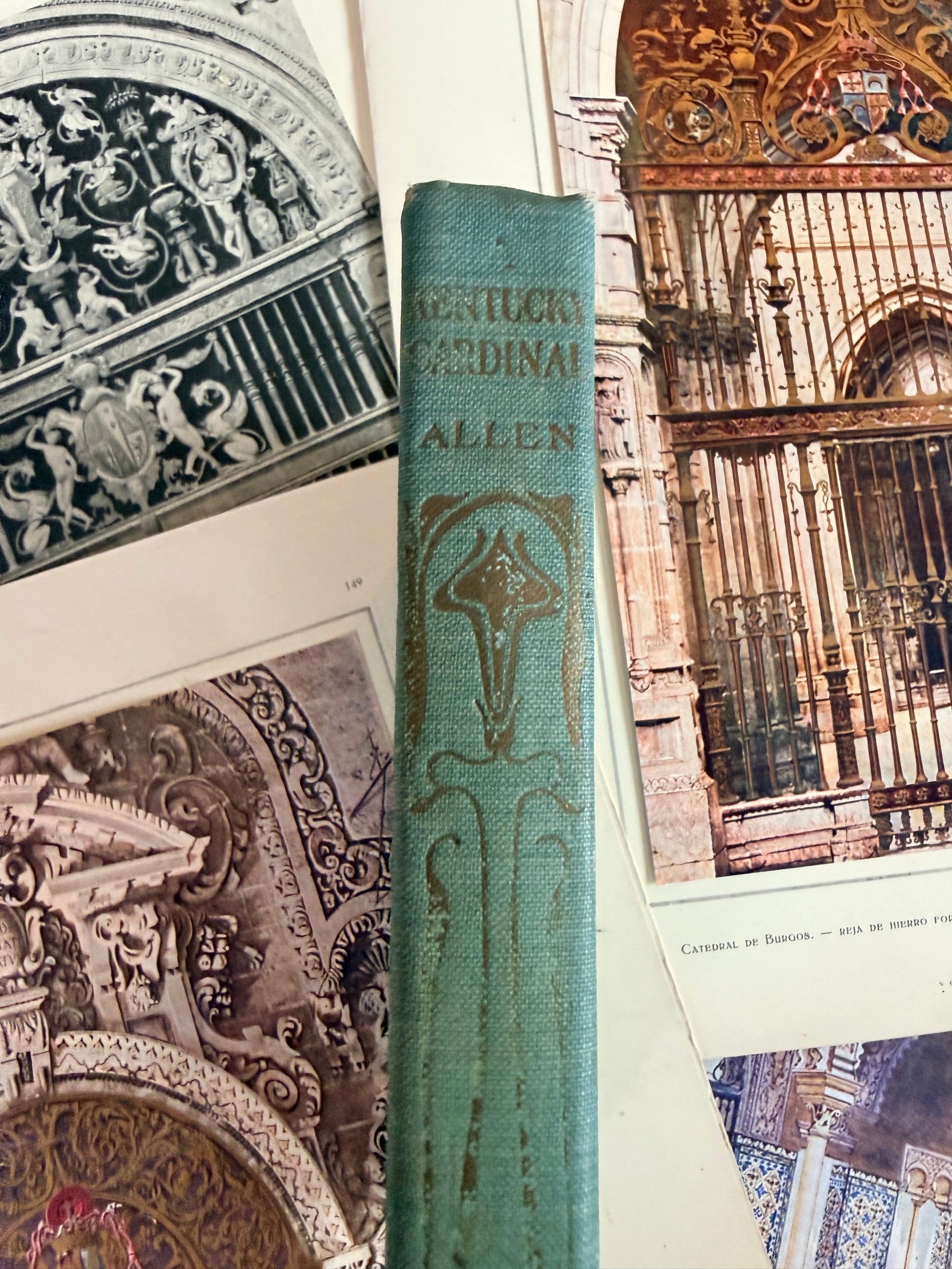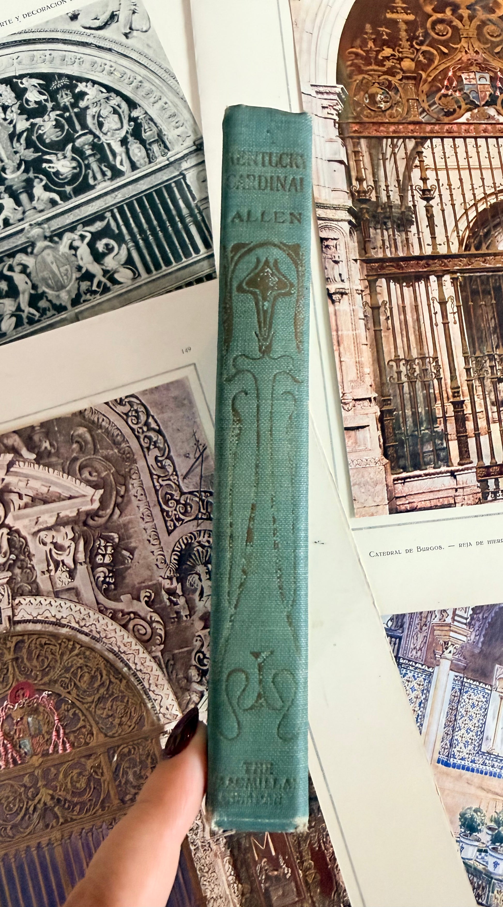 Kentucky Cardinal. Published by The Macmillan Company. Copyright 1906. The cover is aqua blue cloth with art nouveau style design. There is gilt loss on the backstrip. The pages are crisp and white throughout. Size: 7”, 138 pages.