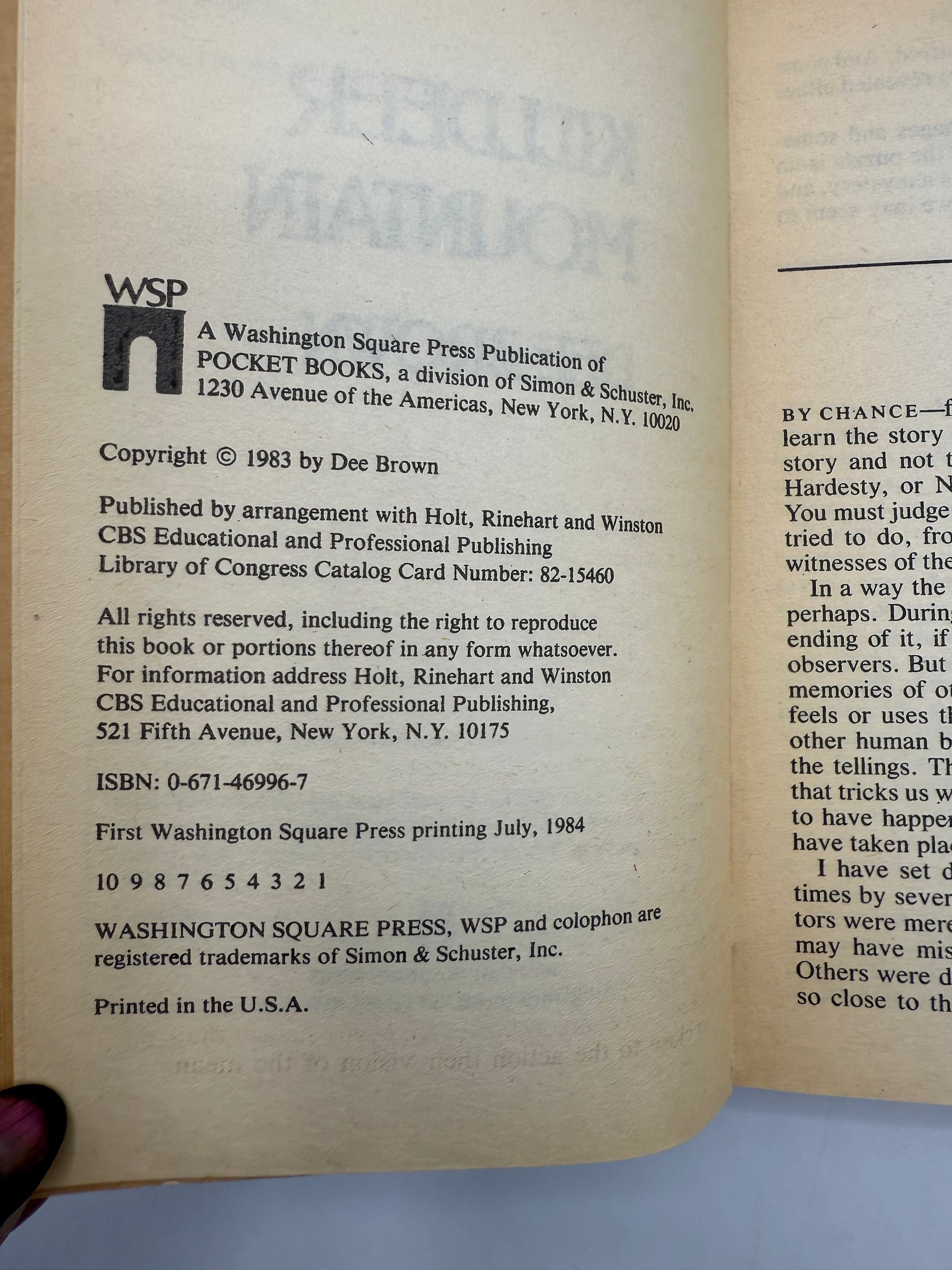 Killdeer Mountain by Dee Brown. Author of Bury Me at Wounded Knee. Washington Square Press. Copyright July, 1984. The pages are soft and clean with mild to moderate tanning throughout. There is a 0.5" vertical tear at the back cover and spine connection. Size: 6.75", 255 pages.