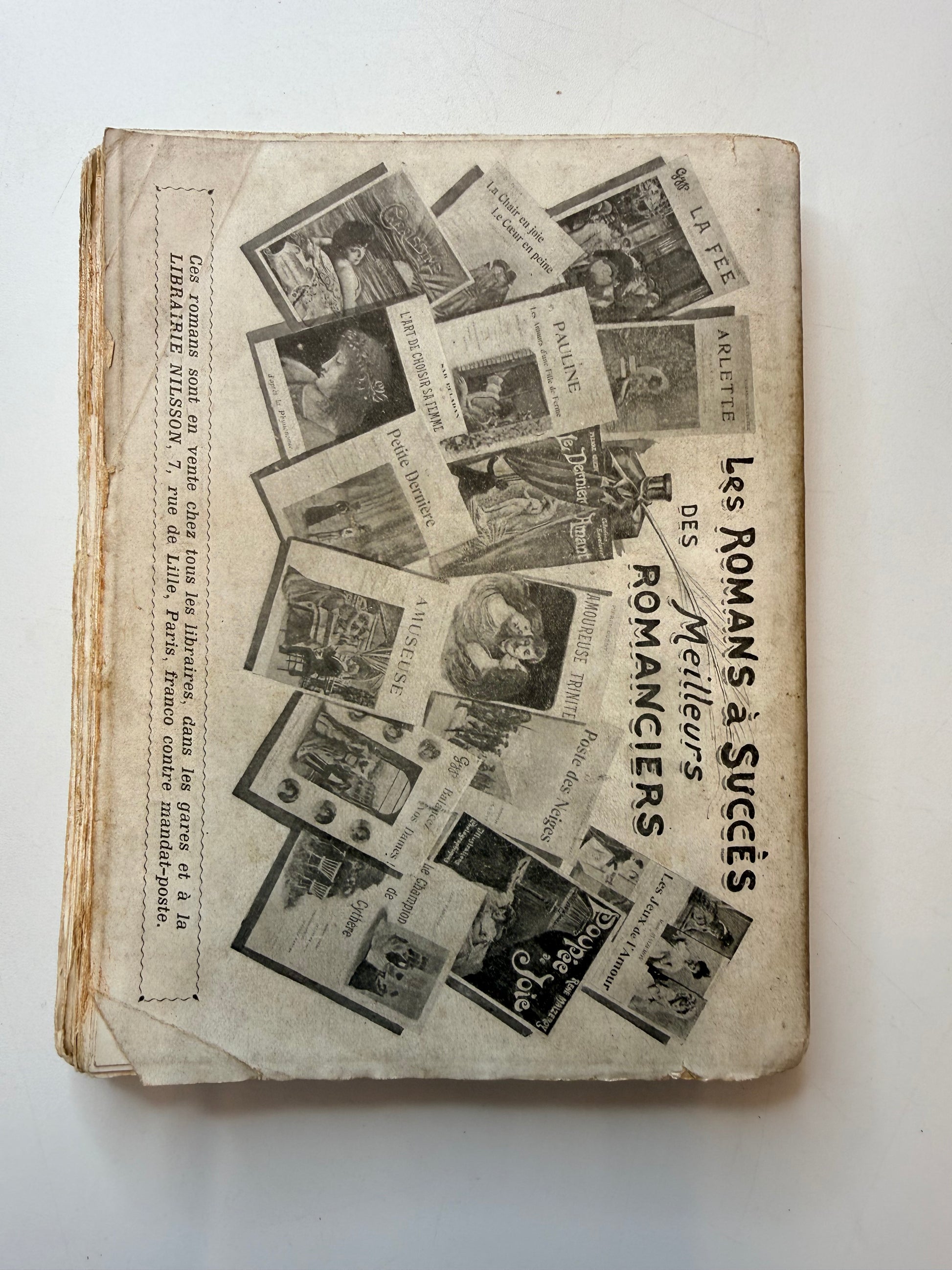 A vintage or antique soft cover novel with photographs. "Maman" or Mom (undated). Published by Librairie Nilsson, Paris. French language. The book has a romantic floral paper cover and leans forward slightly. The lower page corners curl upward. The cover and spine connection is partial separated. There are many partial and full page black and white photographic style images throughout on white pages. The cover feels fragile. 245 pages, 7.5"