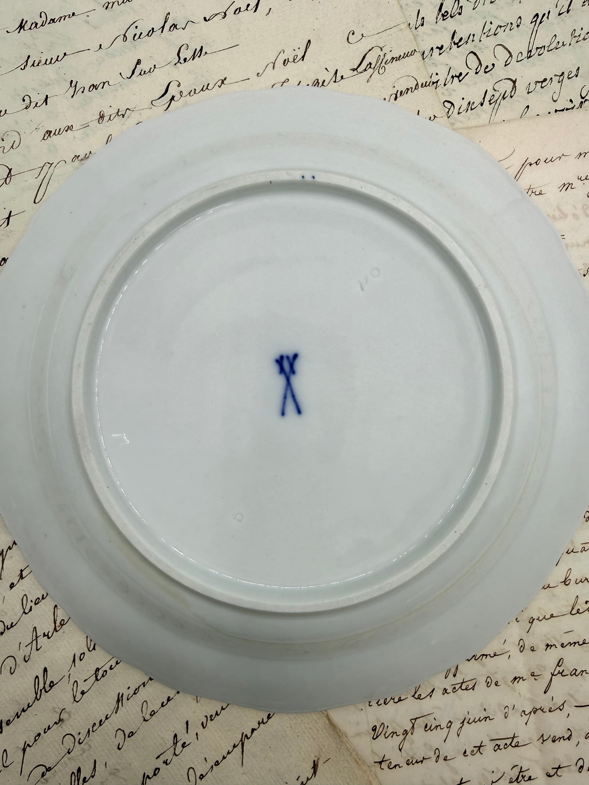 A German Meissen blue and white plate in onion style. The gold rim is good. The cobalt blue design is bright. There are no chips or cracks. Please see the back maker mark with a pressed mark to the upper right of it. Size: 7”.