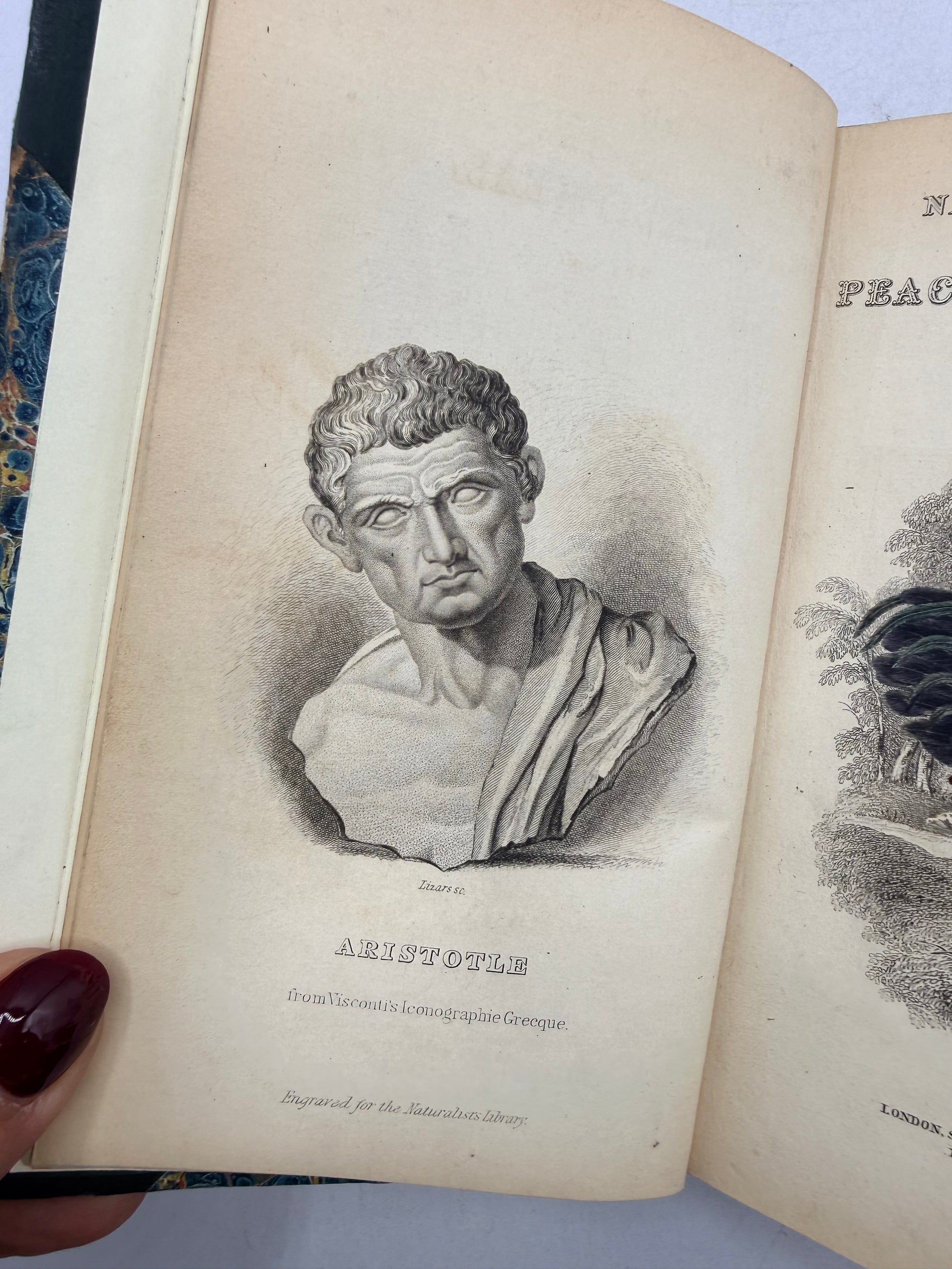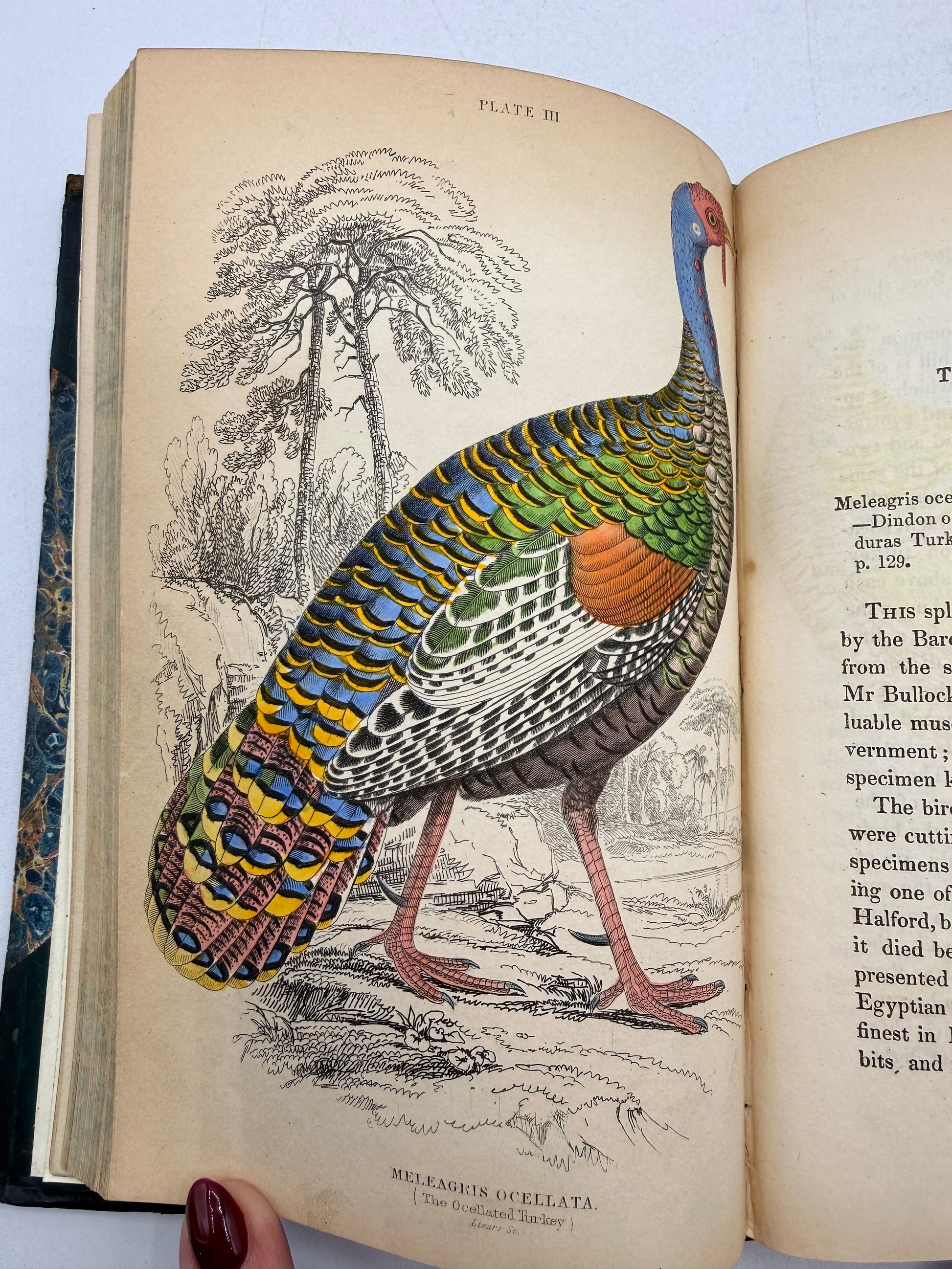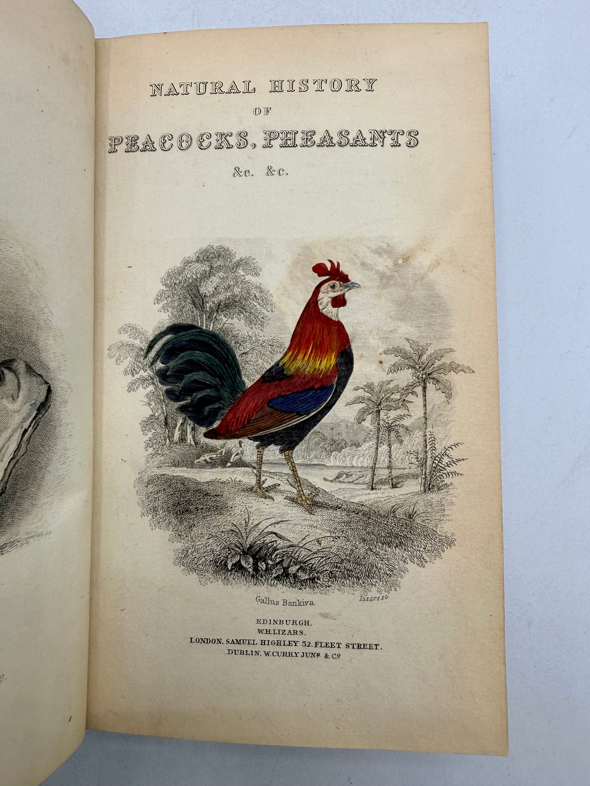 The Natural History of Gallinaceous Birds, Peacocks and Pheasants by Sir William Jardine Bart. Volume 1 with Memoir of Aristotle by Andrew Crichton. Published by W H Lizars, Edinburgh. Copyright 1836. Profusely illustrated with hand colored engravings after the memoir. Half leather with marble cover boards. The lower right cover corner leather is scraped. The marbled on the foredge is fading. Size: 6.5", 232 pages.