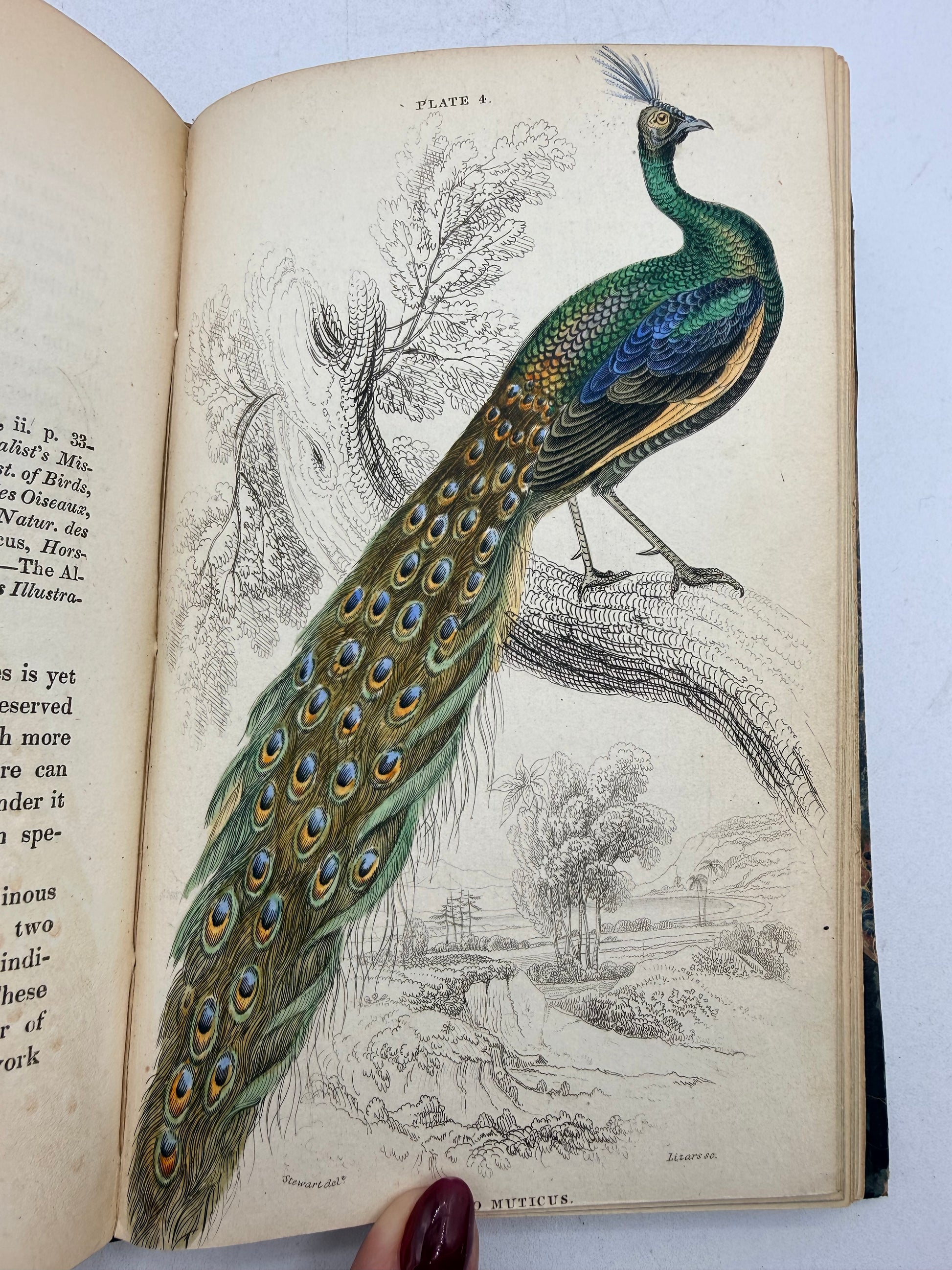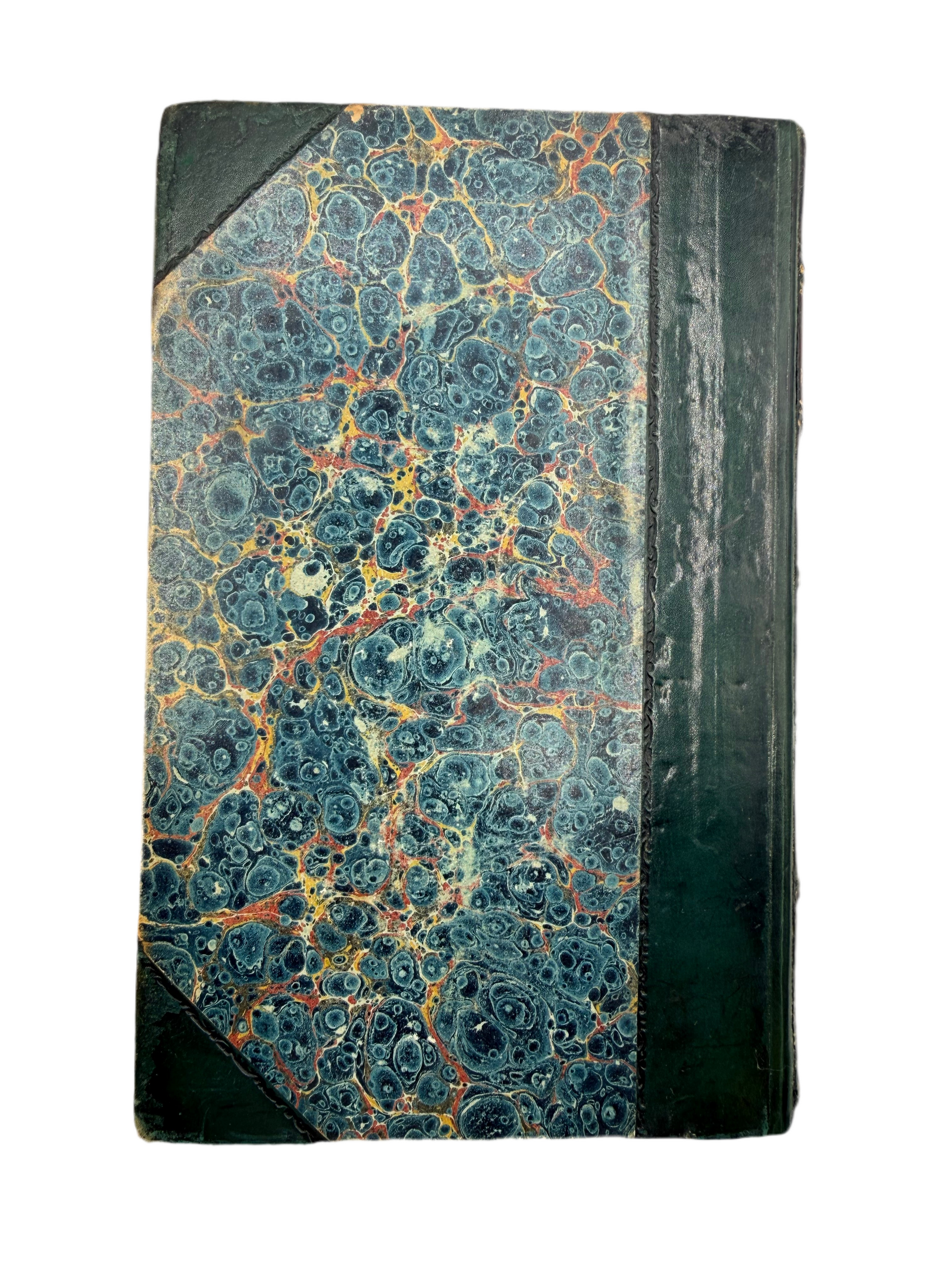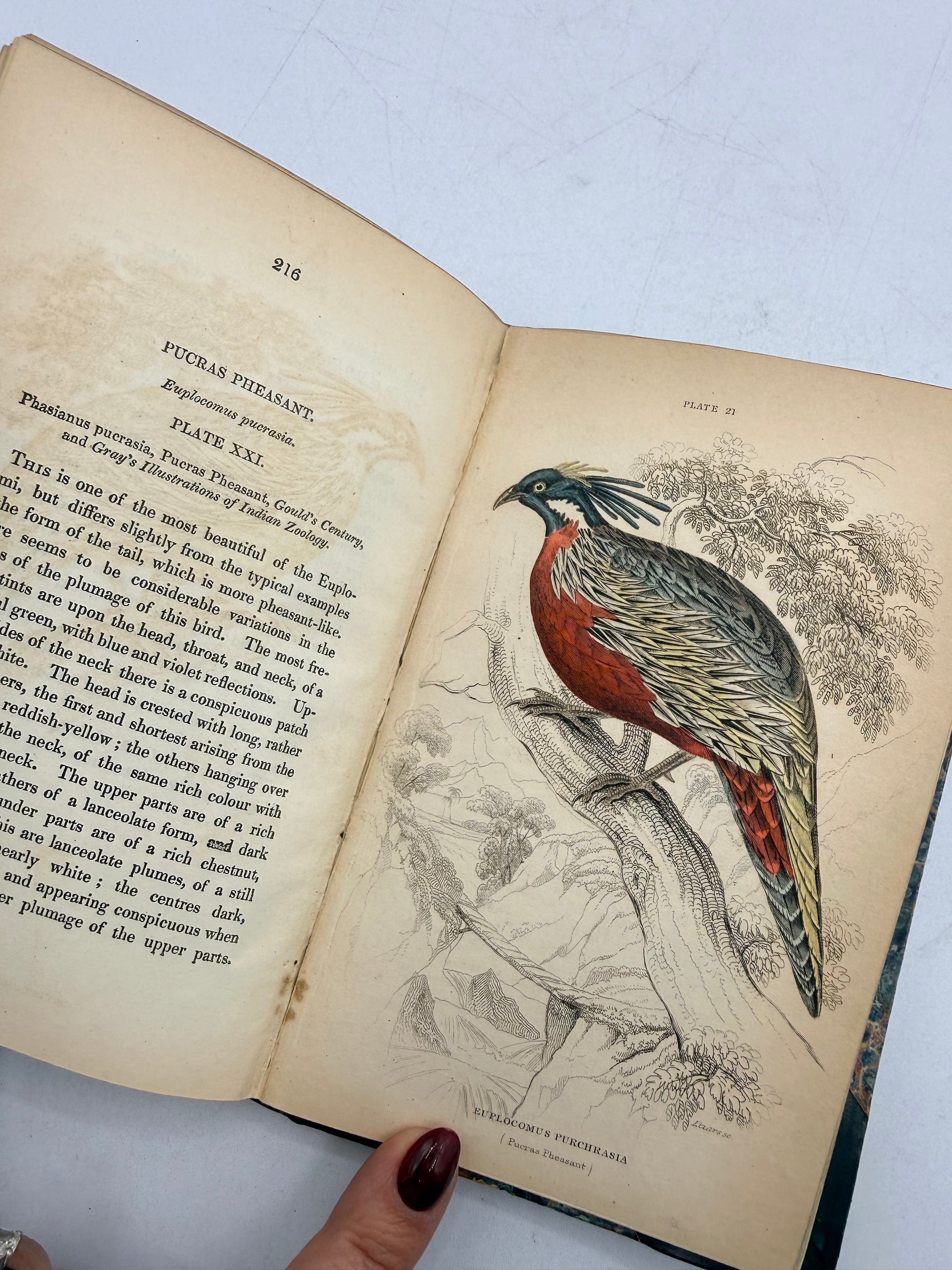 The Natural History of Gallinaceous Birds, Peacocks and Pheasants by Sir William Jardine Bart. Volume 1 with Memoir of Aristotle by Andrew Crichton. Published by W H Lizars, Edinburgh. Copyright 1836. Profusely illustrated with hand colored engravings after the memoir. Half leather with marble cover boards. The lower right cover corner leather is scraped. The marbled on the foredge is fading. Size: 6.5", 232 pages.