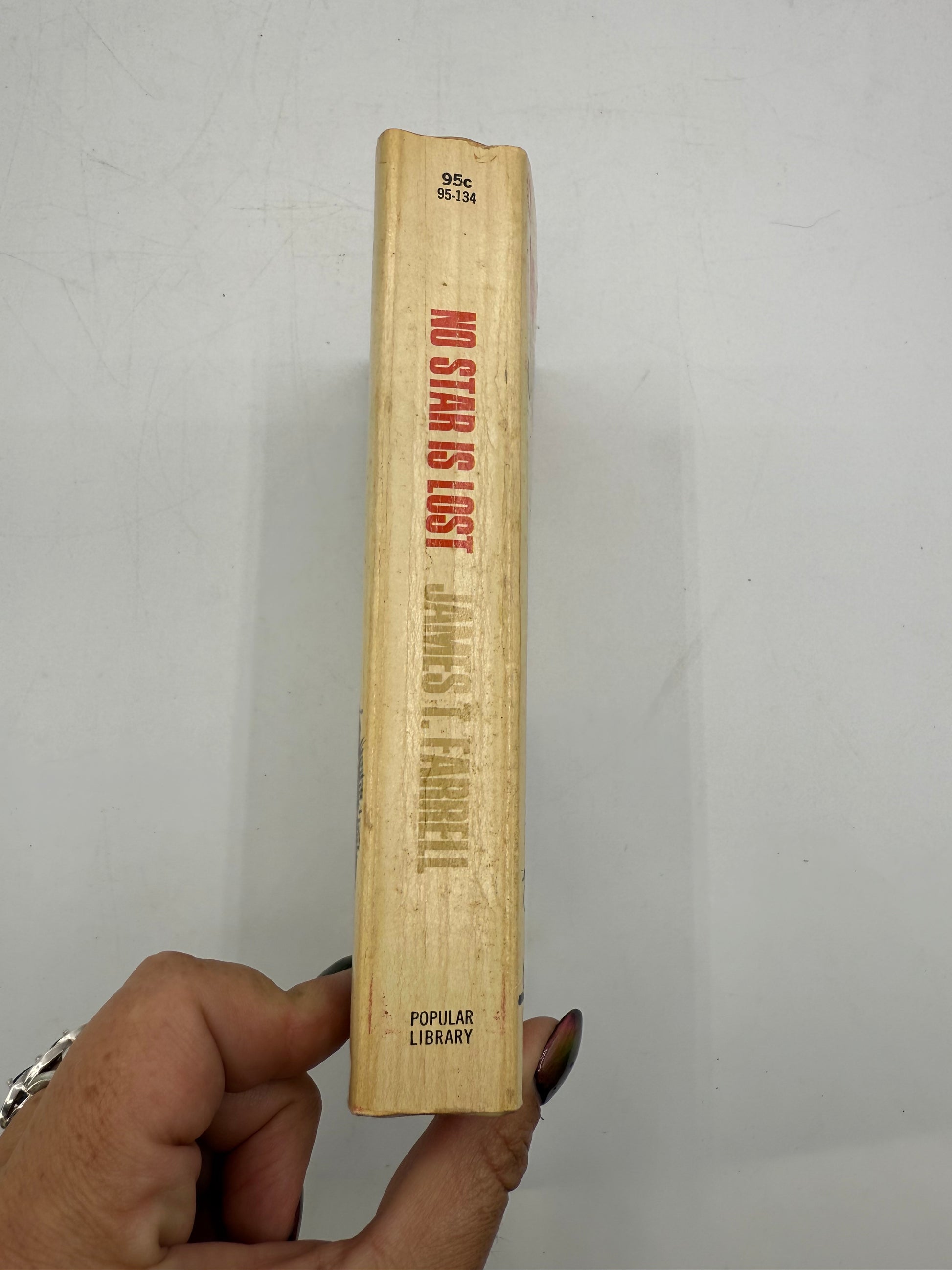 No Star is Lost by James T Farrell. Popular Library publishing. Copyright August, 1944. Set on Chicago's Southside. The lower corner on the back bends upward. There is toning on the cover. Please see photos for condition. There is a penned signature on a pre-title page. There is moderate page toning throughout. Size: 7", 509 pages.