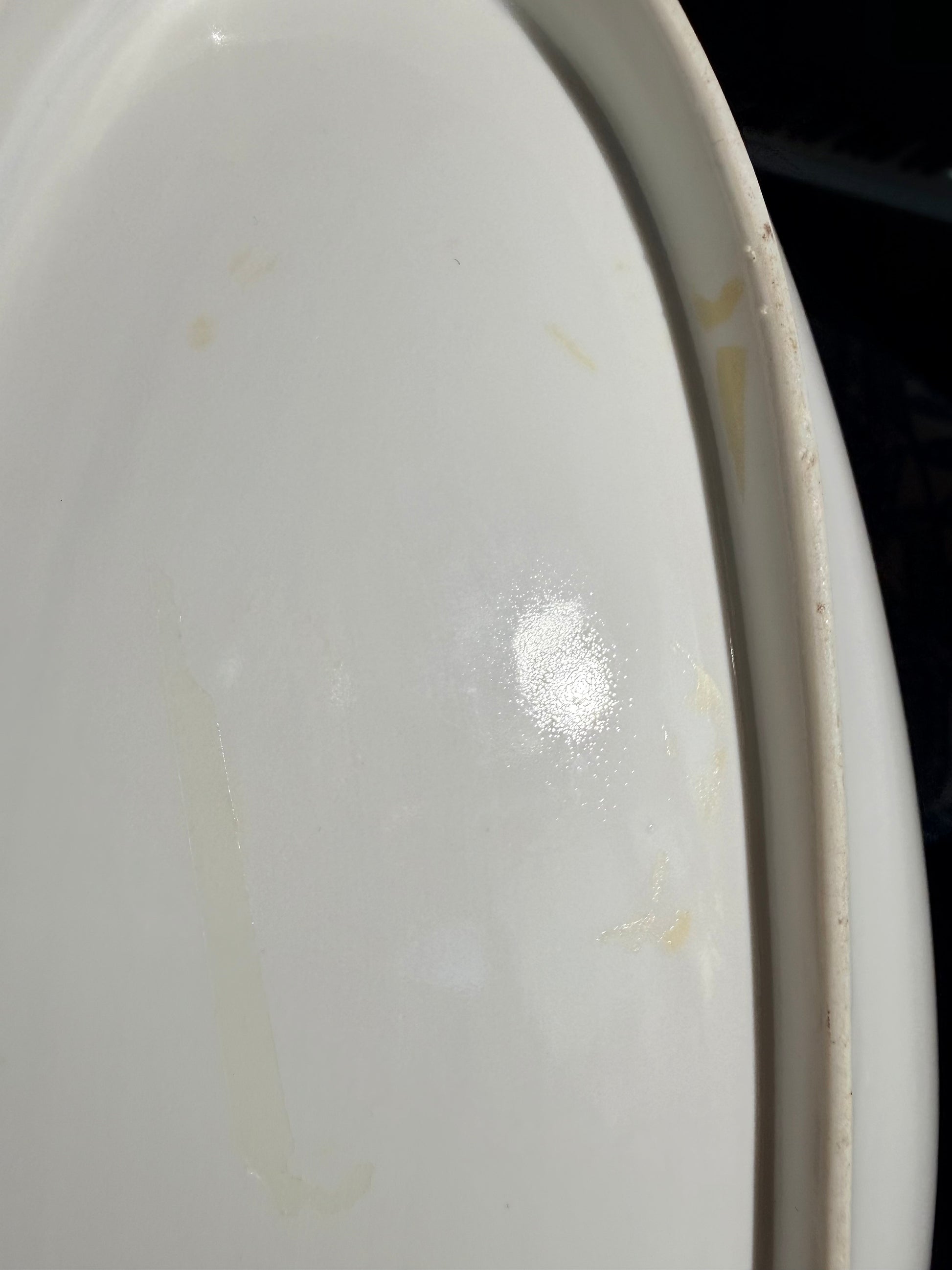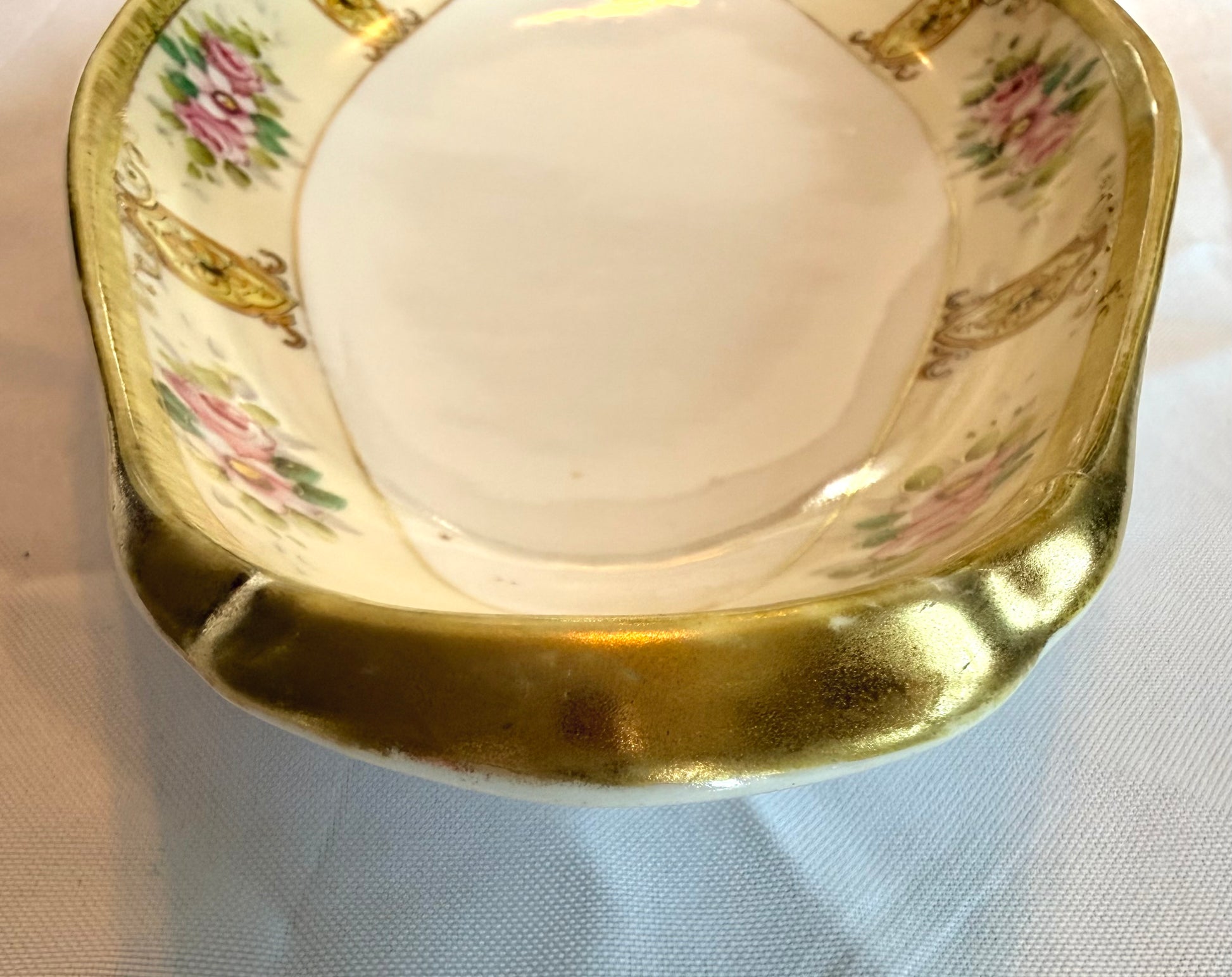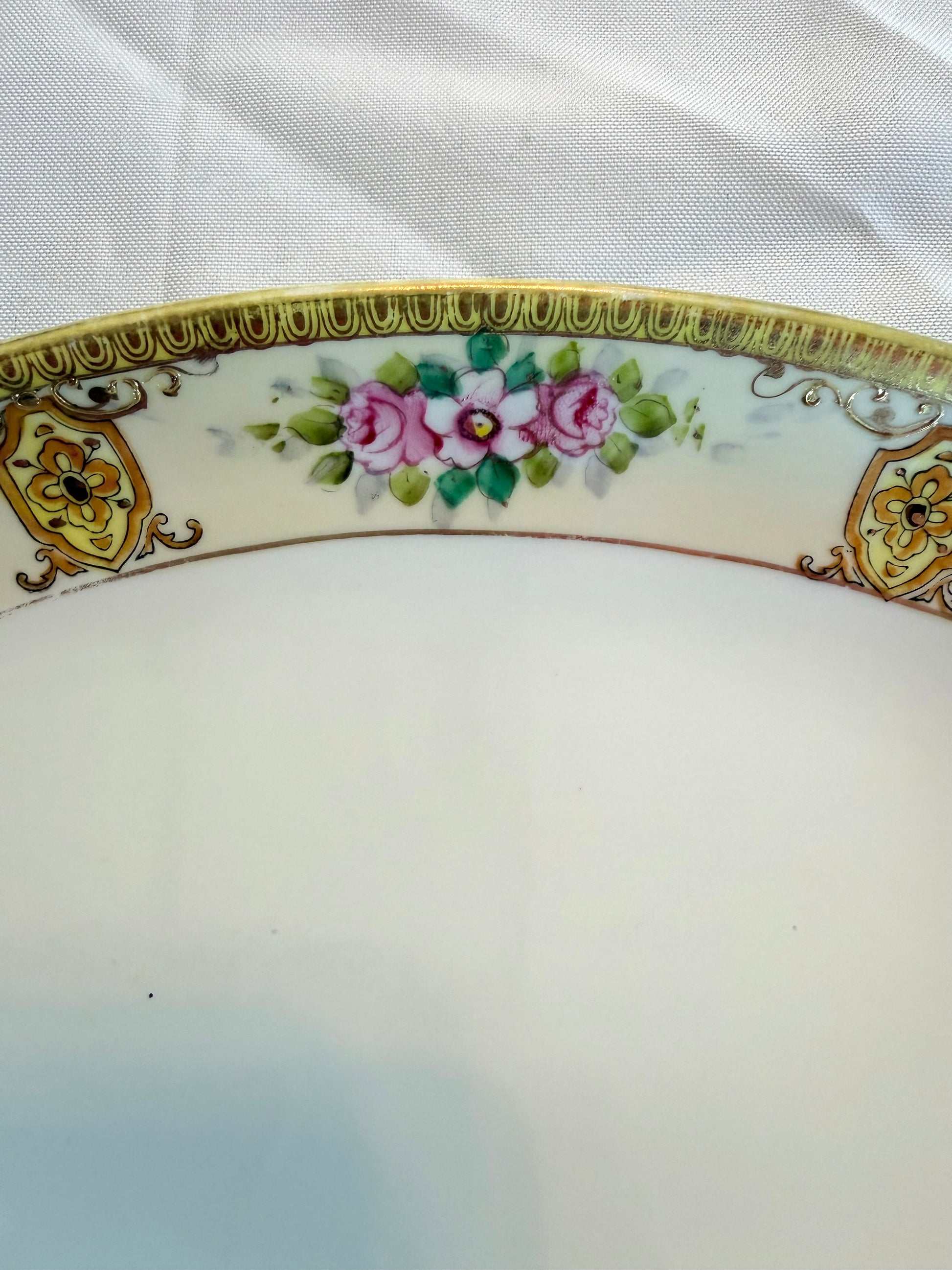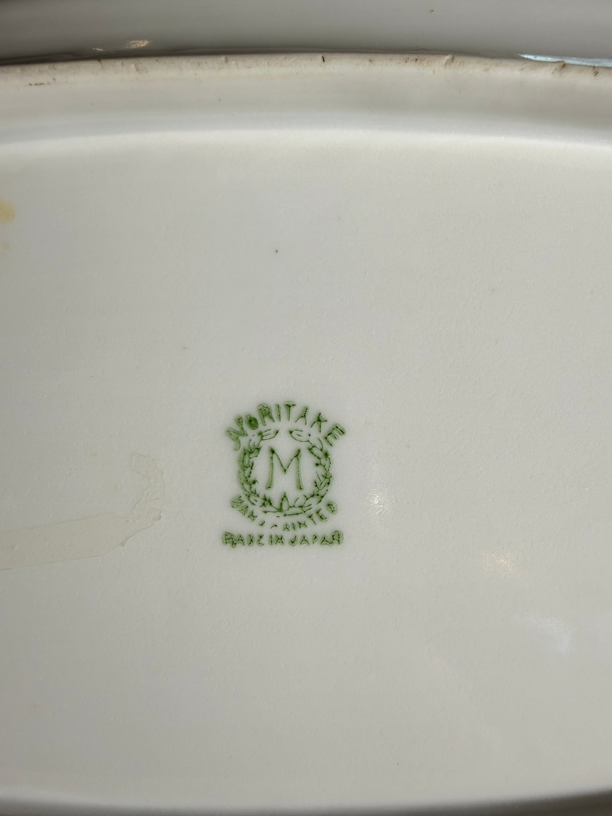 An oval concave serving dish with artistic painted edge design including pink flowers. The dish has a gilded rim and handle area. There are very small dark circular marks on one end. The base has some yellow markings (pictured). The dish sits on an oval footing. There may some gilt loss along the outer edge. "Noritake, Made in Japan" is stamped on the base. Size: 12.5x6”