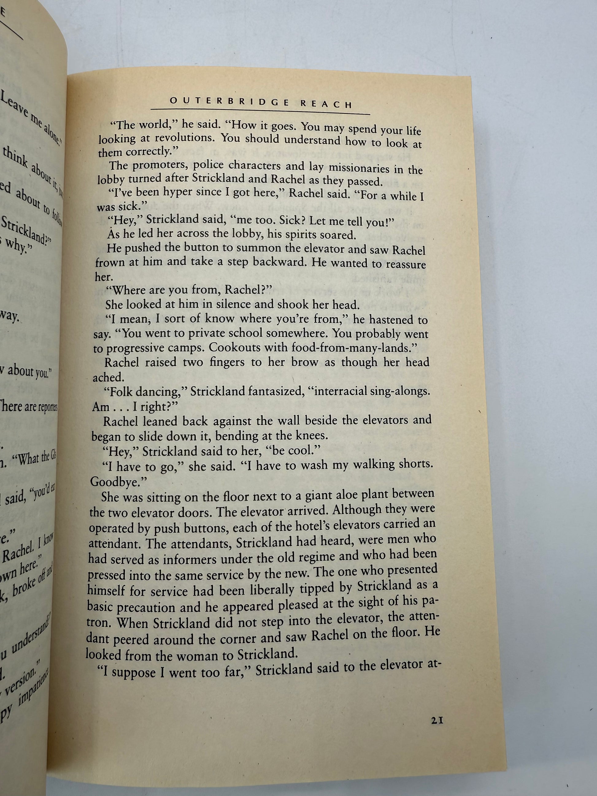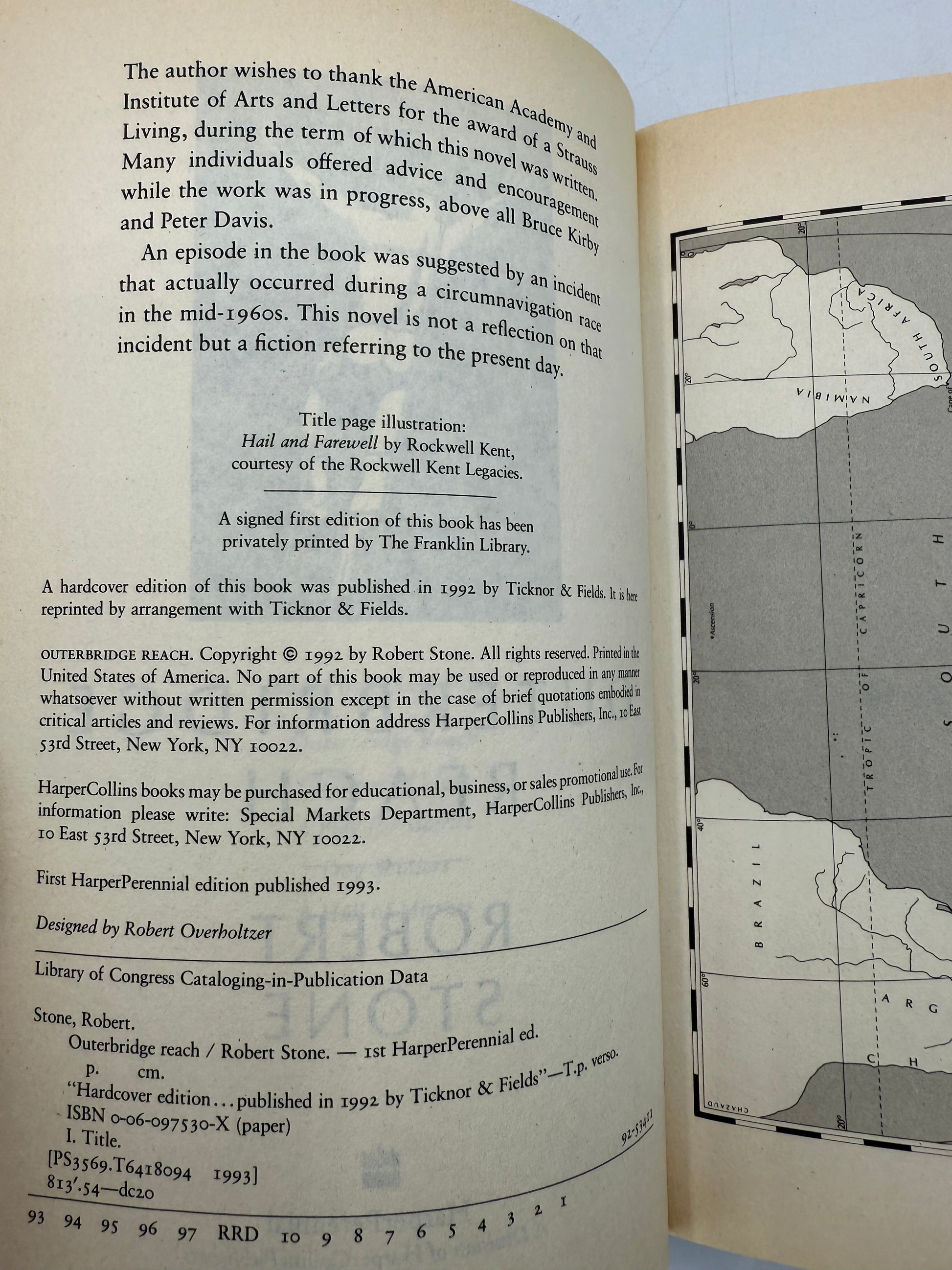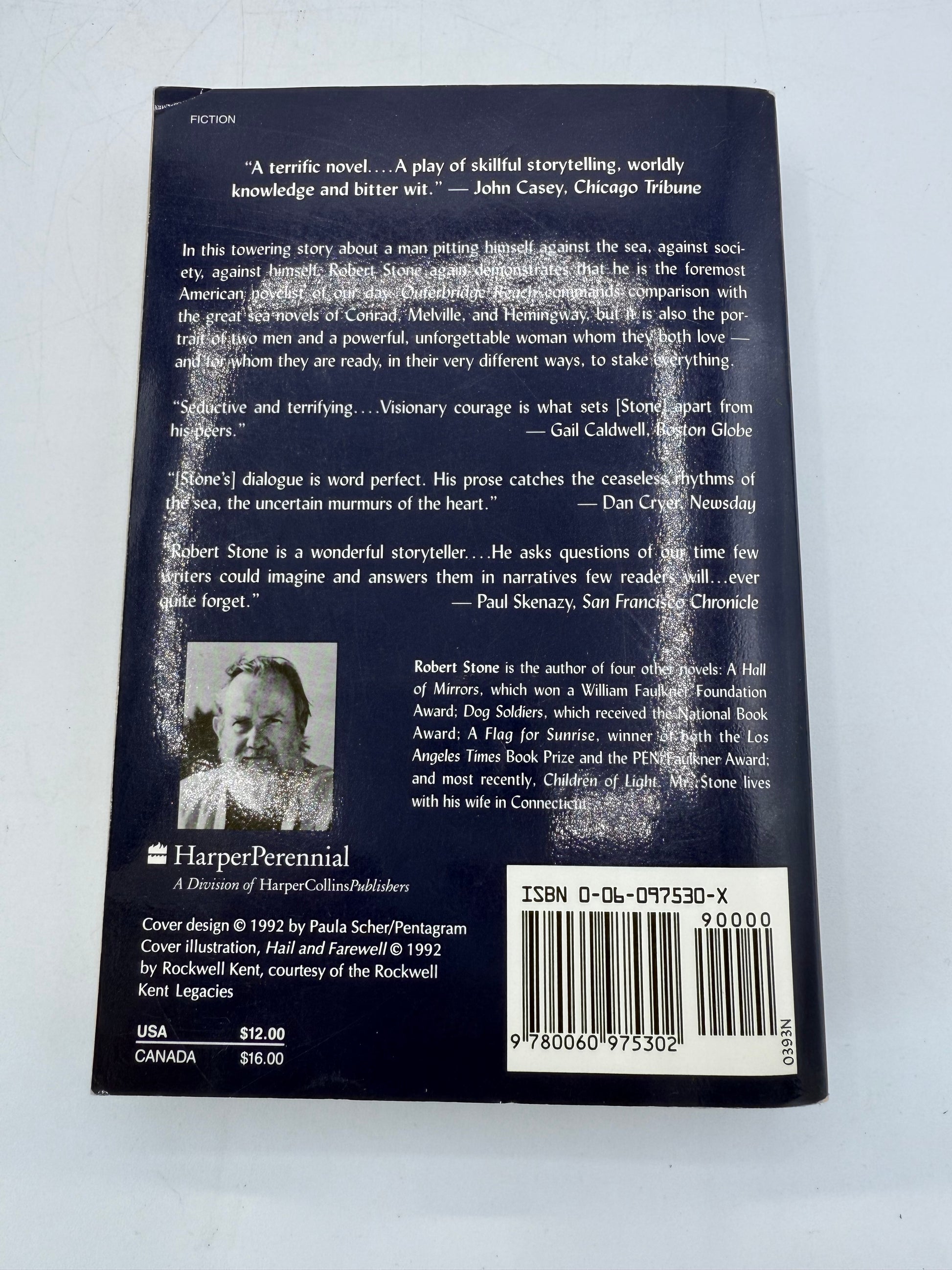 Outer Bridge Reach, A Novel by Robert Stone. New York Times Bestseller. Published by Harper Perennial. Copyright 1993. Paperback. There is a light vertical soil spot on the first page inside the cover. The pages are soft and white throughout with mild tanning. Size: 8", 409 pages.