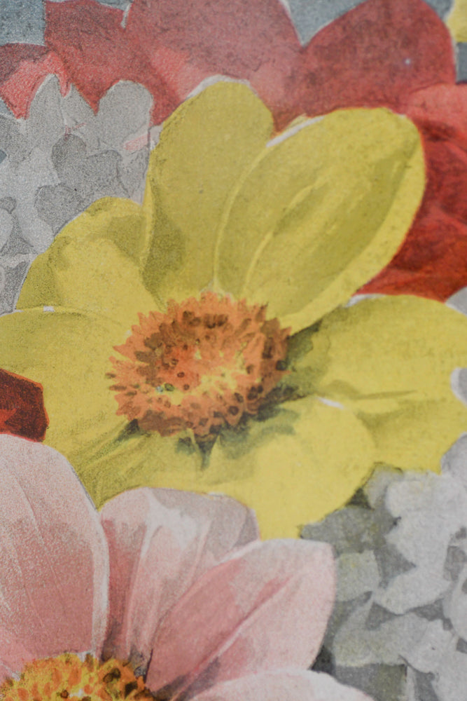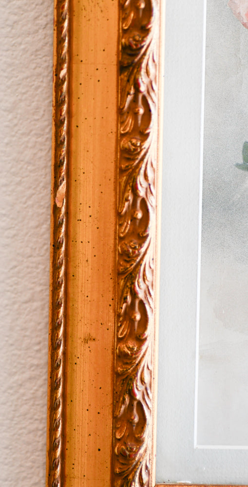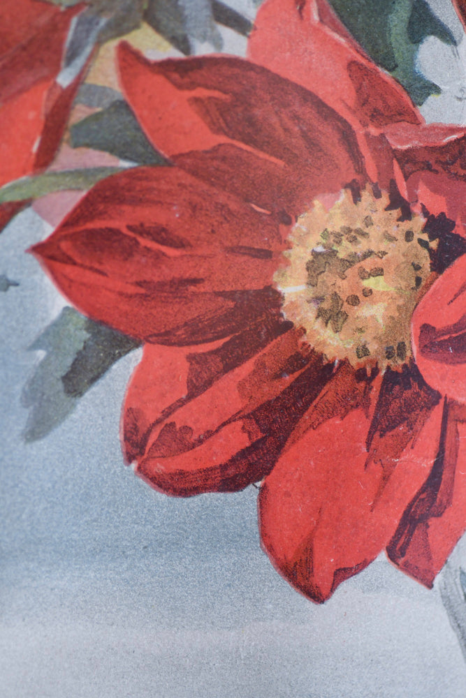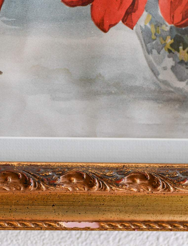 A Paul de Longpre still life with flowers in a glass bowl. Watercolor on paperboard under glass painting. Framed and signed. Size: 26.5 x 16.75". A beautiful original watercolor dated 1898 with a neutral light blue background with gray undertones. The flowers have beautiful detail and rich color. The red flowers are a little more muted red than pictured. The white hydrangeas are a beautiful crisp, creamy bright white. The center yellow flower is bright as well as the pink center flower. The lower right corner of the painting becomes more shadowed and moody. The frame is good and gilded with two chips (pictured). Free U.S. shipping at checkout.