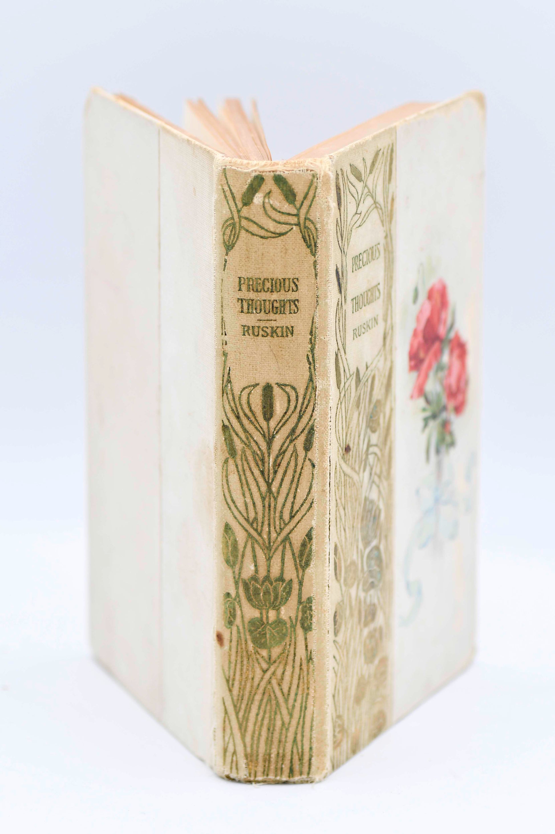 A decorative floral edition of 'Precious Thoughts' by John Ruskin. Published around 1895 (no date). The cover has a red carnation decoration and floral decoration. There is soiling on the cover and the corners are bumped. There is fraying on backstrip and at the cover connections. There is light soiling on the white back cover. There is a penned message on the right endpaper. The title page is missing. The frontispiece photograph of the author is present. The hinge is cracked with webbing visible at the “Contents” page. The interior pages are soft, white and intact with mild tanning throughout. Size: 6.5 x 4.25”, 477 pages.