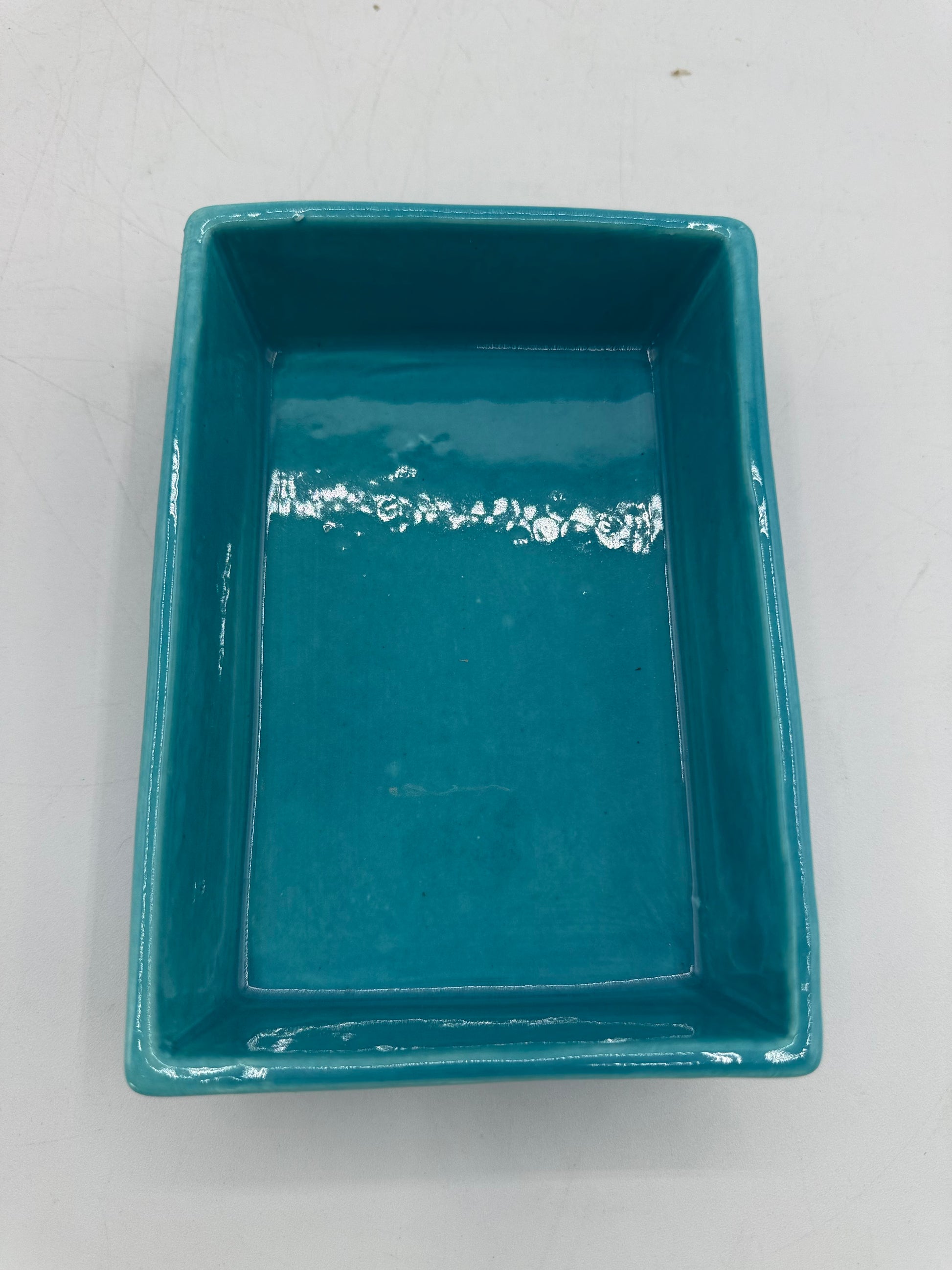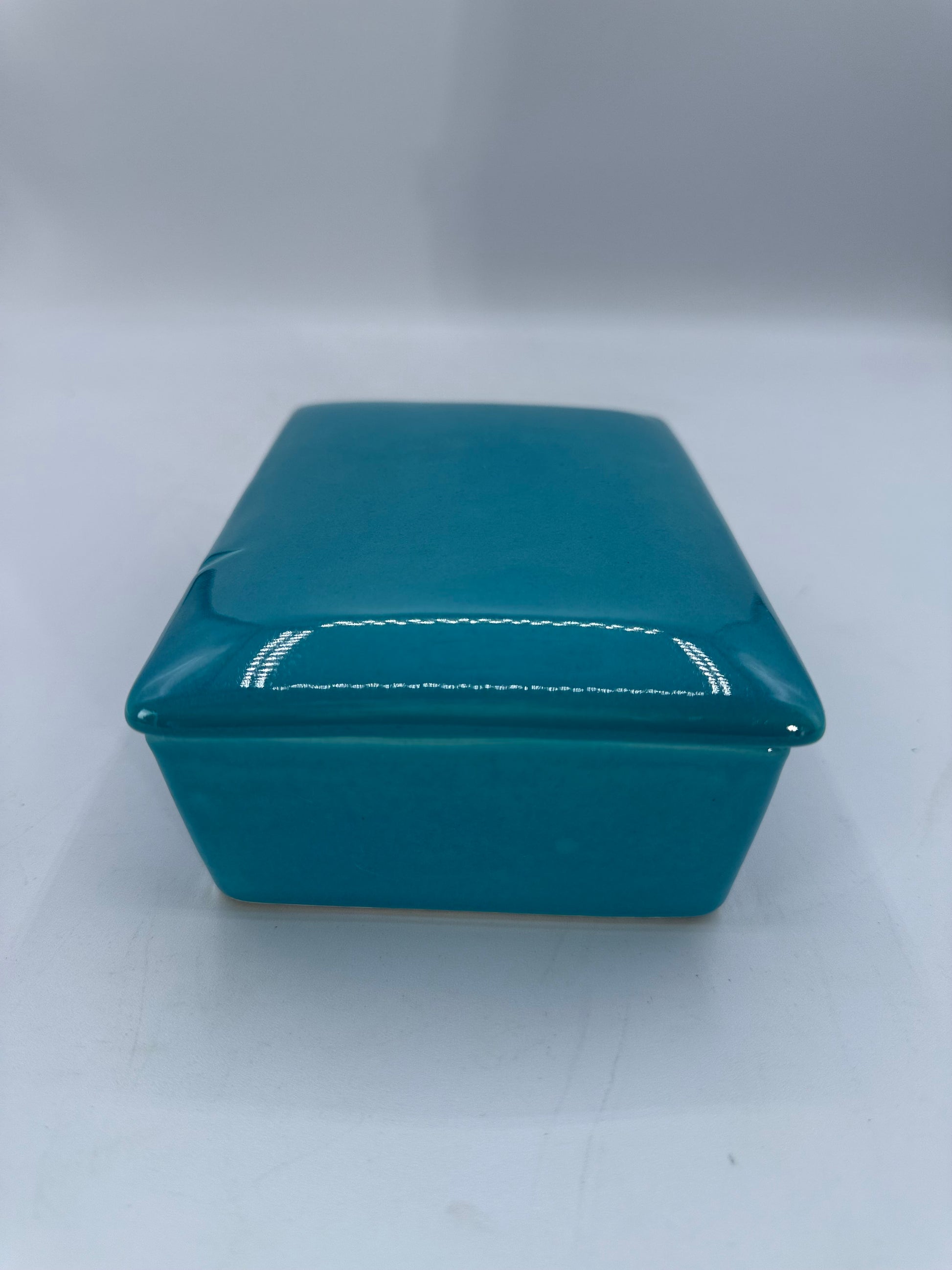 A Raymor vintage porcelain box. Made in Italy. The aqua blue glaze is much brighter than we were able to capture. Raymor is known for their brightly colored porcelain. This is solid blue. There is a manufacturing line on one side of the lid, this may have been intentional. The manufacturer markings and signature are on the bottom with number. This item is very clean without chips or cracks. Could be used to store valuables, jewelry, hide personal items, used as a gift box, and hotel or business decor, etc. Size: 5.5” W x 4 L x 2" T.