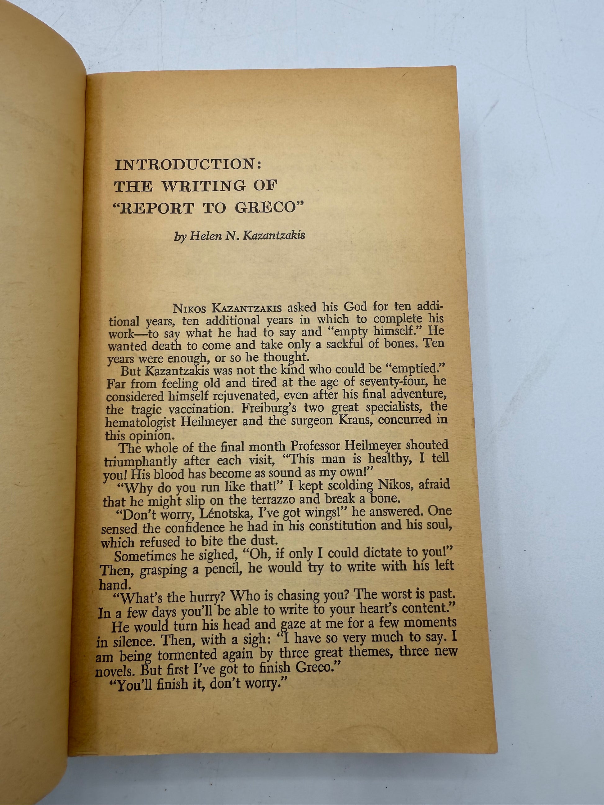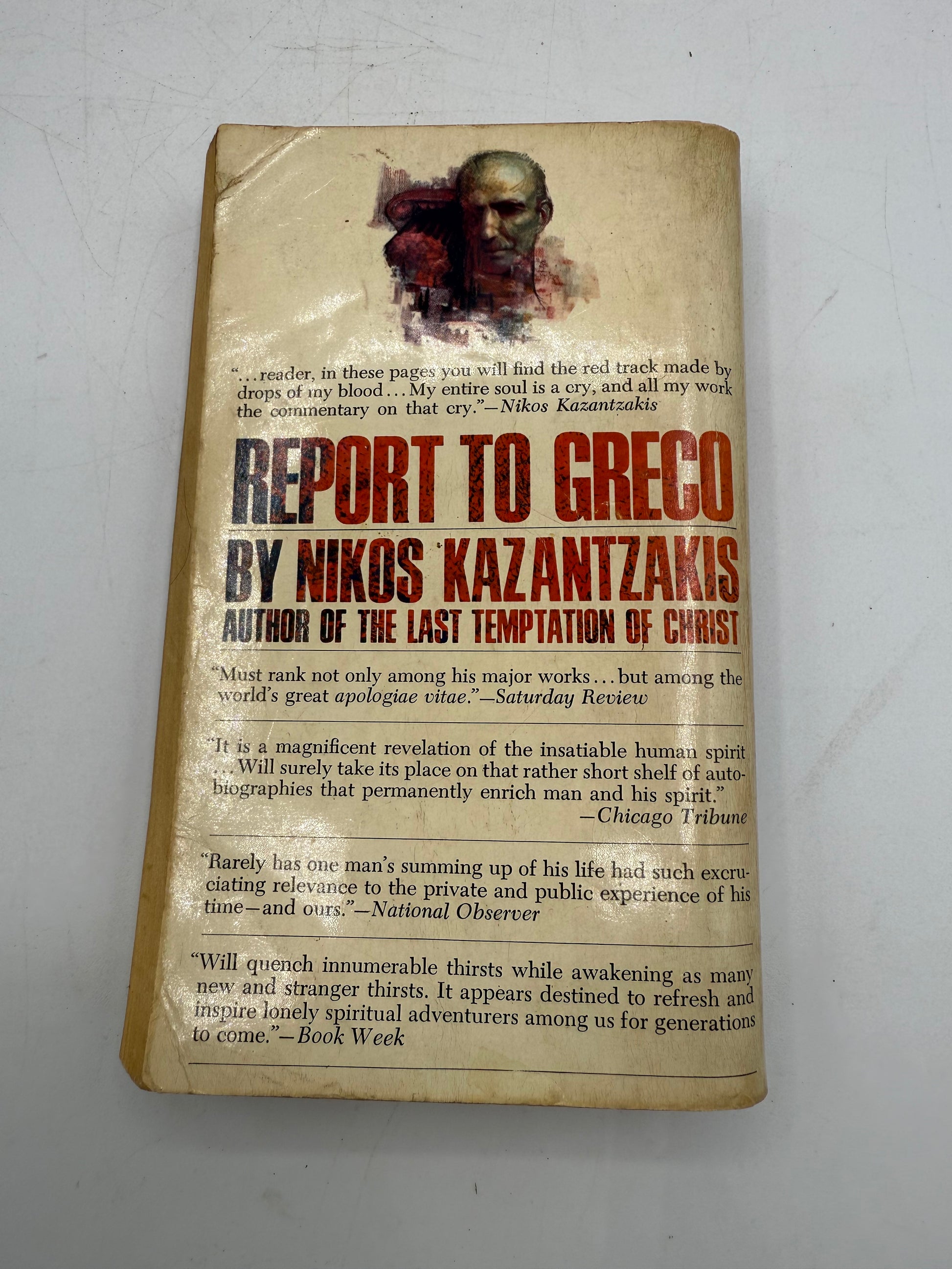 Report to Greco by Nikos Kazantzakis. Translated from The Greek by P A Bien. Bantam Edition, November 1966. There are creases on the lower right cover corner. Please see pictures for condition. The pages have moderate to heavy toning throughout. There are occasional penned underlined notations not all pictured. There are penned notes on a blank page in the back of the book. Size: 7", 495 pages.