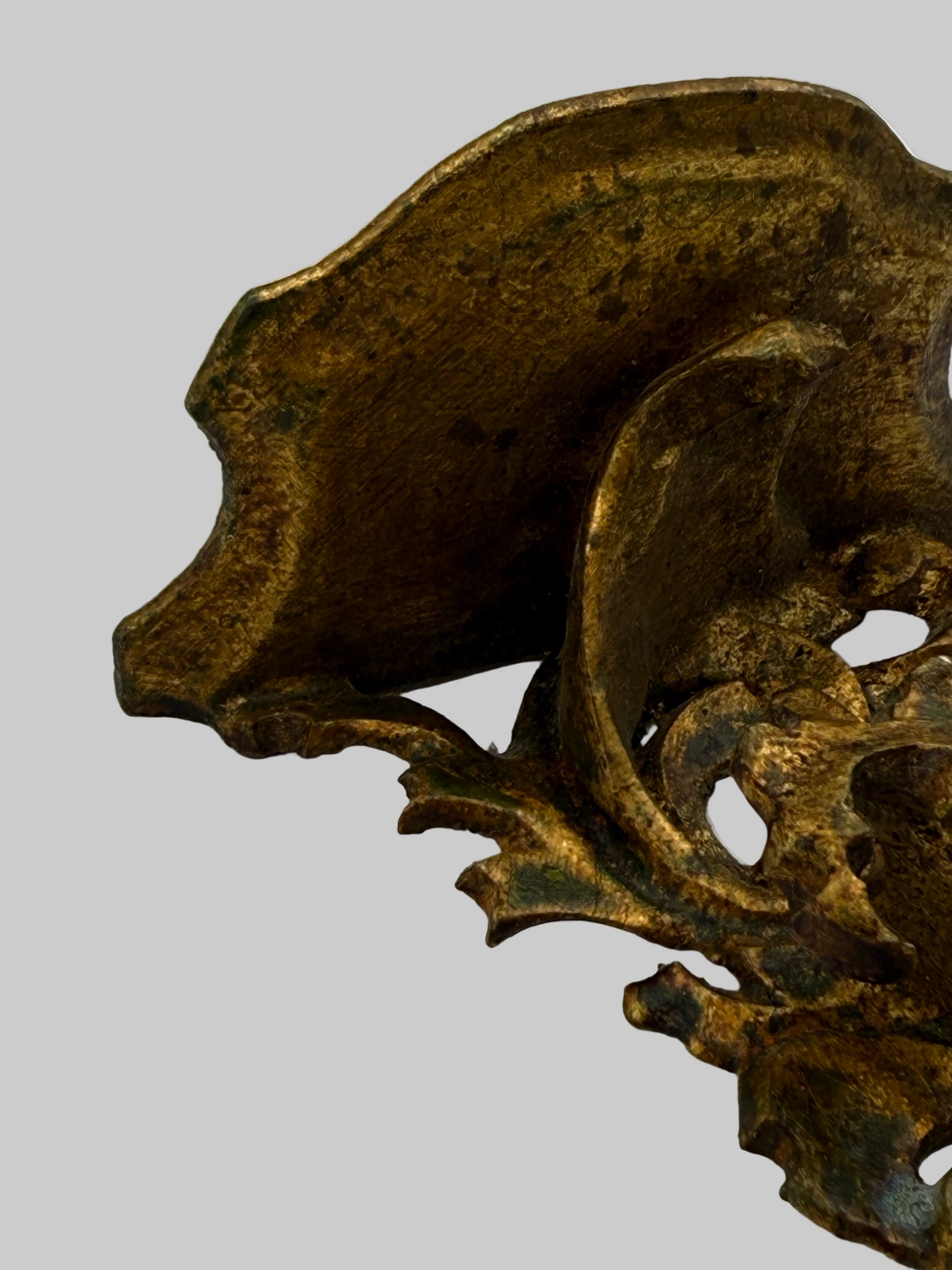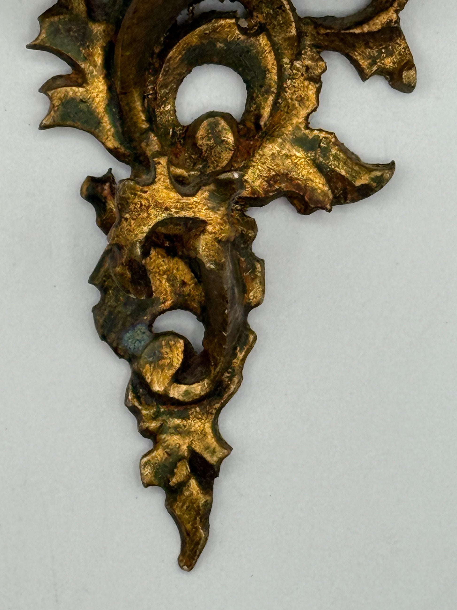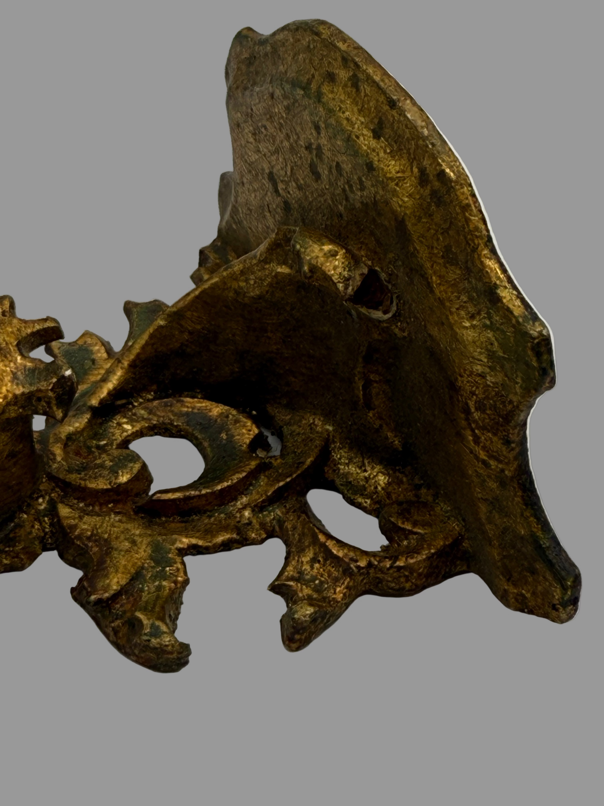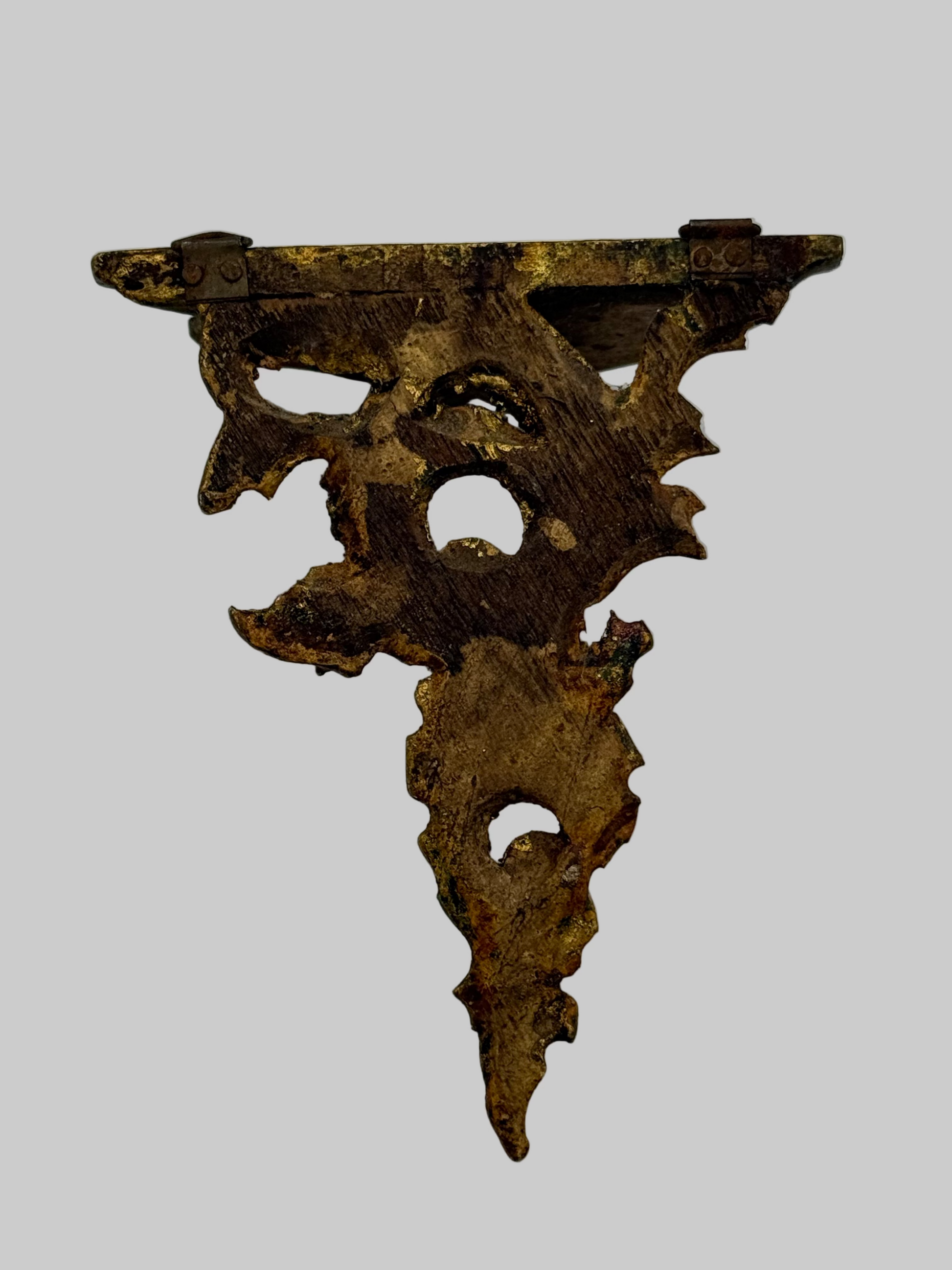 A miniature Florentine shelf with a brassy gold finish. The shelf still has installed hardware. There is a chip under the shelf at the tip of a leaf (pictured). The shelf has patina. Date of origin is unknown. Made of hand carved light weight wood. Size: 4.5 x 3.75”