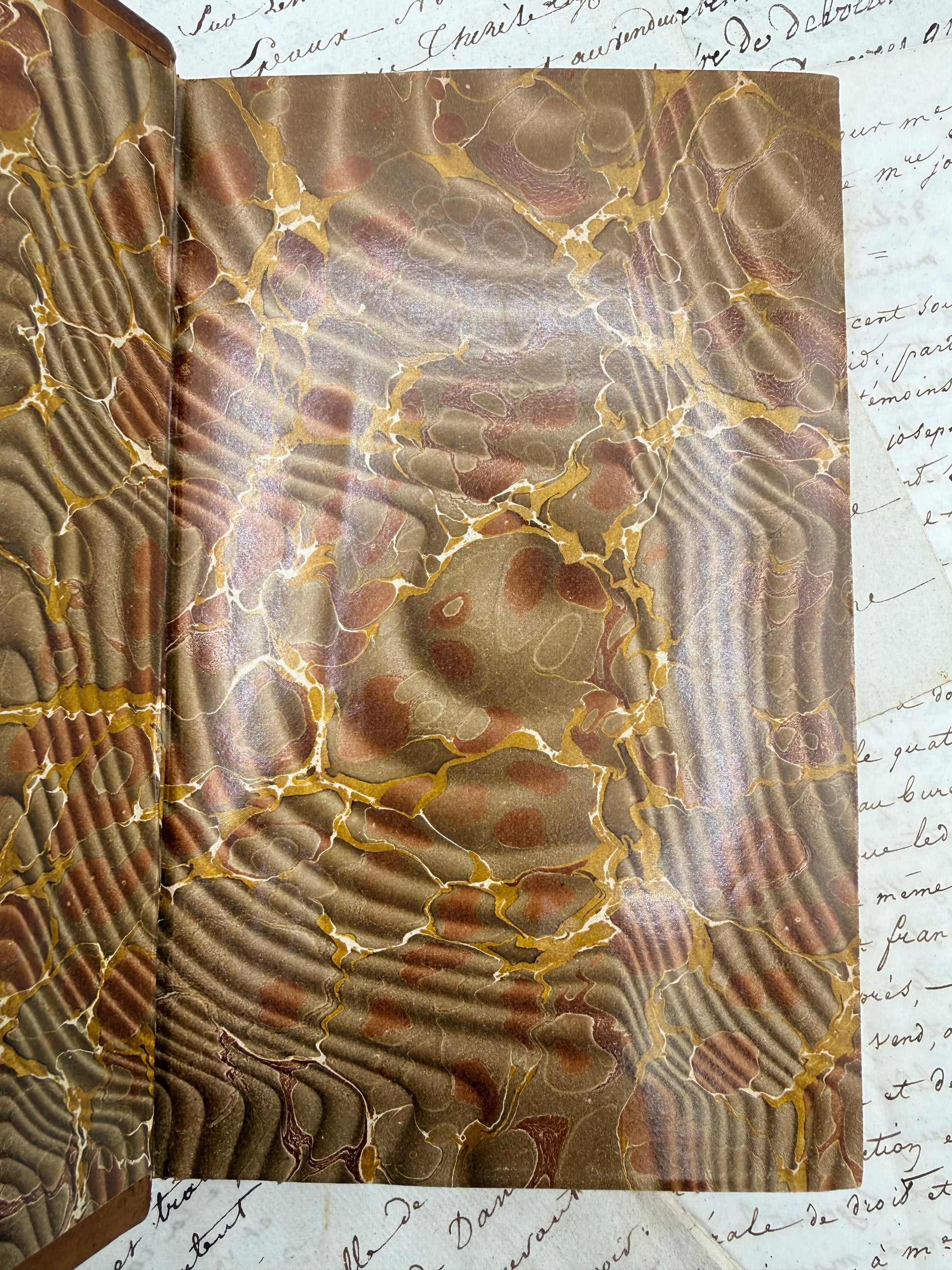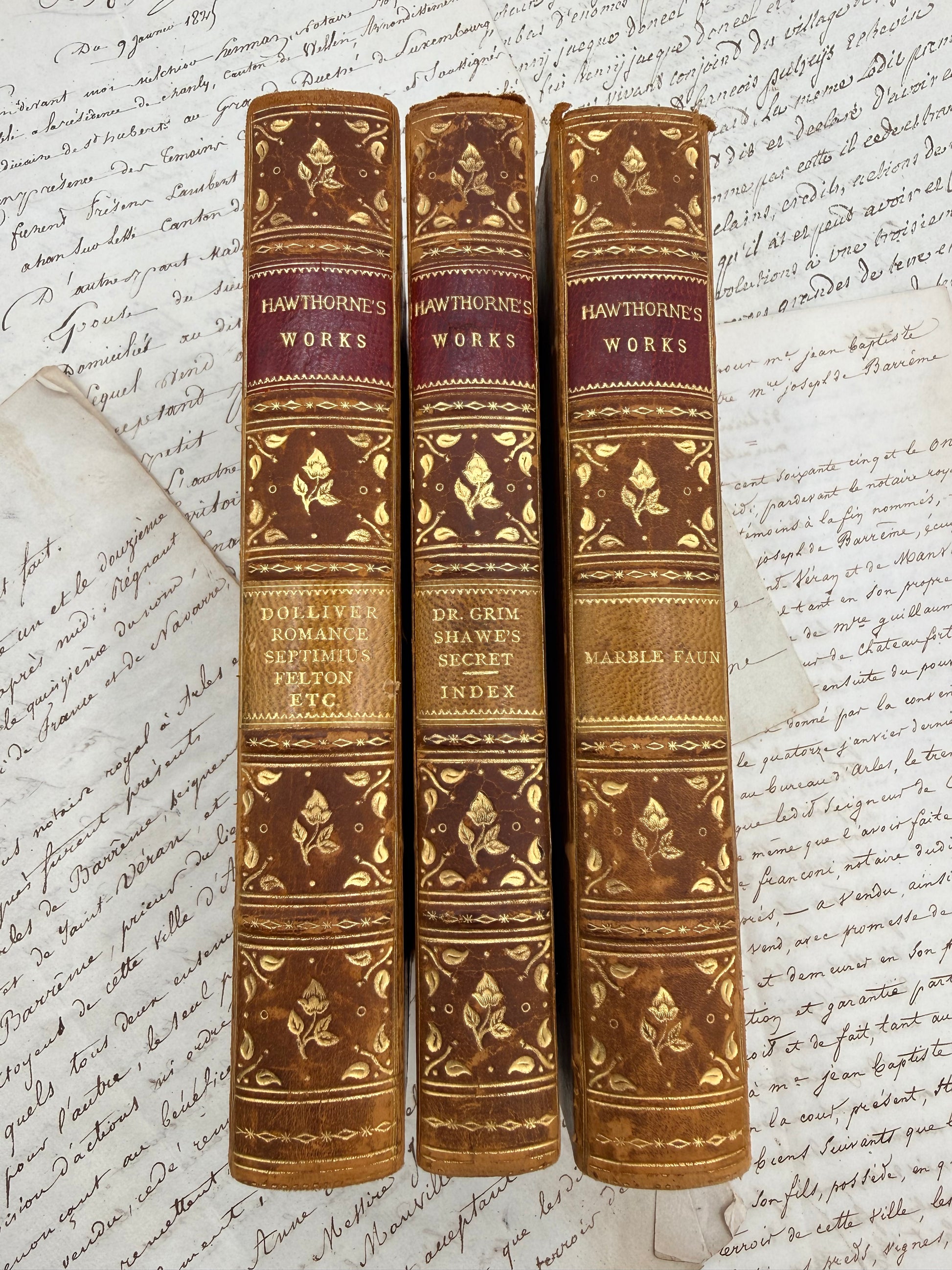 A partial set of Hawthorne’s Works in three half-leather volumes. A gorgeous set with decorative spines and gilt decoration. Published by Houghton, Mifflin and Company, Boston and New York. Copyright 1902. Titles include The Marble Faun or The Romance of Monte Beni; Doctor Grimshawe's Secret - A Romance; The Dolliver Romance Fanshawe, and Septimius Felton with an appendix containing The Ancestral Footstep. . There is some wear on the leather particularly on the cover corners. Each book has under-board exposed on the corner and the leather is rubbed. The back cover corner of Dolliver has quite a bit of upper board exposed at the corner. The marbled endpapers are beautiful. The pages are soft and white with mild toning in the margin of Dolliver. The last page of Marble Faun is uncut. Size: 7", 528 + 374 + 521 pages.