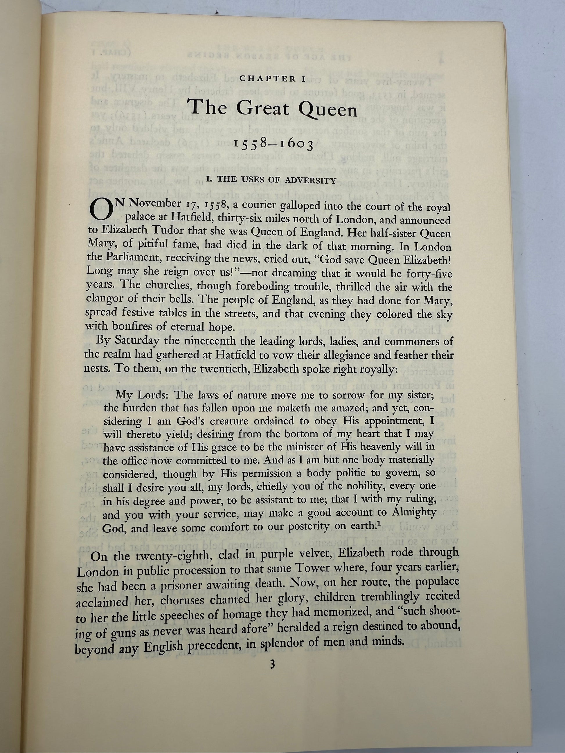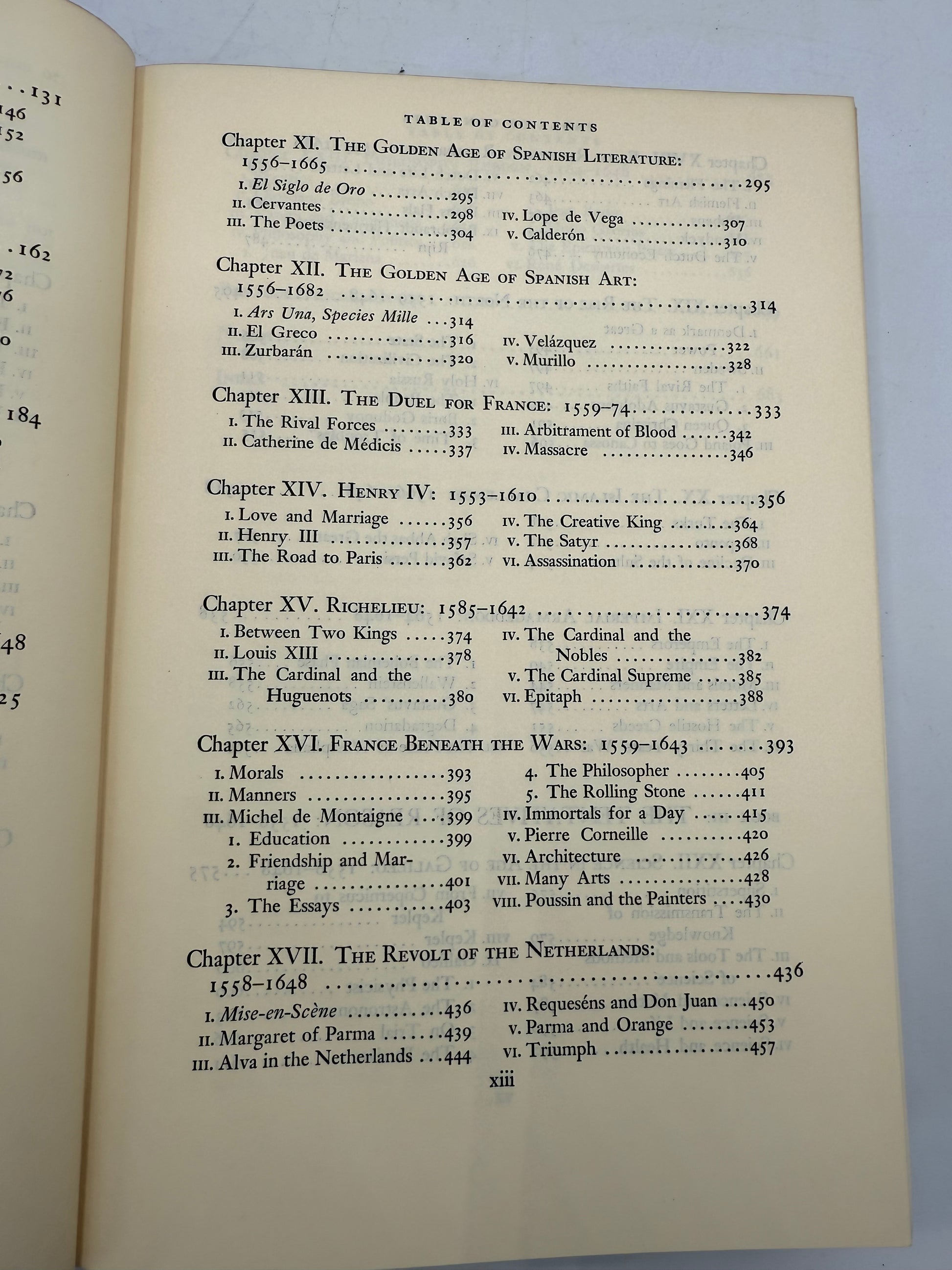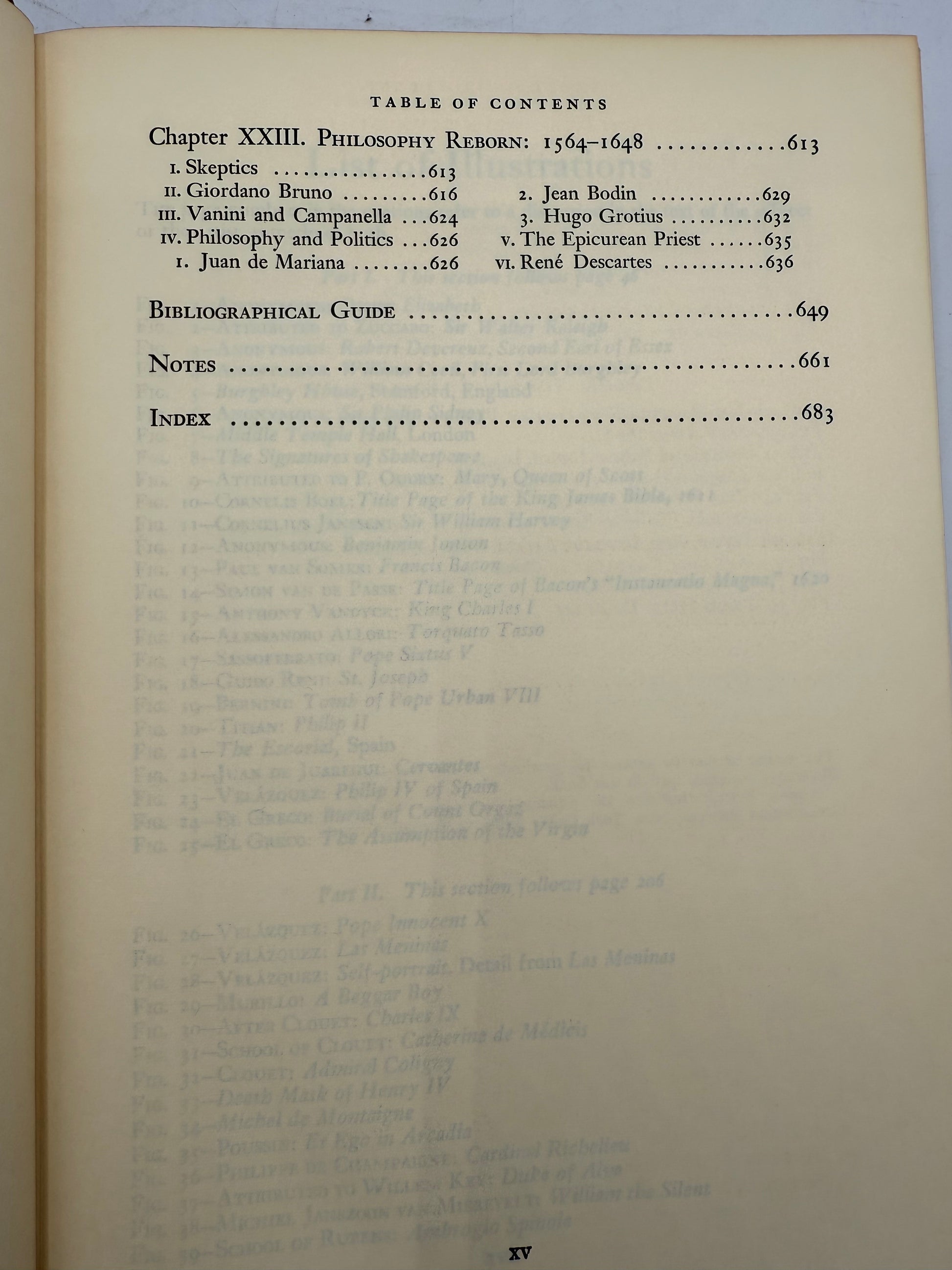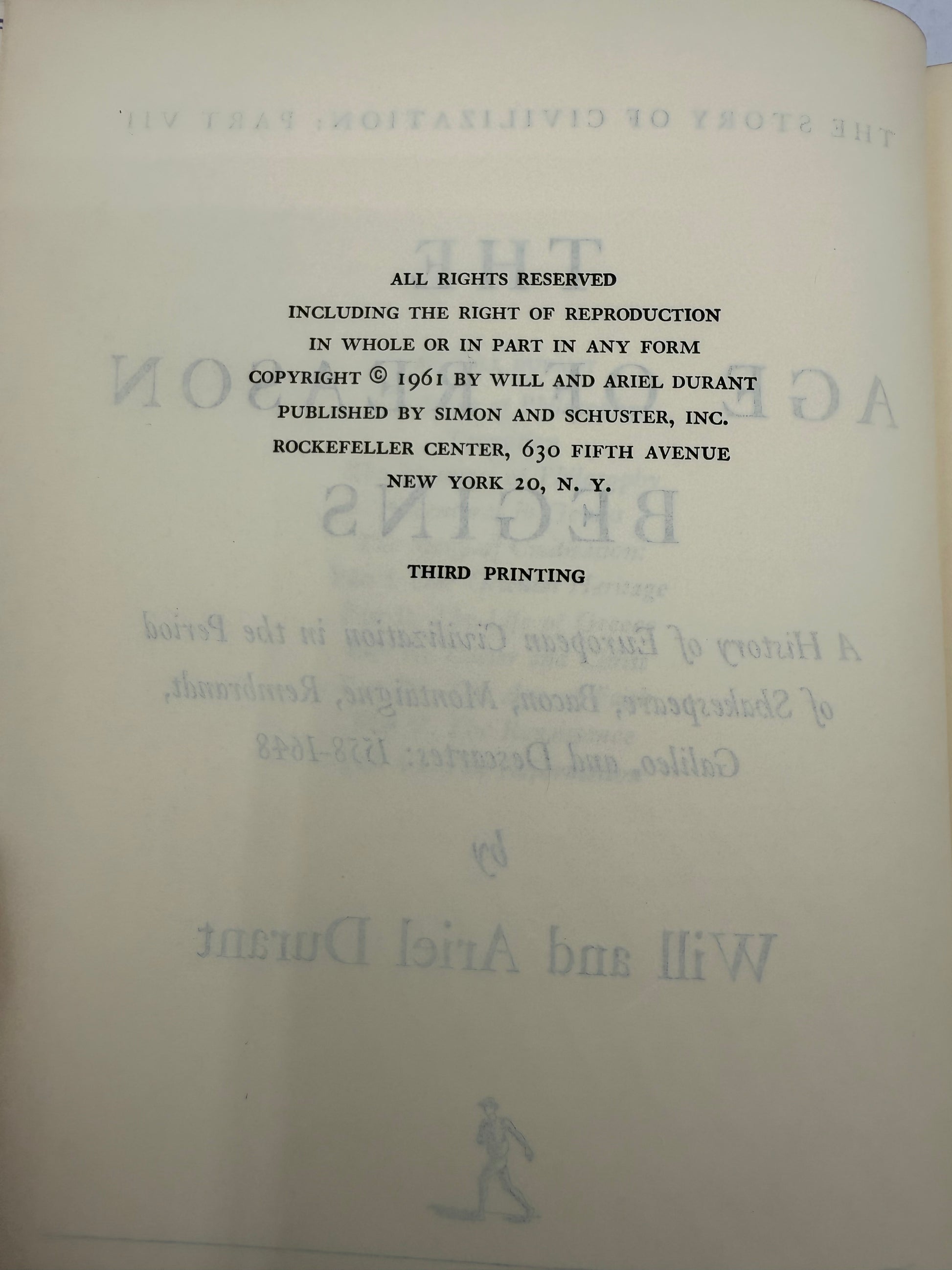 The Age of Reason Begins by Will and Ariel Durant. From a set of books, The Story of Civilization VII. A History of European Civilization in the Period of Shakespeare, Bacon, Montaigne, Rembrandt, Galileo and Descartes, 1558-1648. Includes the original dust jacket with some shelf wear. The cover cloth is good. Copyright 1961. Third Printing by Simon and Schuster. Illustrated. The pages are soft with mild toning. Size: 9.75", 727 pages.