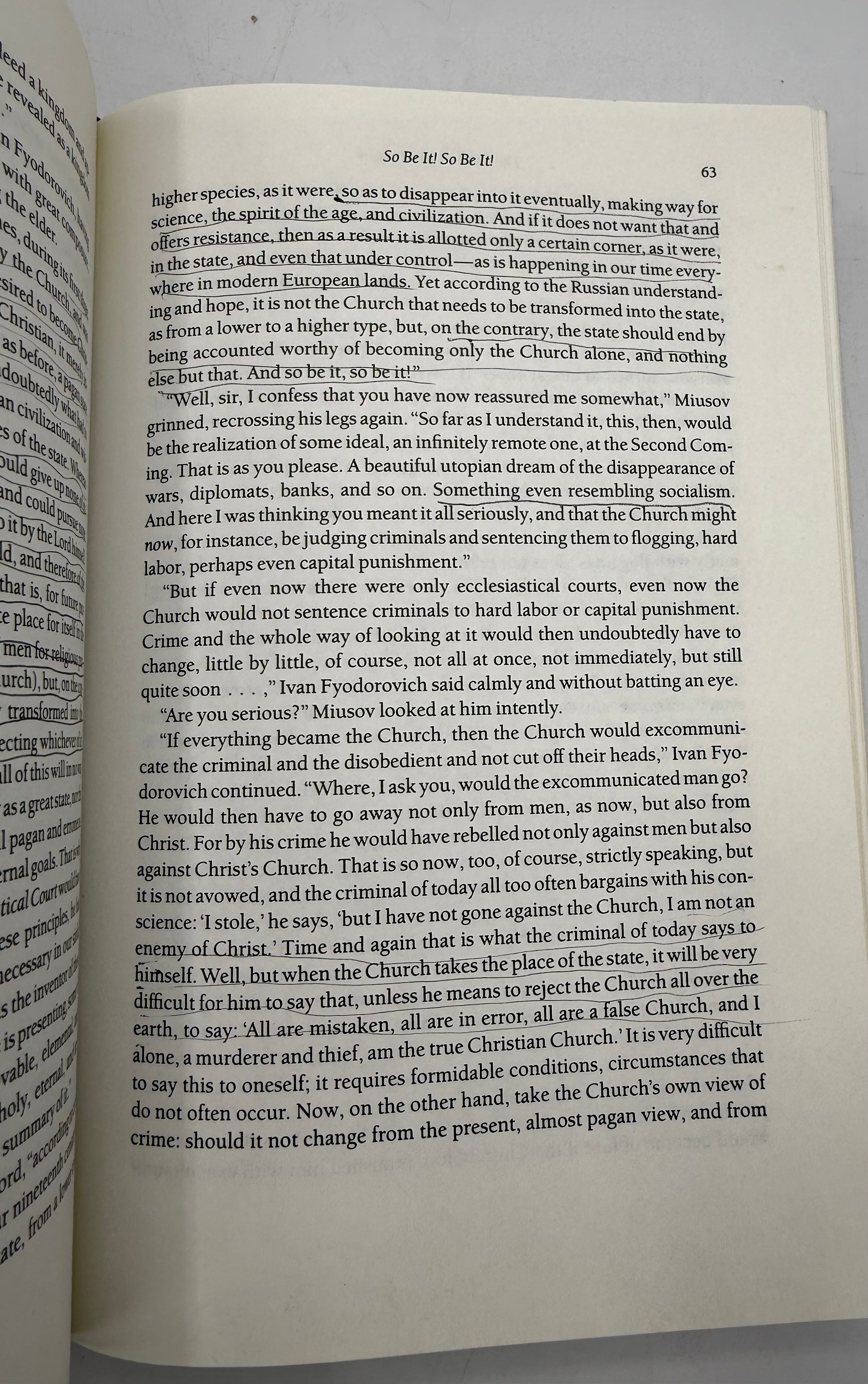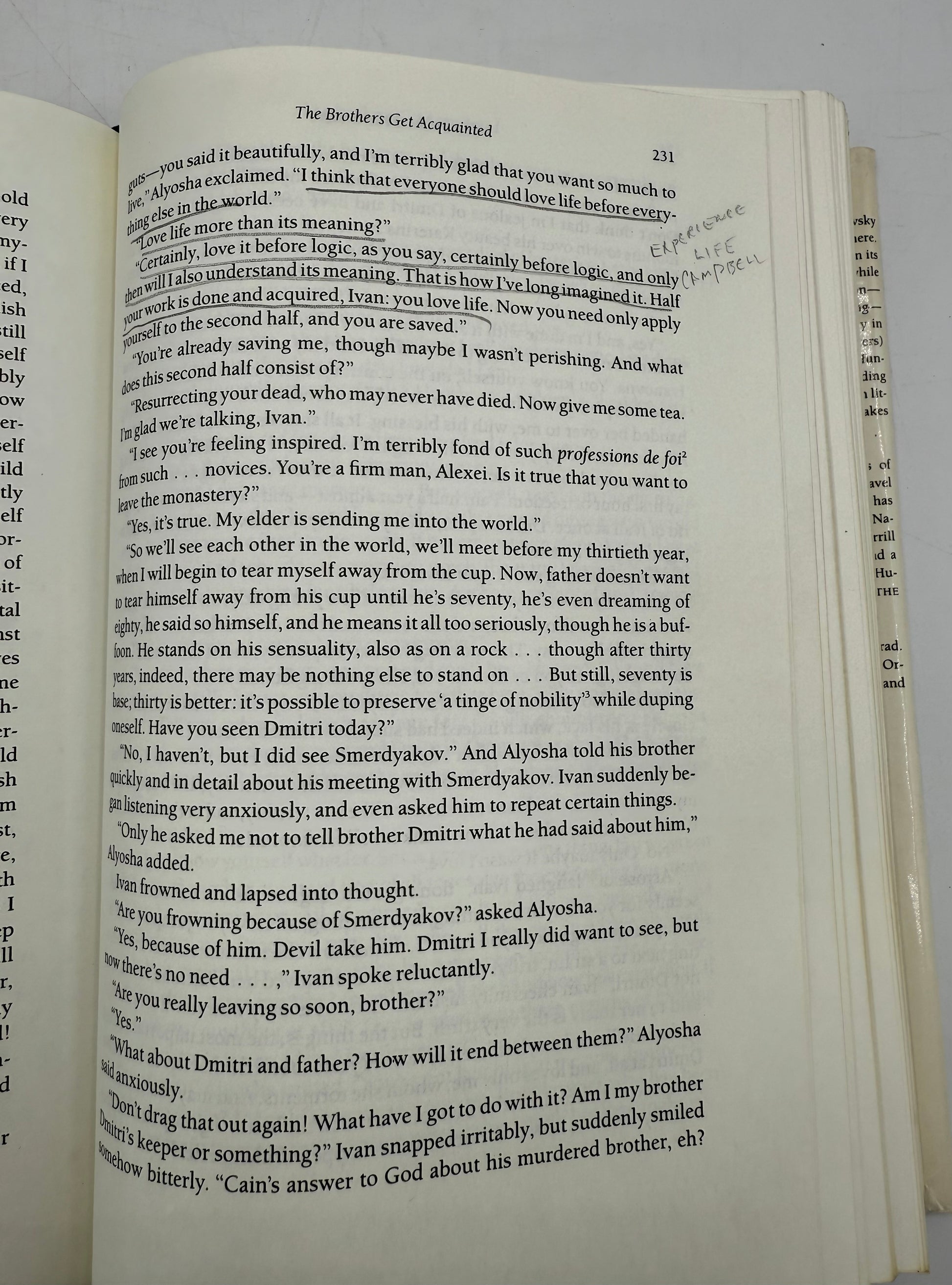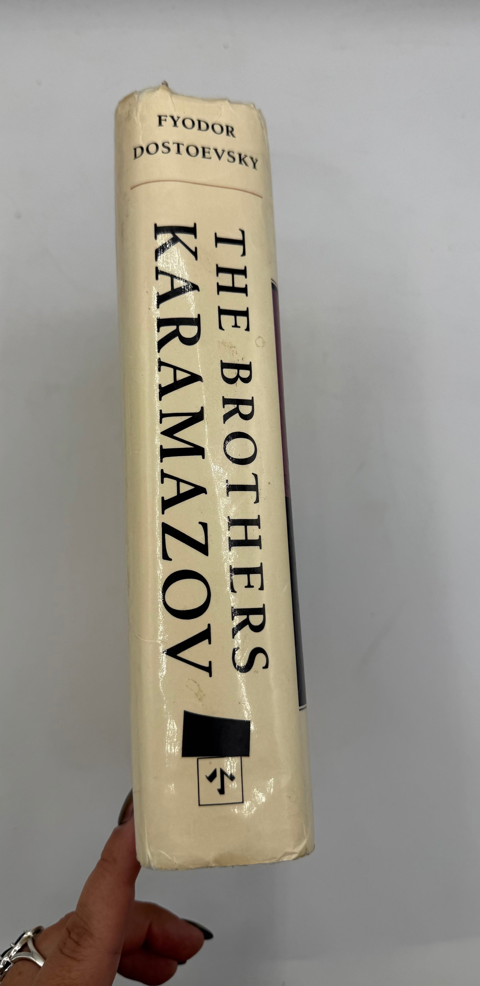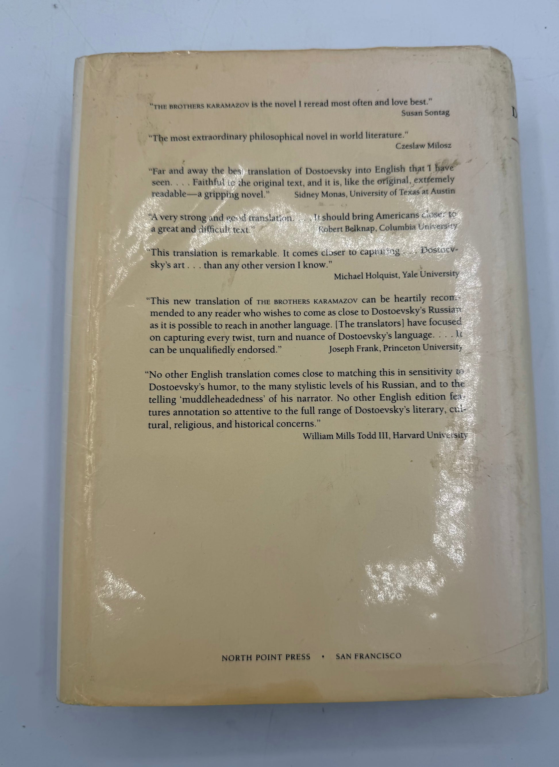 The Brothers Karamazov by Fyodor Dostoevsky. A Novel in Four Parts with Epilogue. Translated by Richard Pevear and Larissa Volokhonsky. Copyright 1990. North Point Press, San Fransisco. Hardback with dust jacket. There may be tape on the upper edge of the dust jacket spine. There is a signature on the inside endpaper. There are several pages with penned underline notations throughout. See photos for condition. There is a water mark on the cloth cover. Size: 9.5". 796 pages.
