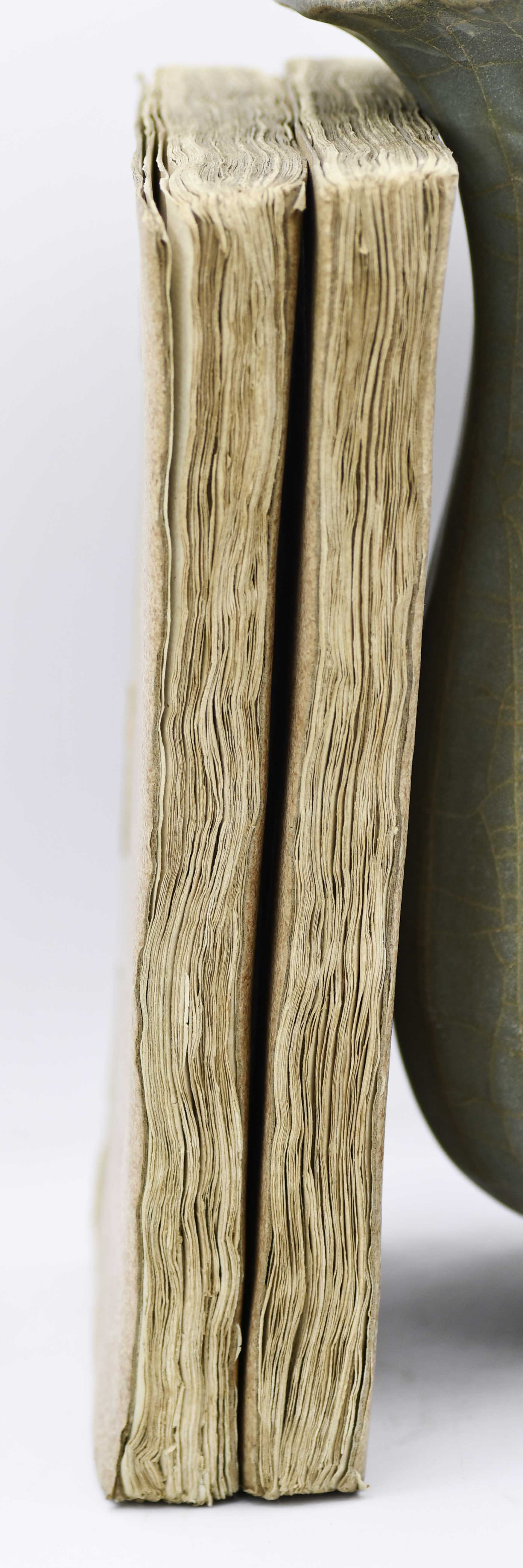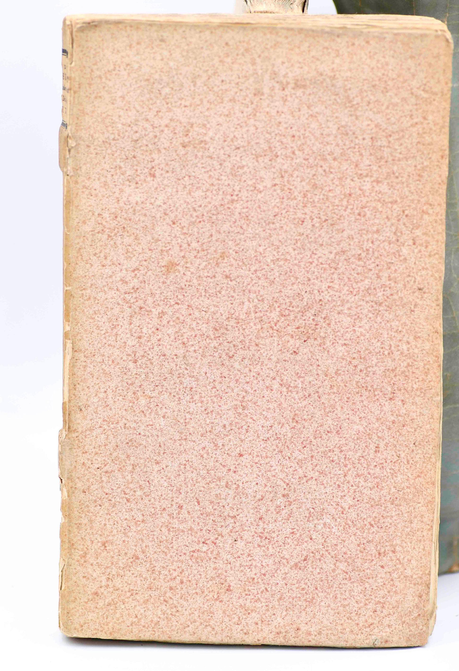 De Geuzen, Vaderlandsch Dictstuk {Title: The Geuzen, Patriotic}. Volumes 1 & 2. Copyright 1785. Dutch language. The covers are somewhat hard bound with a matte pink speckled cover with orange undertones. The upper edge of the cover on volume 2 is sun-faded. There are original paper labels on the backstrip. The cover is cracked at the lower backstrip corner (~1 inch). The back covers match the front covers. The book opens to the title page which is ornately illustrated. The interior pages are lightly textured with heavy type-weight throughout. The white pages are stiff and mostly white throughout. 393 + 168 pages, size: 8.75 x 5.25"