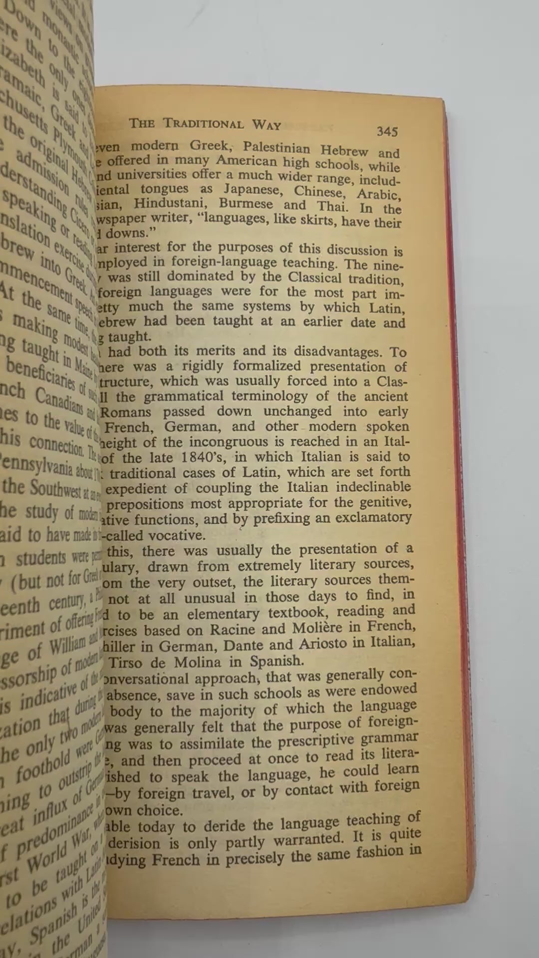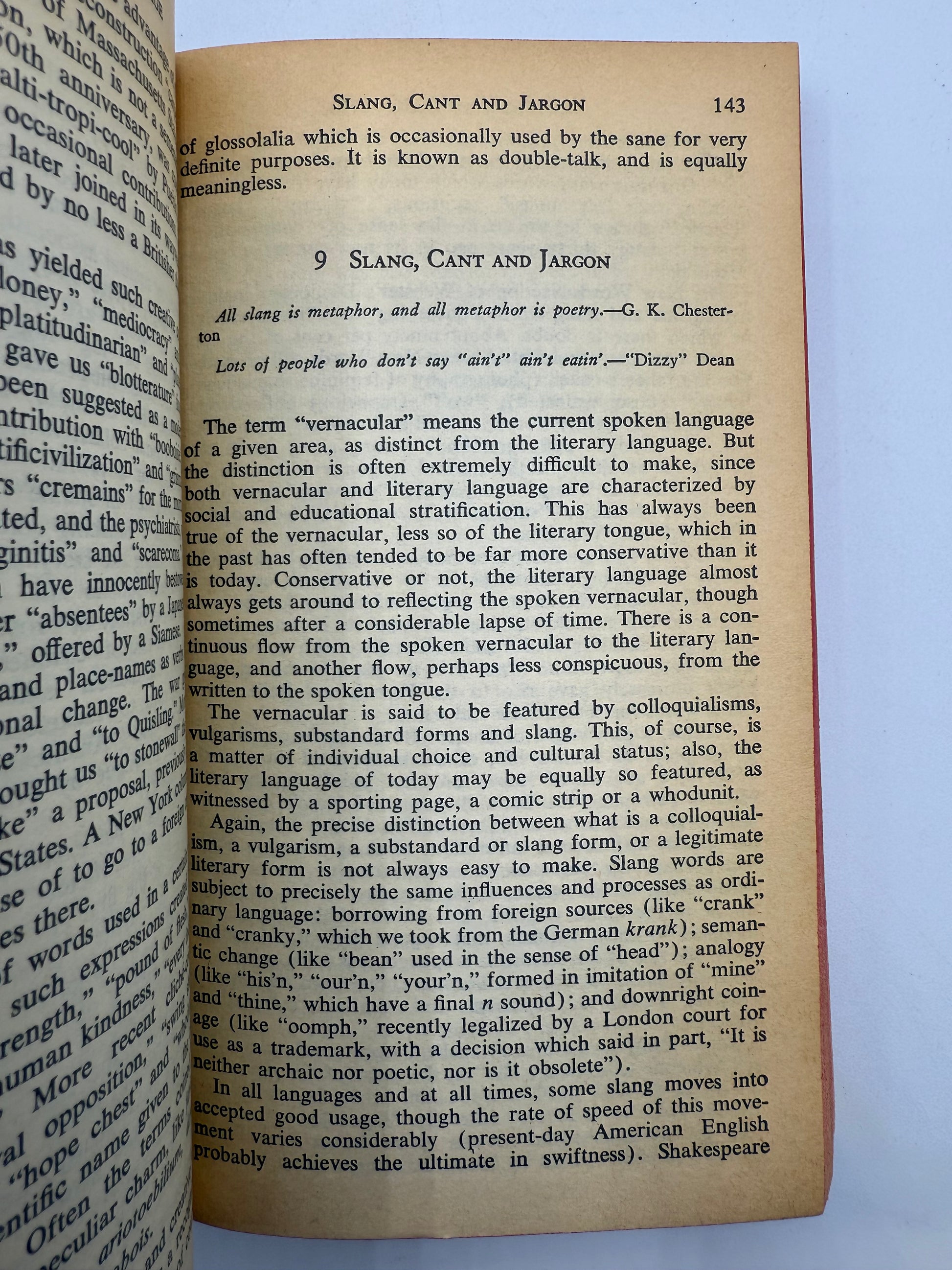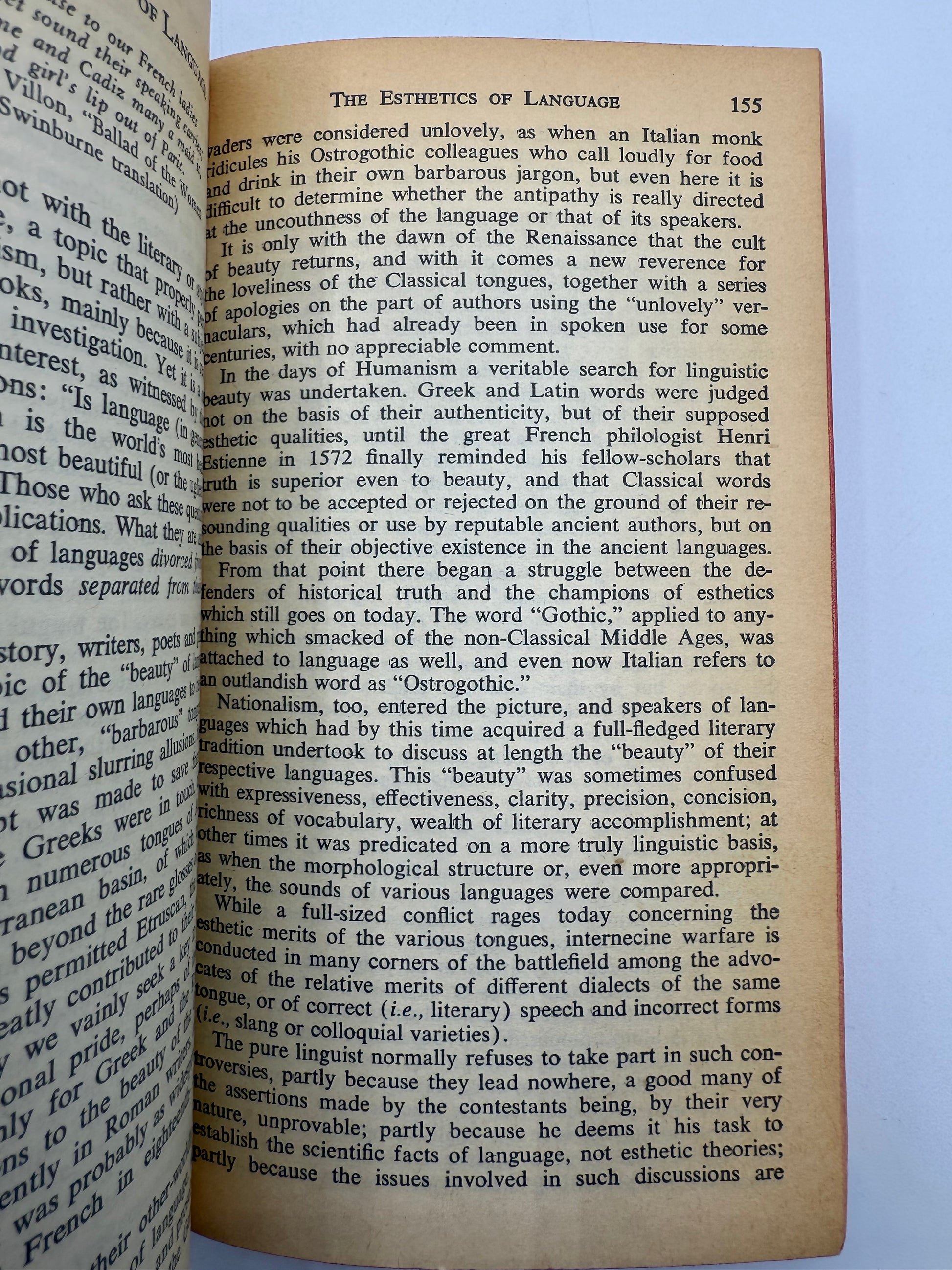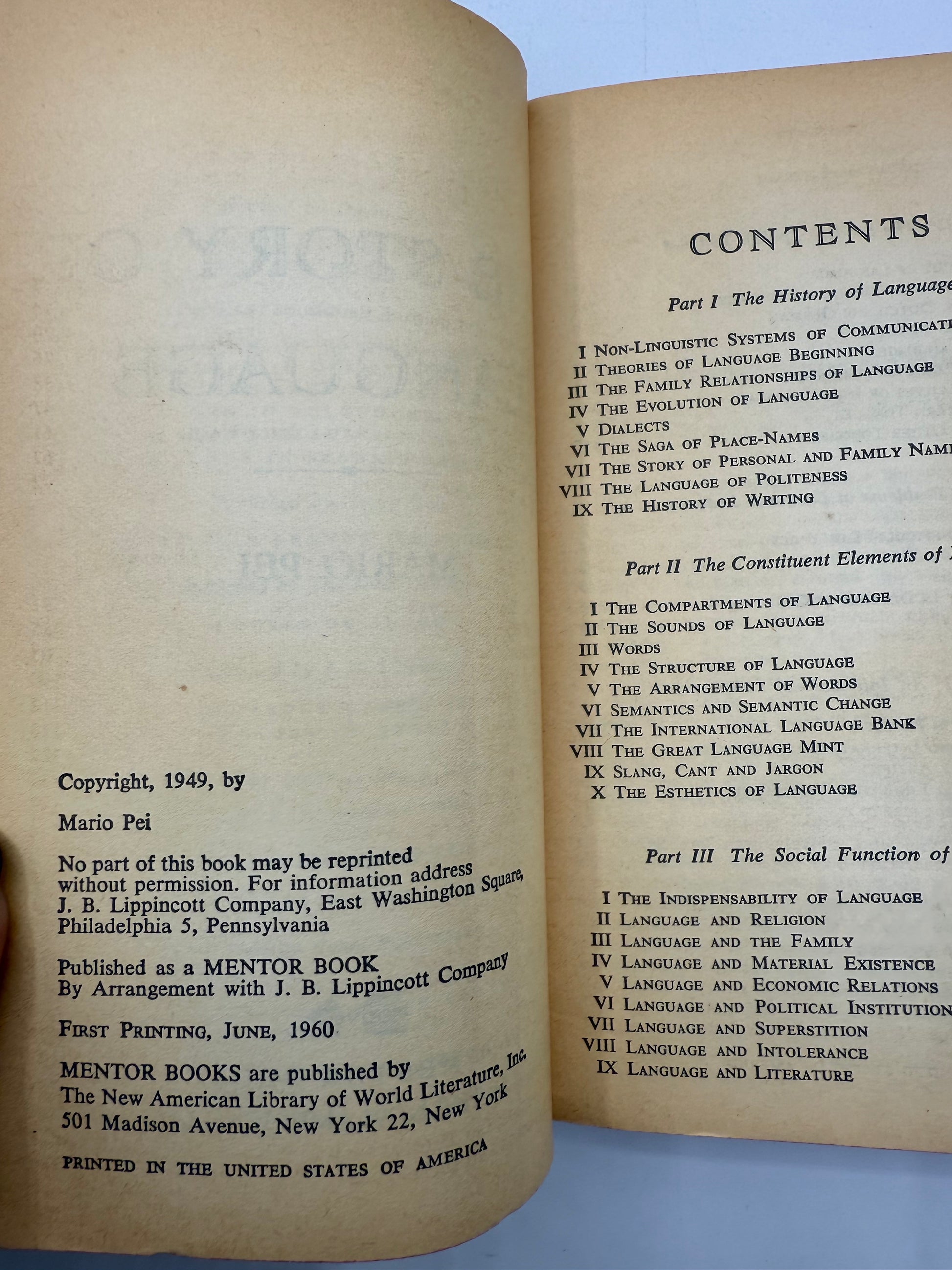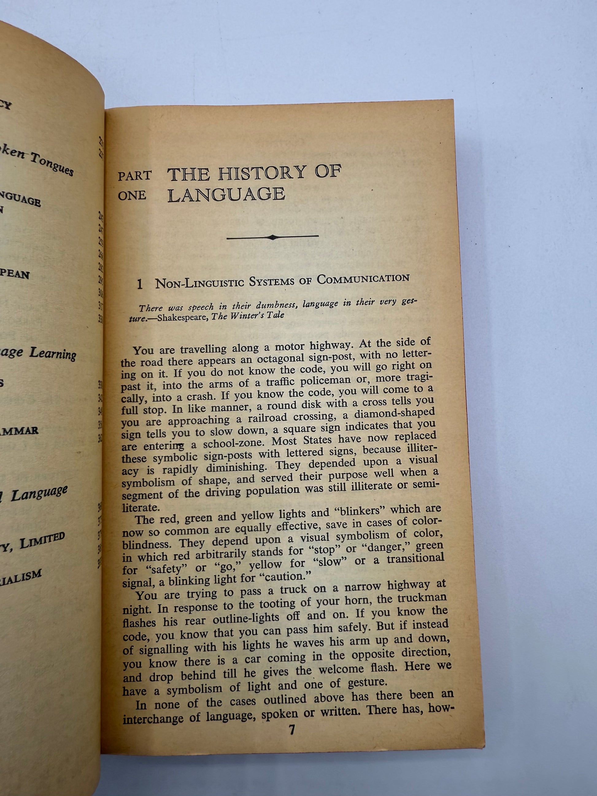 The Story of Language by Mario Pei. Copyright June, 1960. There are some vertical lines and wear on the lower spine. The outer edge of the pages are dyed red. The pages have moderate toning throughout. 431 pages with Index. Size: 7".