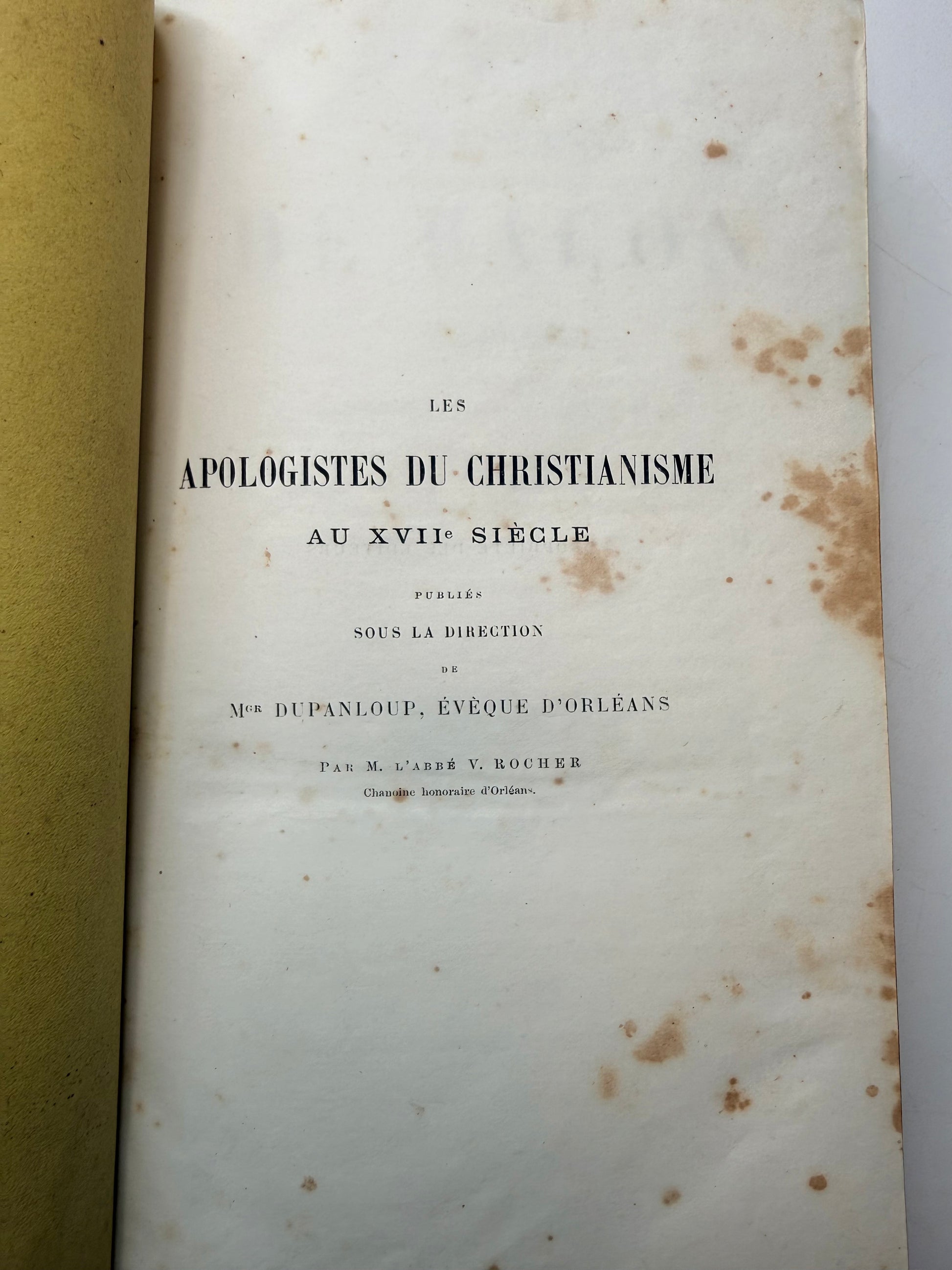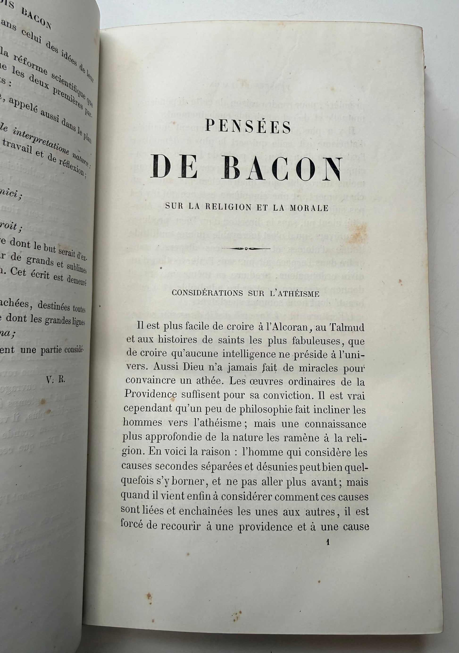 A pink French cartonnage style book, "Pensees de Bacon, Kepler, Newton et Euler ur La Religion et la Morale". Published by Alfred Mame Co, Tours. Copyright 1870. The cover is bright pink with gilt decoration. The spine is slightly sunned. There are darkened areas on the back cover. The book has areas with none to light foxing and then there are areas of heavier and dark foxing. The title page has moderate dark foxing. There is gilt on the foredge. Size: 8.5", 430 pages.
