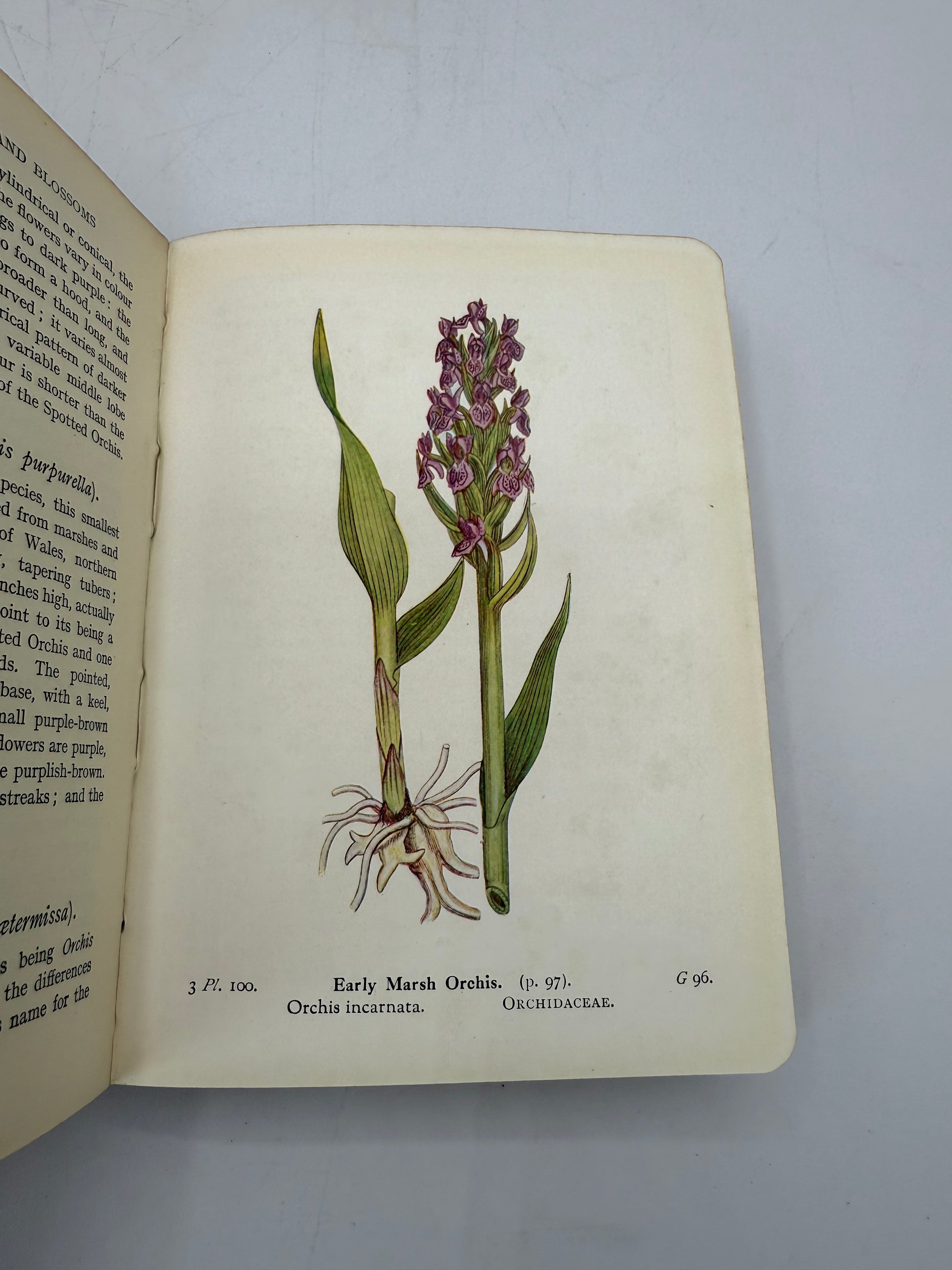 Wayside and Woodland Blossoms. Series III. A Pocket Guide to British Wild Flowers including all the Orchids for the Country Rambler by Edward Step. Copyright 1929. "With Color Figures of 64 Species, 87 Photographic Reproductions and 23 Diagrams". Published by Frederick Warne Co, London. See Table of Contents. There is chipping of the cover on the upper and lower backstrip. The backstrip is lightened or discolored. There is a signature in pen on the right endpaper. The pages are crisp and white throughout with light toning on the outer edges. There is foxing on the back blank pages. Includes an index. 176 pages. Size: 6.25"