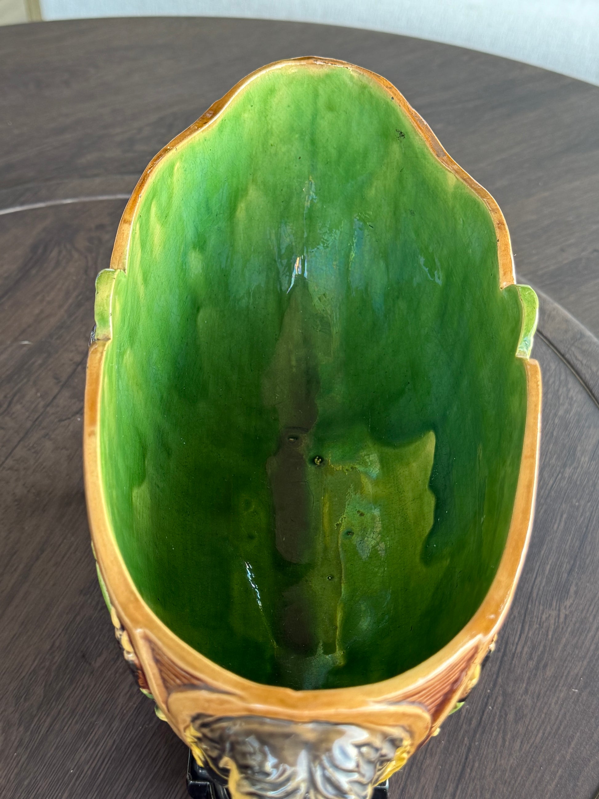An antique Whilhelm, Schiller and Sons majolica ceramic jardiniere planter. A beautiful majolica jardiniere with the WS&S maker mark on the bottom and number 204. The inside has a green glaze. There is an action illustration on each side depicting a female godess received a wreath from child. There are stalks of corn on the sides of the image. The Greek god Neptune's face is depicted on and sides of the planter and on the top center. There are carved sea eurchins on the base appearing to hold it up. Size: 13.5 W x 8 T x 5.75” D.