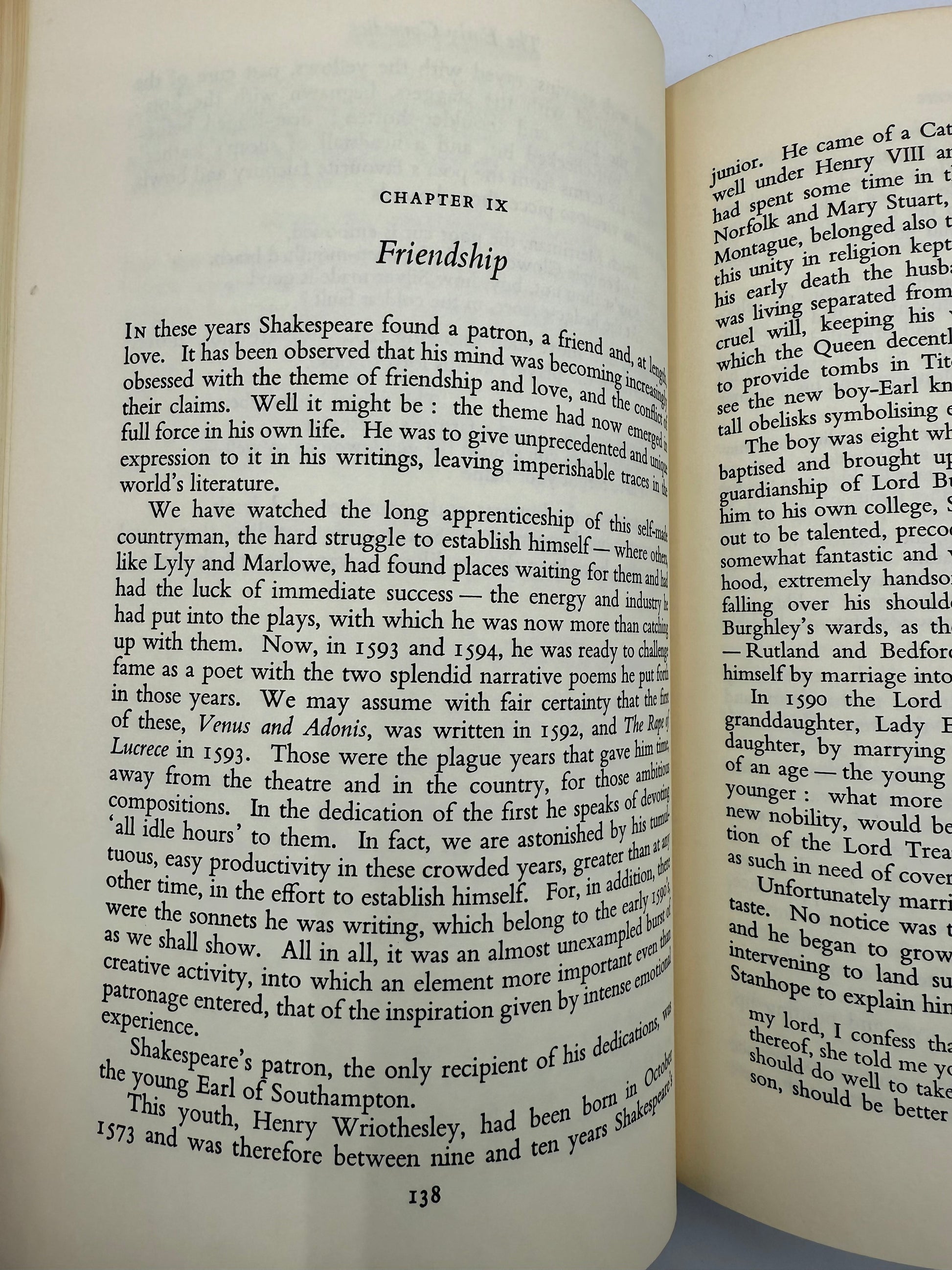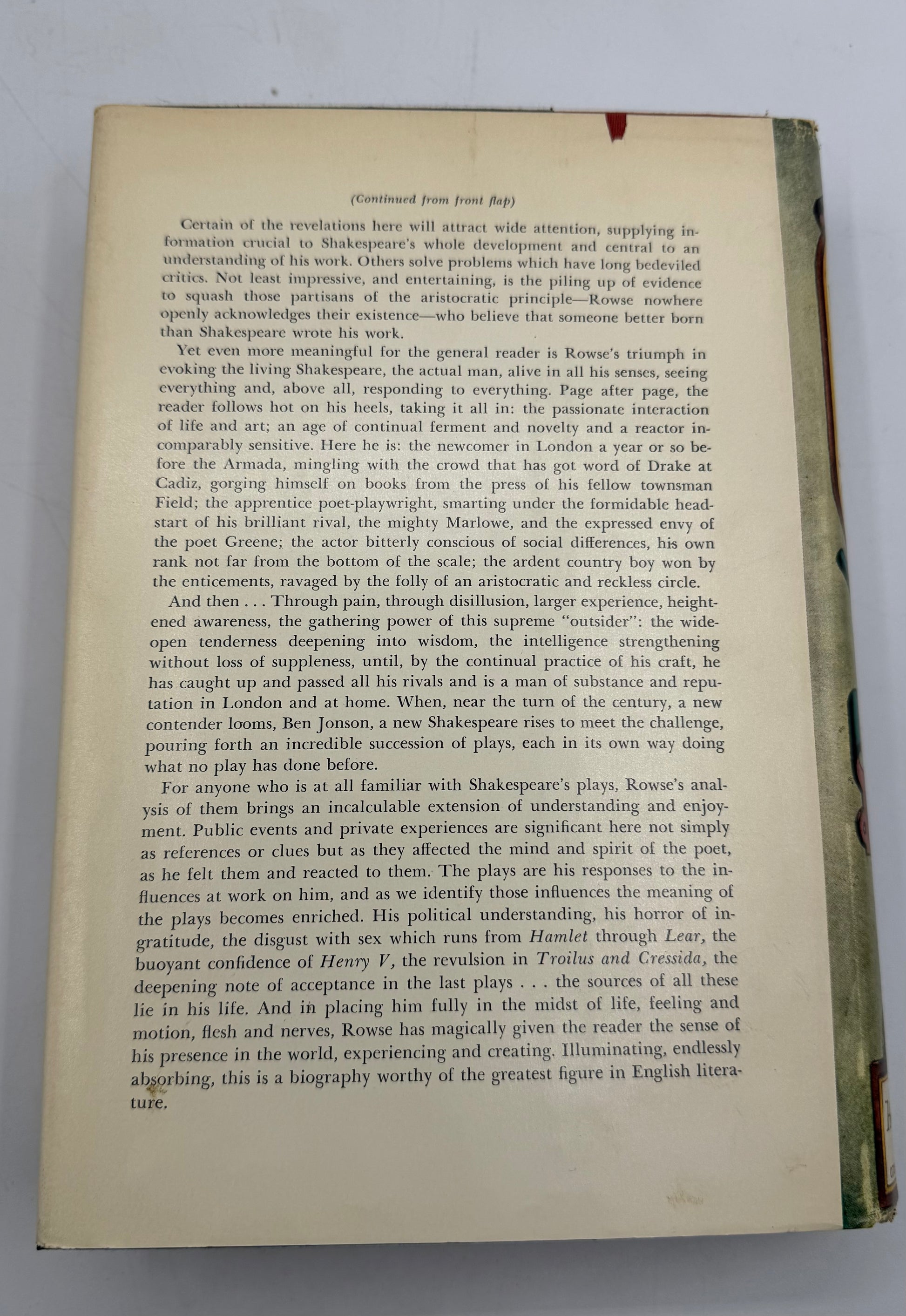 William Shakespeare, A Biography by A L Rowse. Copyright 1963. Published by Harper & Row Publishers, New York with original dust jacket. Includes black and white illustrations and photographs. First Edition. The pages are crisp and lightly toned. The book cover under the dust jacket is very good. 484 pages, size: 9.5"