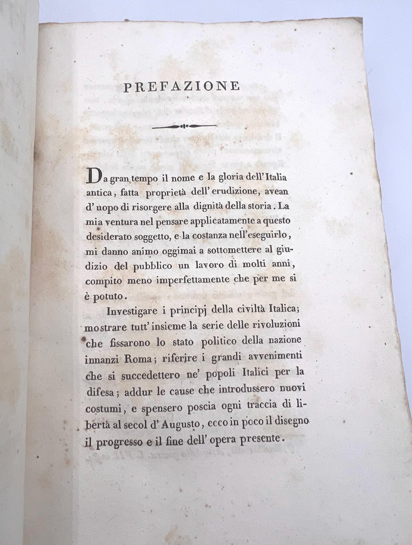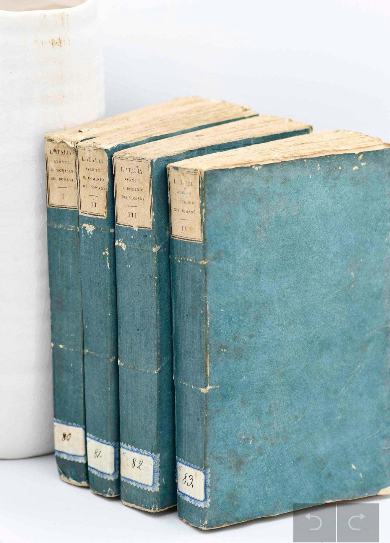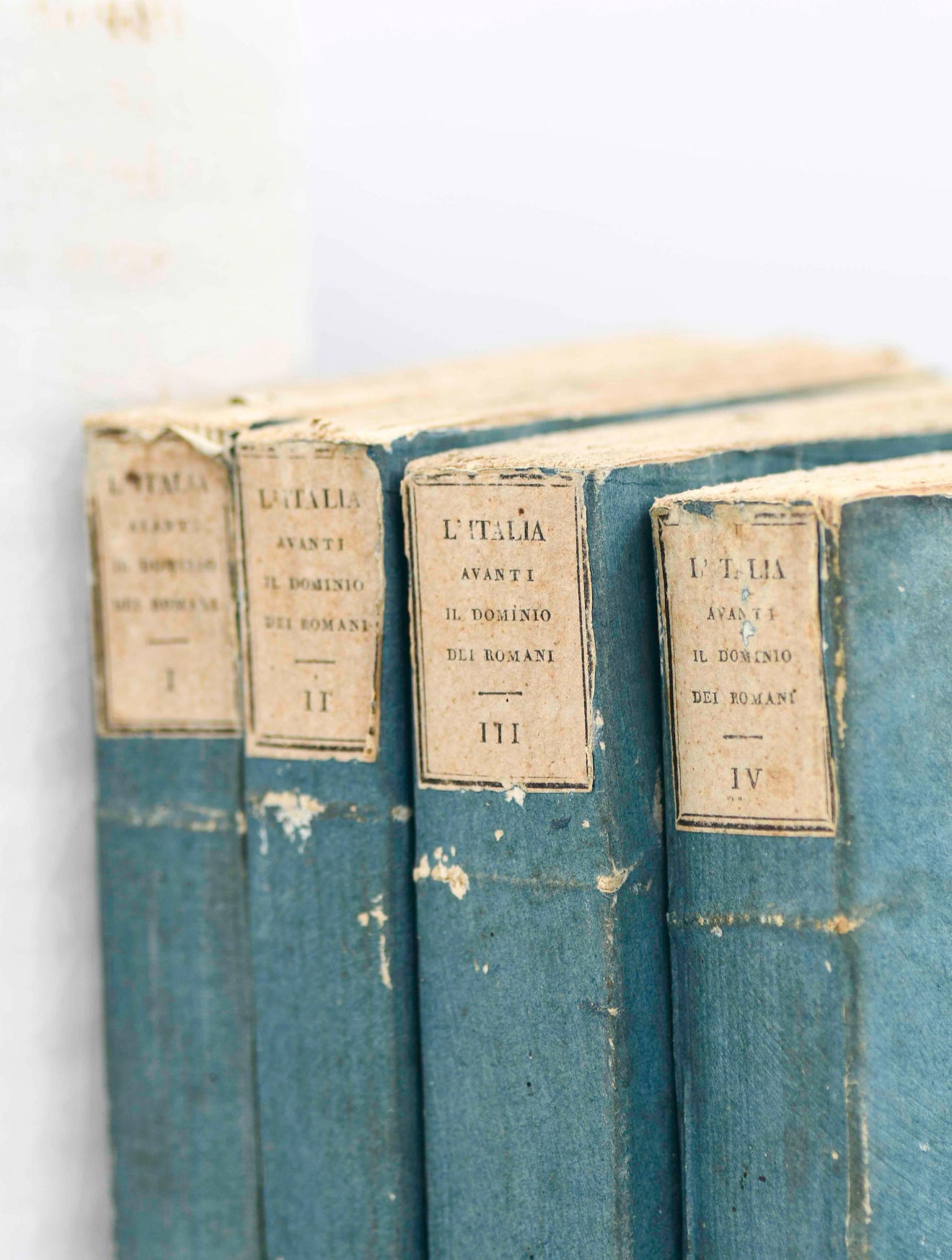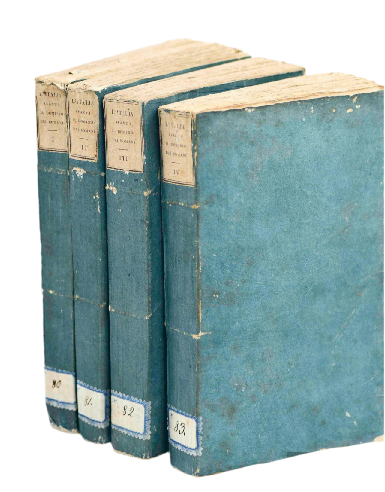 "L'Italia Avanti il Dominio Dei Romani," Volumes 1-4. Copyright 1810. Published by Guglielmo Piatti, Firenze. Italian language. {Title: Italy Ahead of the Domination of the Romans}. Size: 8.75 x 5.75". The covers are dark blue paper wrapped. The cover paper appears painted. There are antique paper labels on the backstrip and paper labels on the lower backstrip with scripted numbers. The back covers match the front covers and are good.